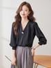 Camisa de satén negra de alta gama con cuello en V para mujer, diseño elegante de otoño, manga farol, camisa sencilla de color sólido con temperamento