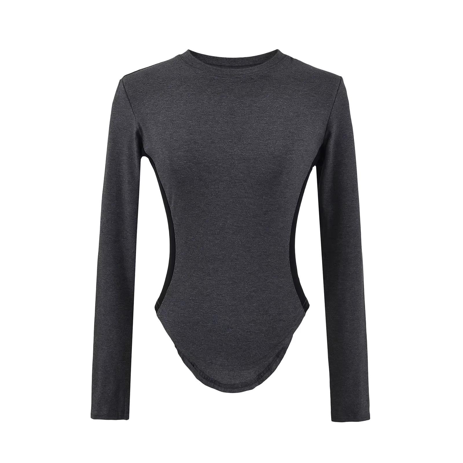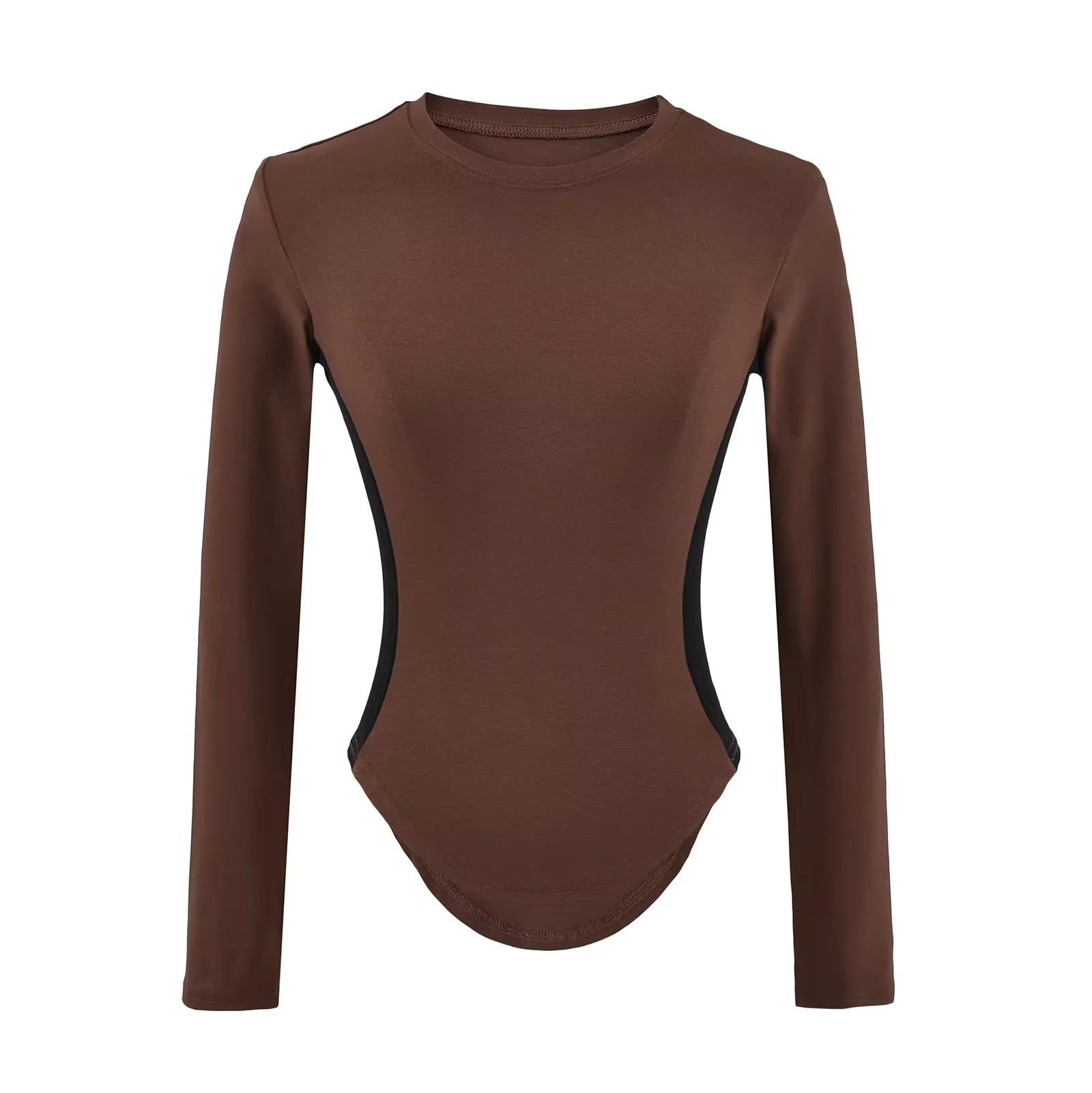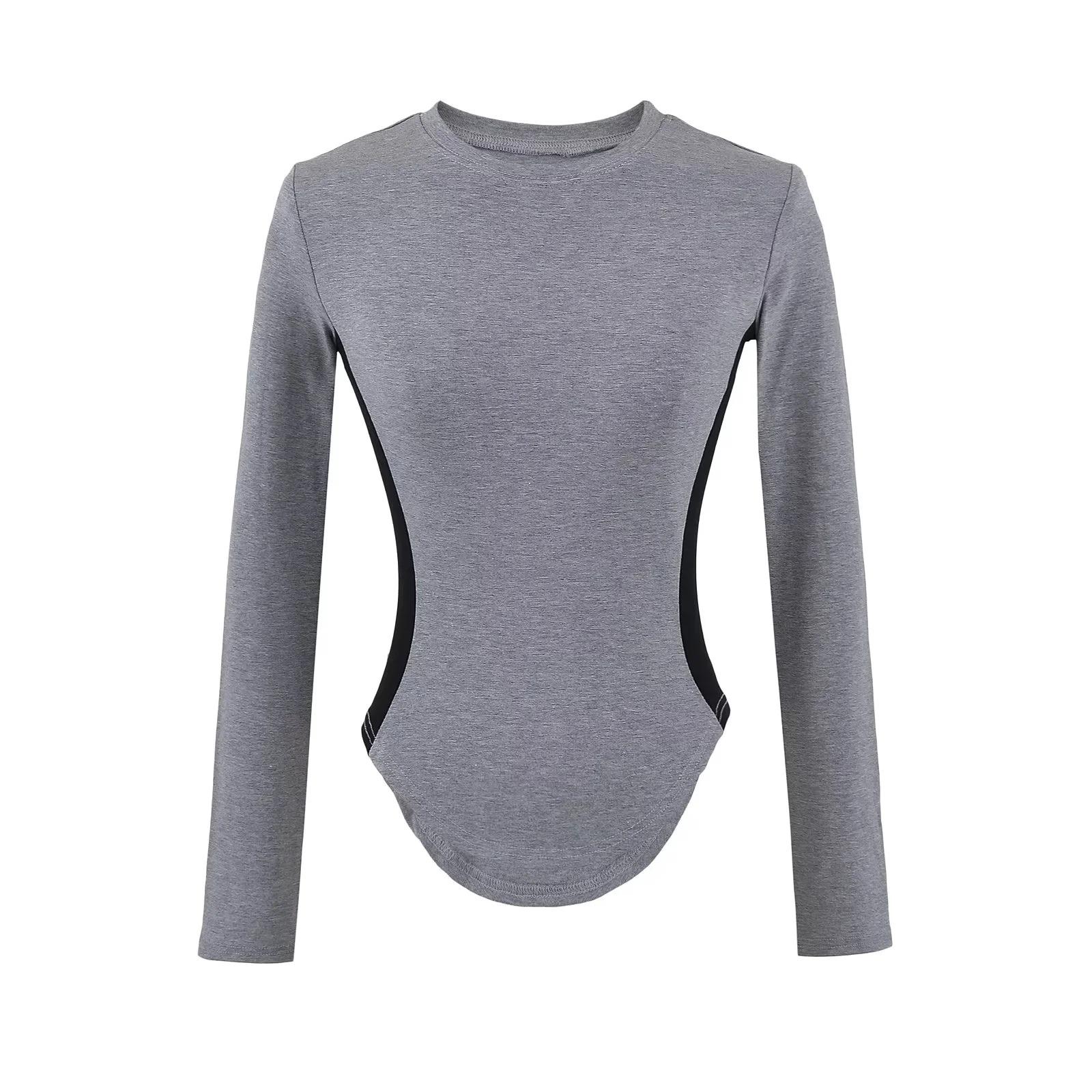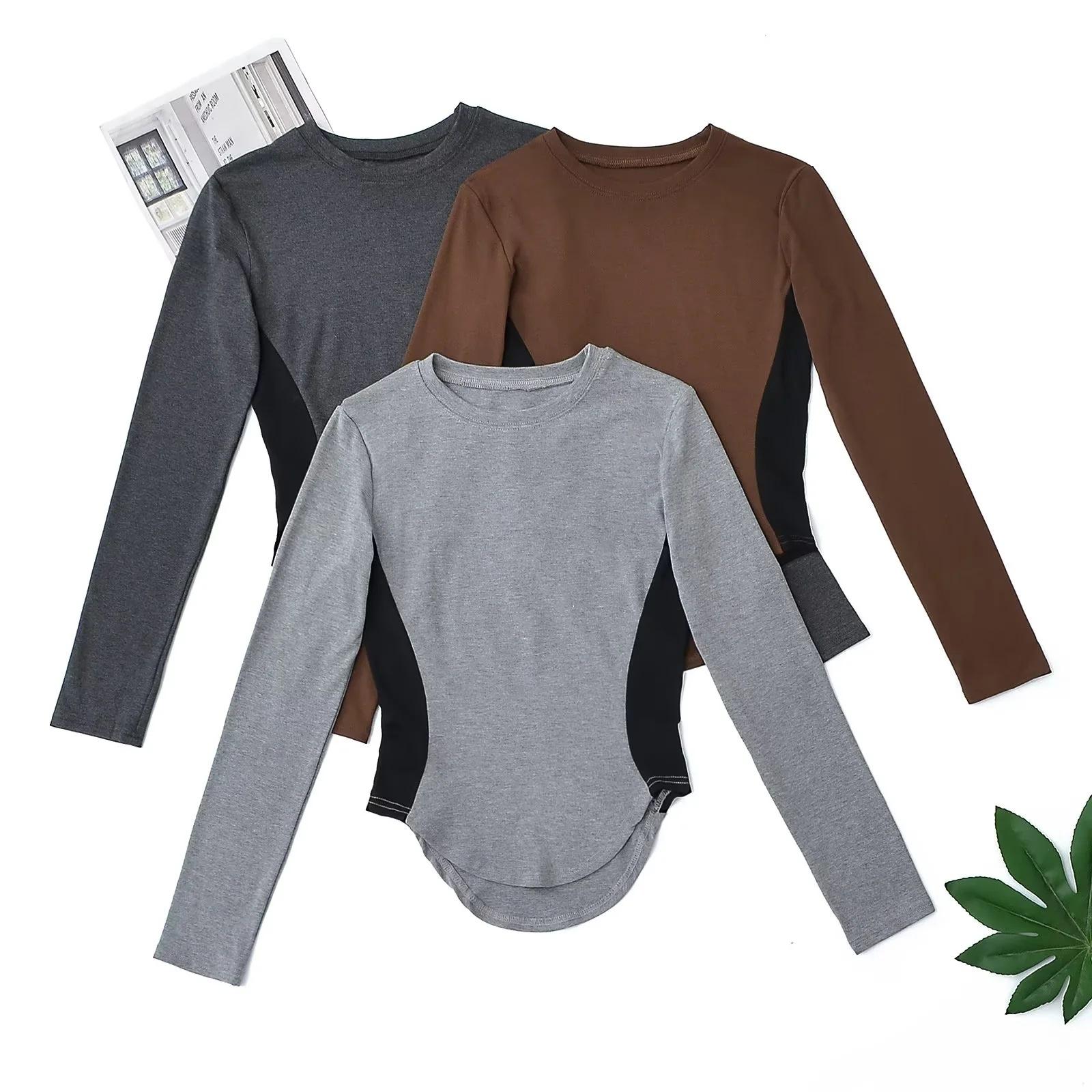 Camiseta Base de Manga Larga con Cuello Redondo Pequeño de Color Contrastante para Chica Hot Diseño de Primavera y Otoño Cintura de Reloj de Arena Sexy Ajustada Top