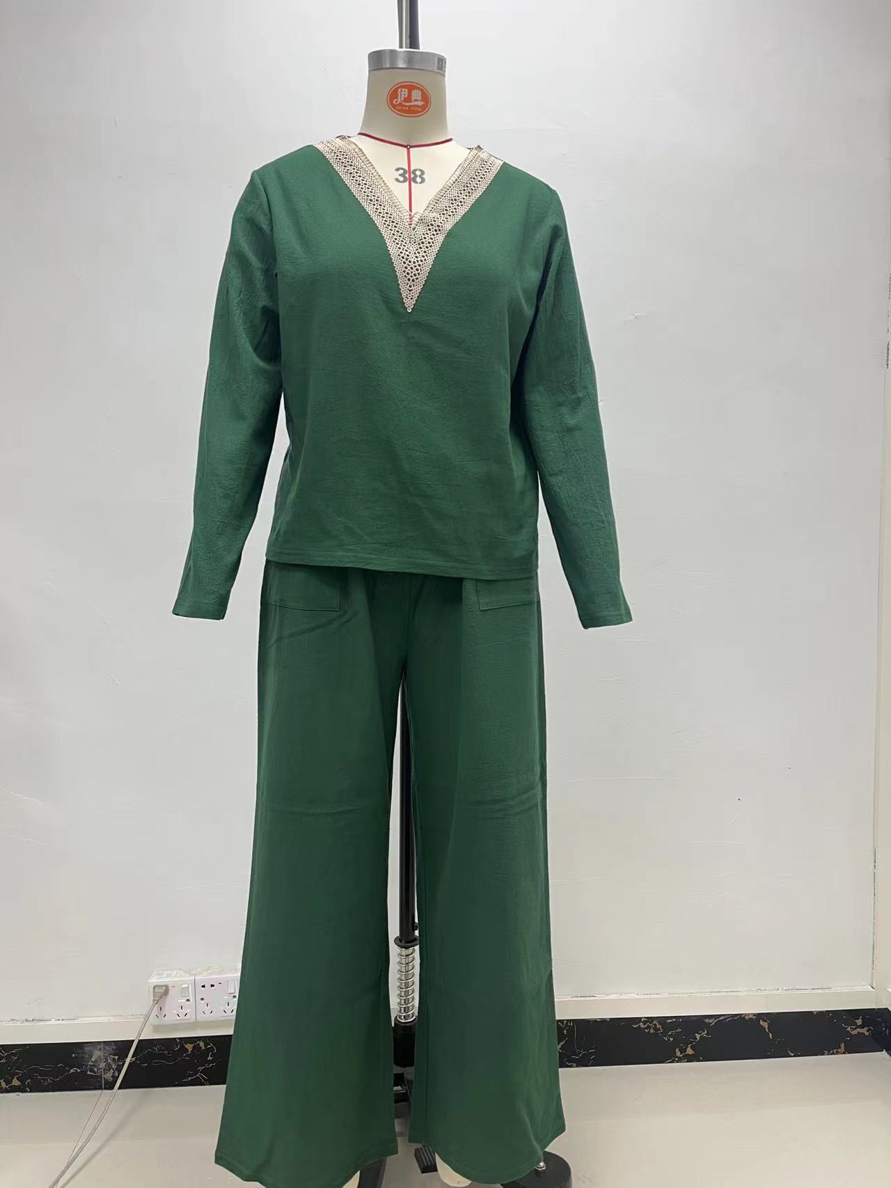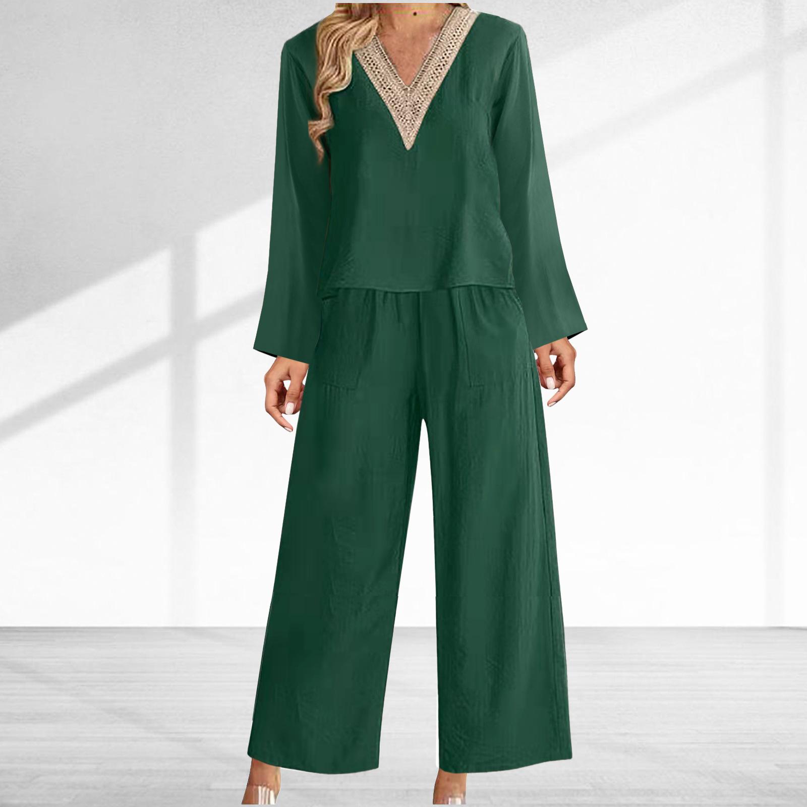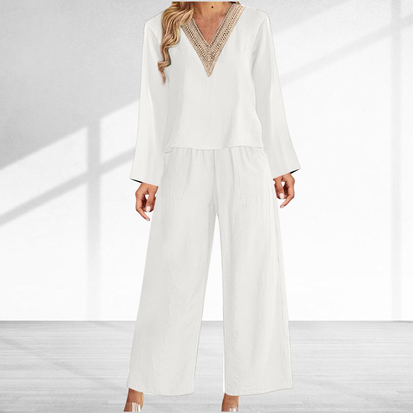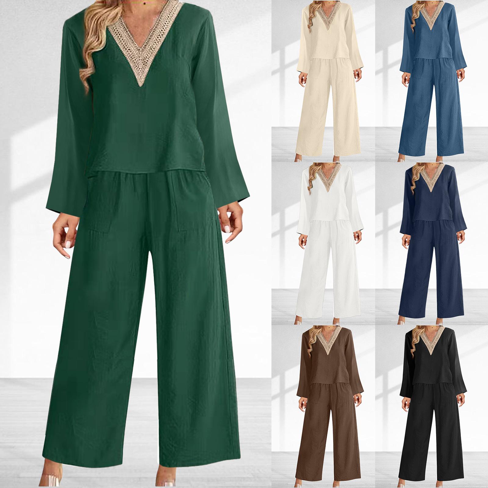 Conjunto de pantalones de manga larga para mujer, estilo informal, de lino y algodón con cuello en V, estilo europeo y americano, 2023
