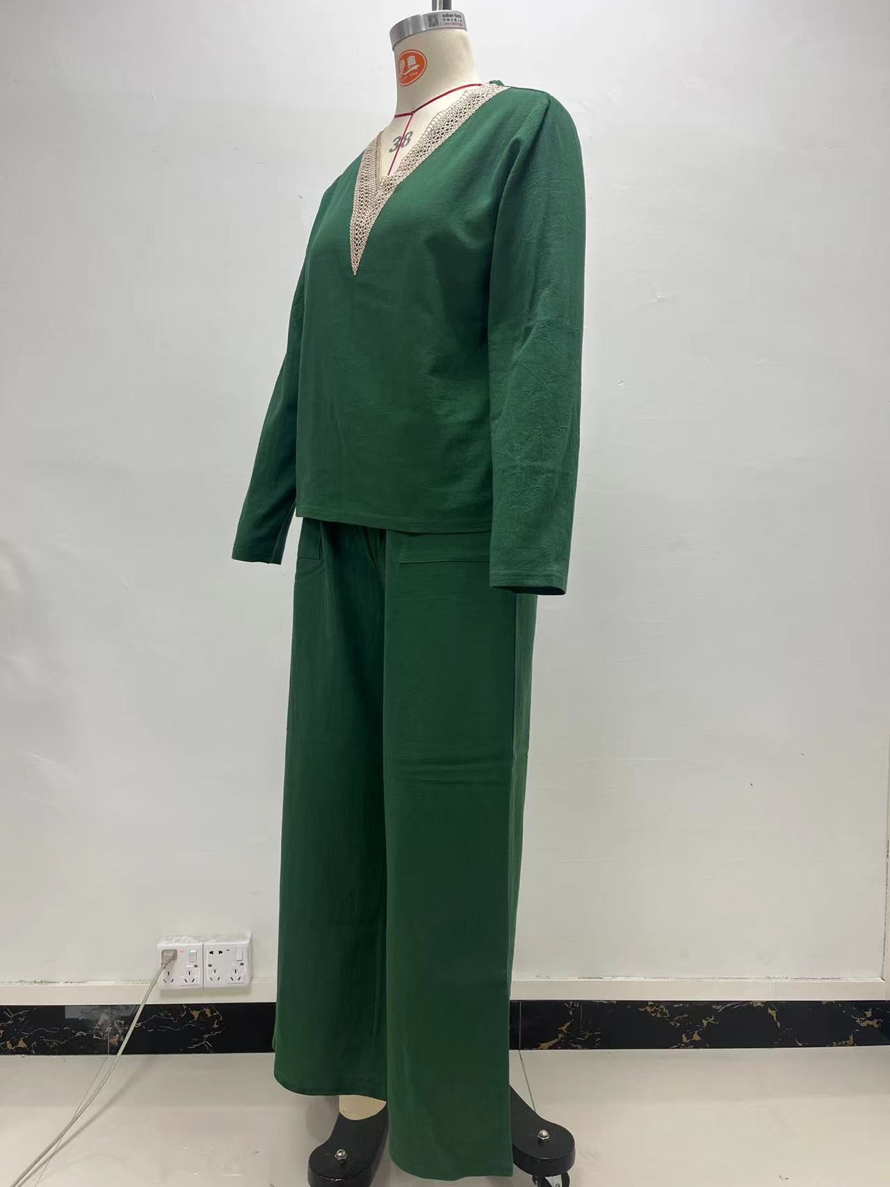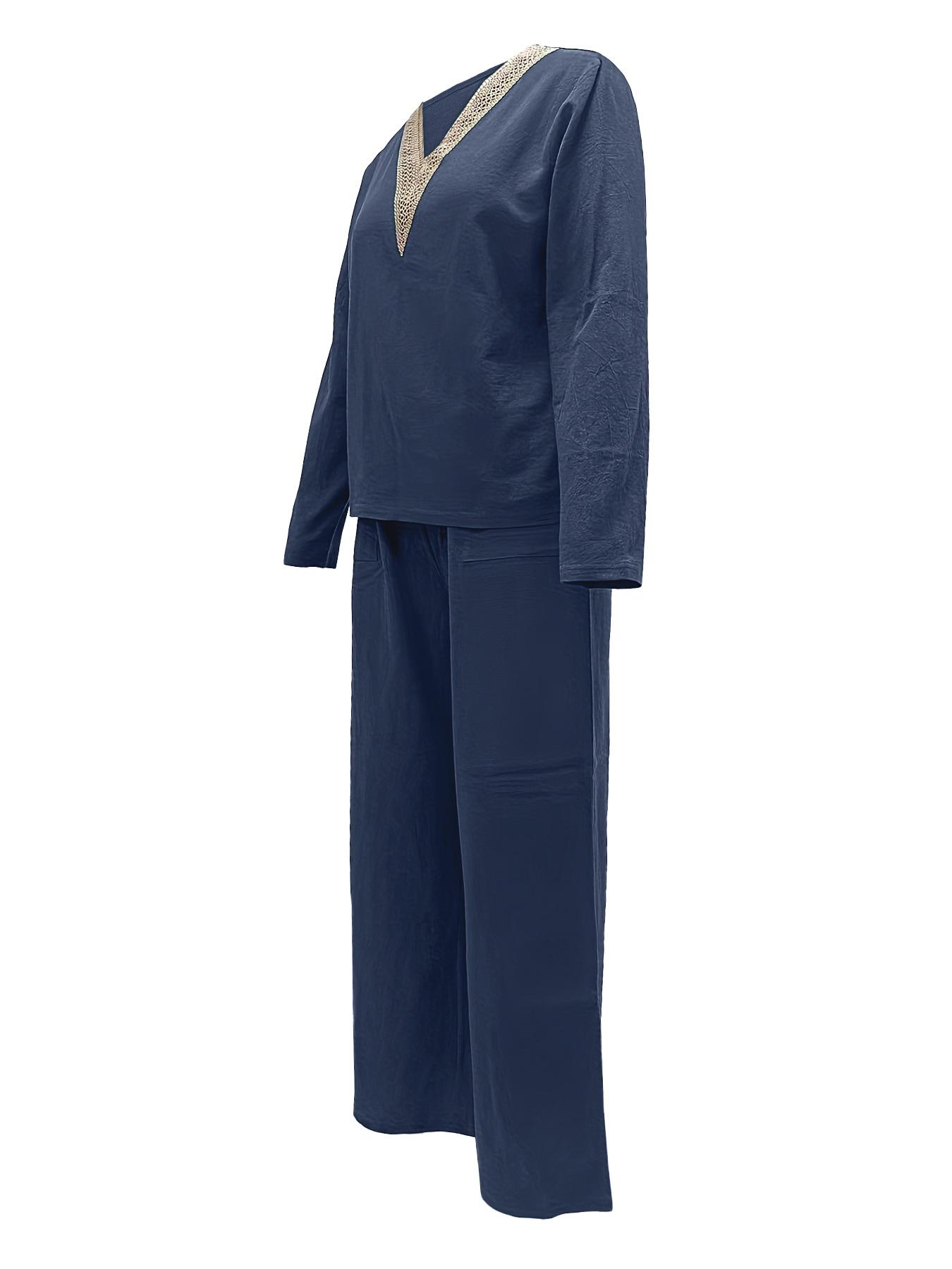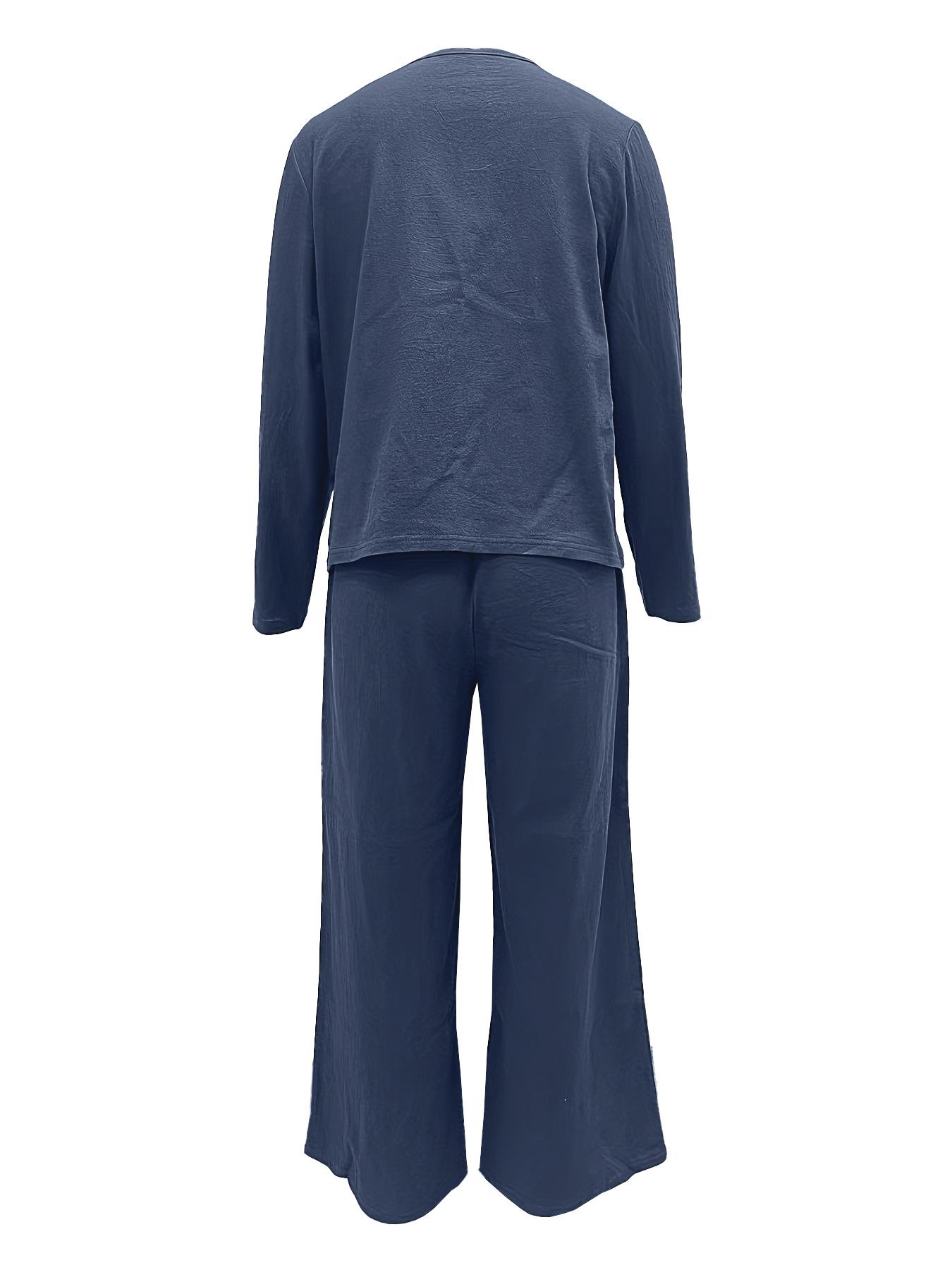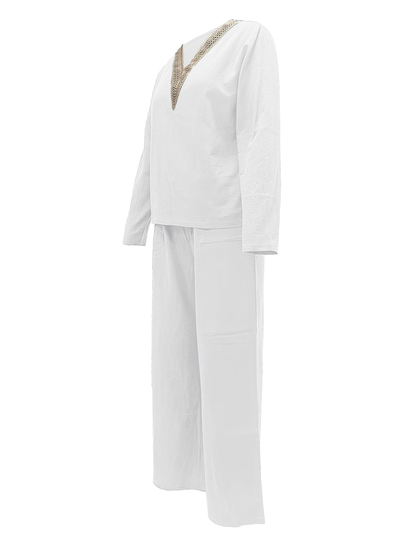 Conjunto de pantalones de manga larga para mujer, estilo informal, de lino y algodón con cuello en V, estilo europeo y americano, 2023