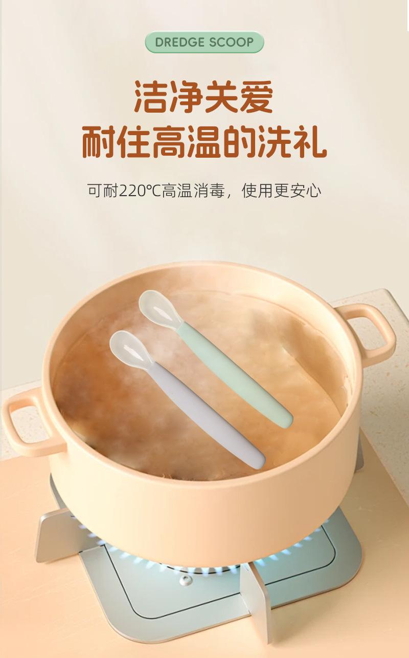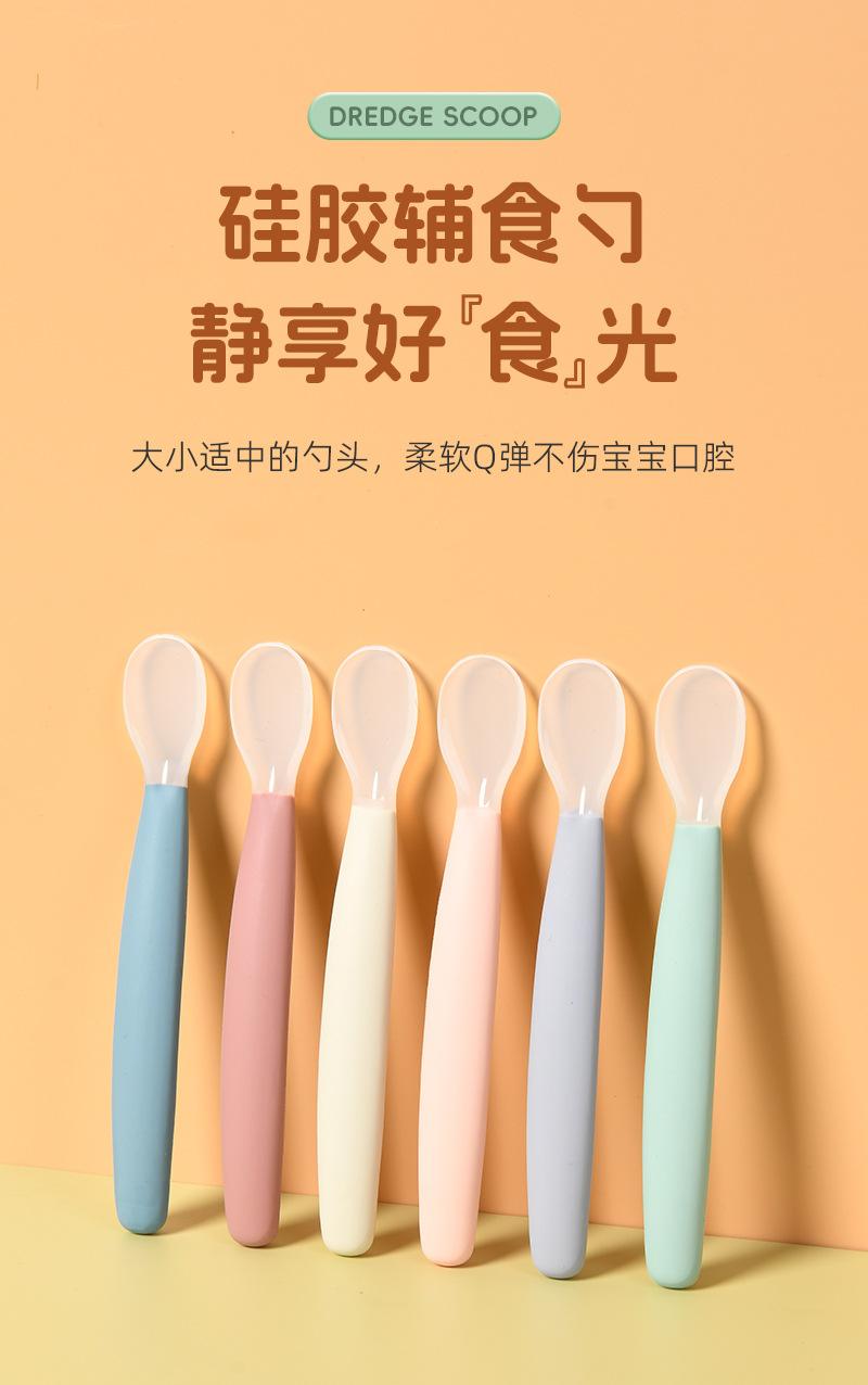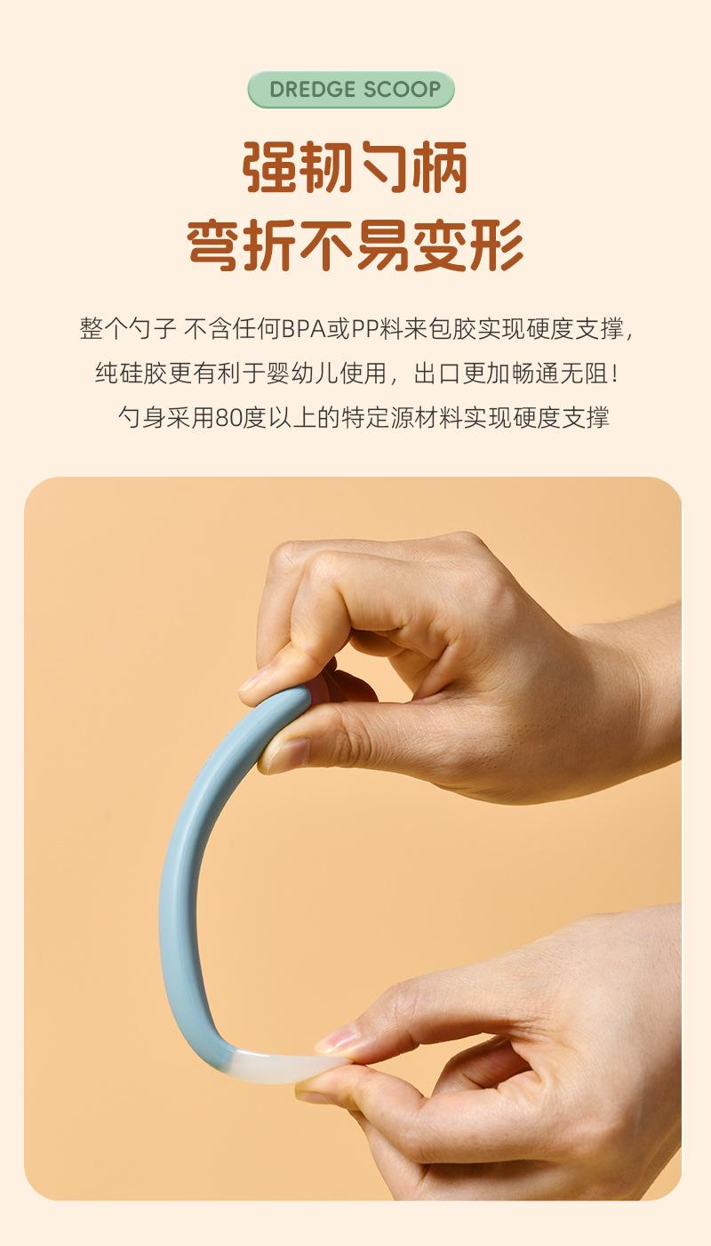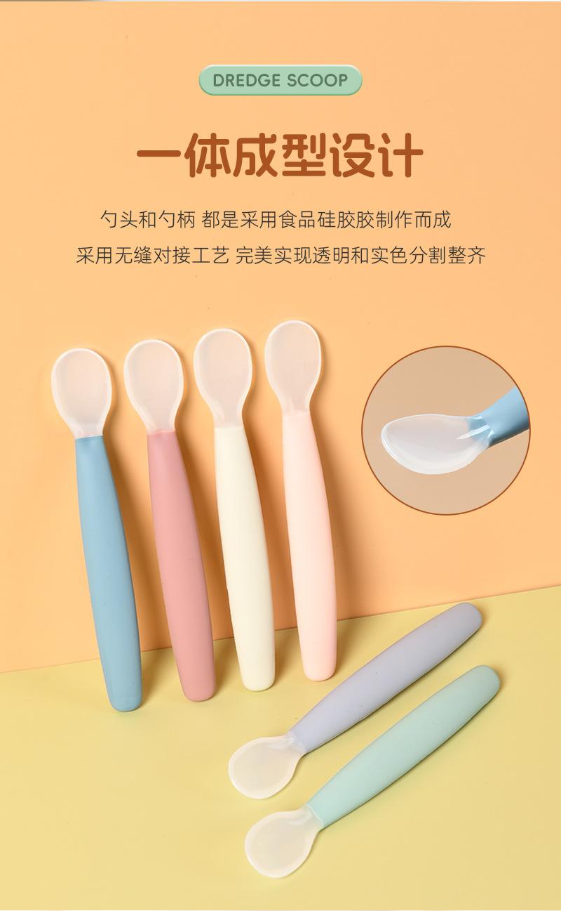 2. La cuchara está libre de BPA y PP, lo que garantiza su dureza. La silicona pura es ideal para bebés y niños pequeños, y su exportación es más sencilla. El cuerpo de la cuchara utiliza un material específico con una dureza superior a 80 grados.