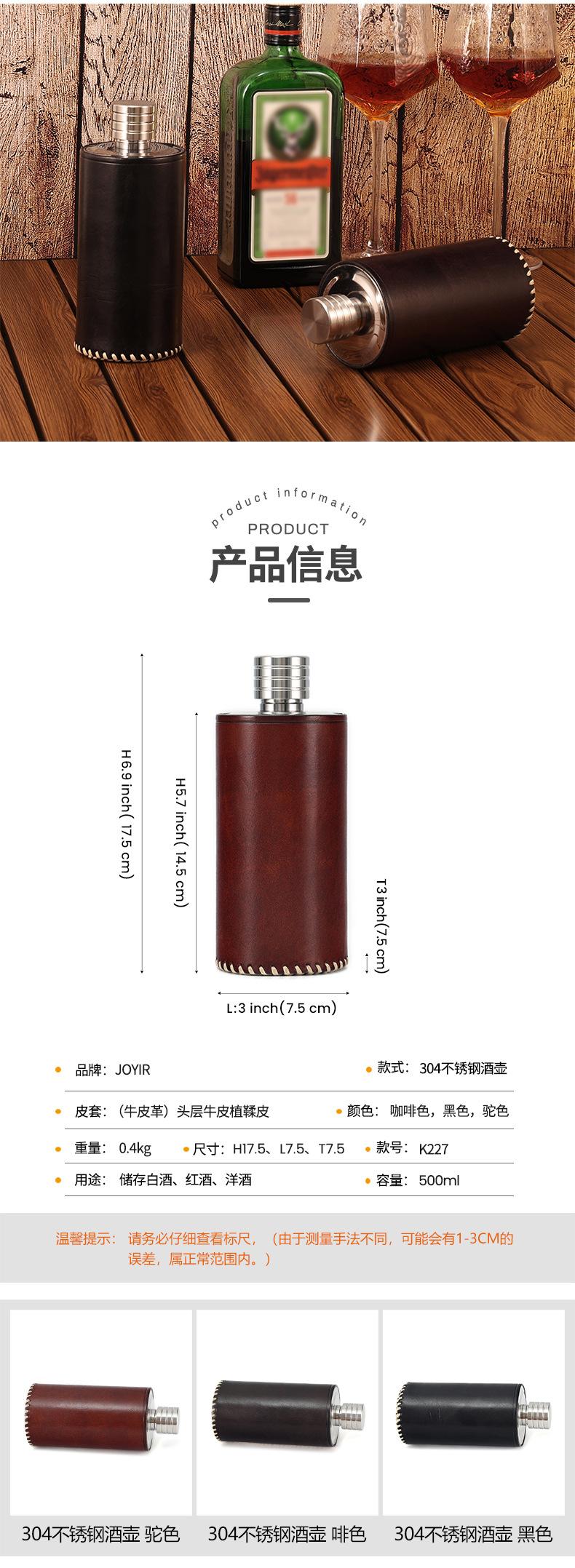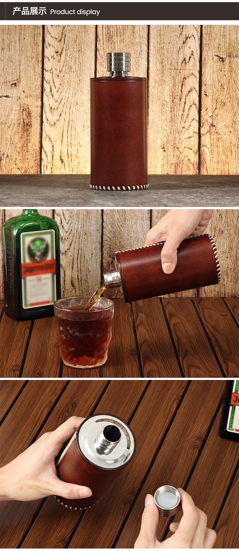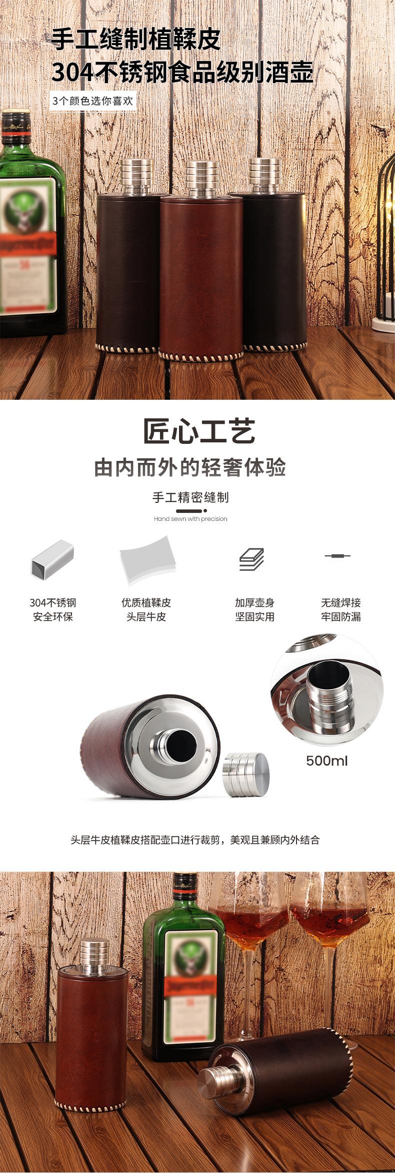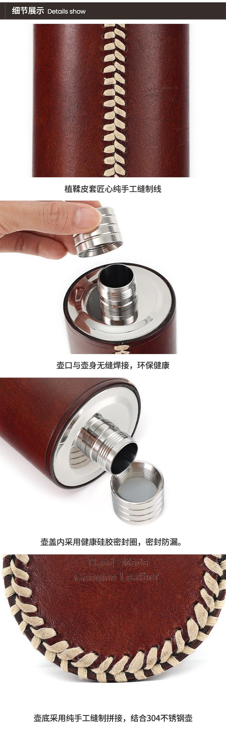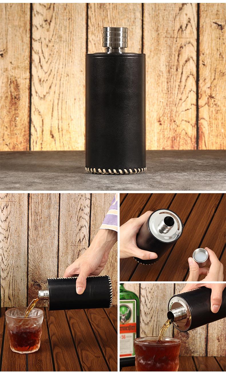 Jarra de vino vintage de cuero curtido vegetal de 500 ml, jarra de almacenamiento de vino de cuero curtido vegetal cosida a mano de acero inoxidable 304, botella de vino