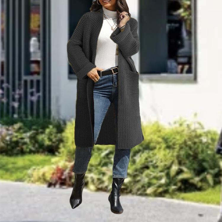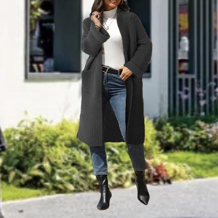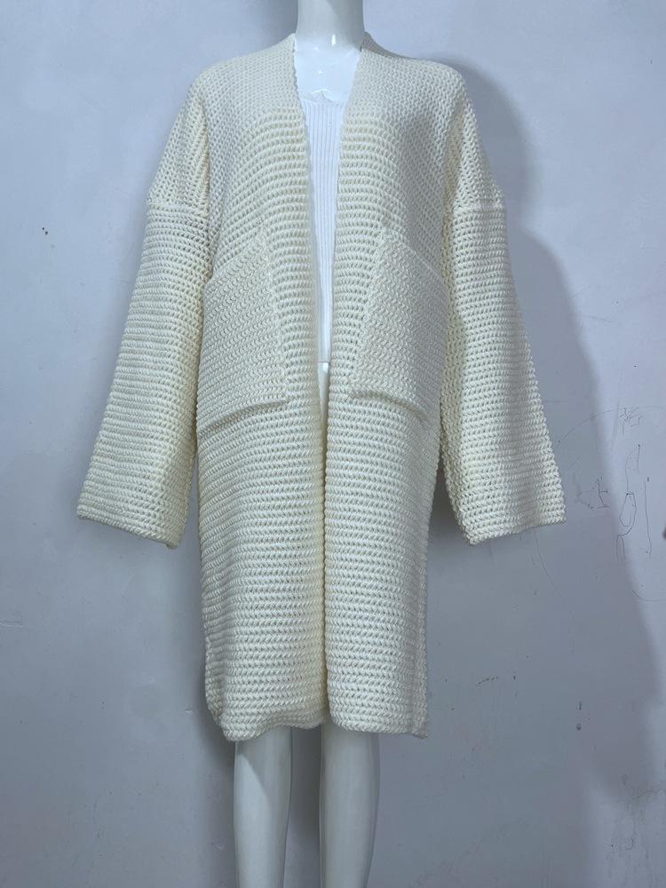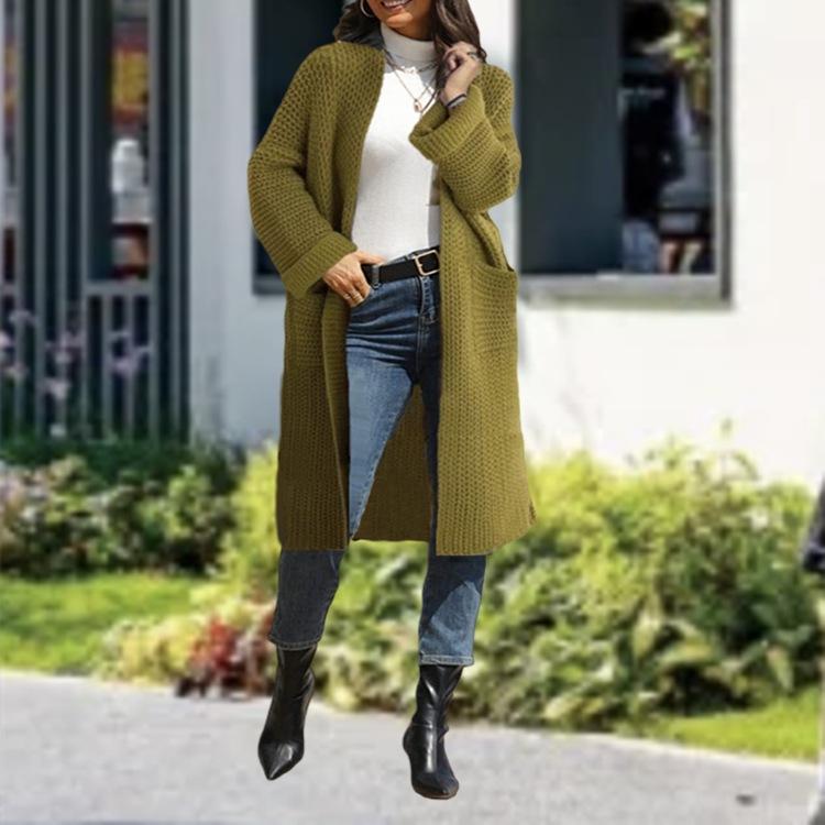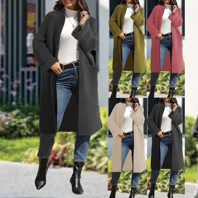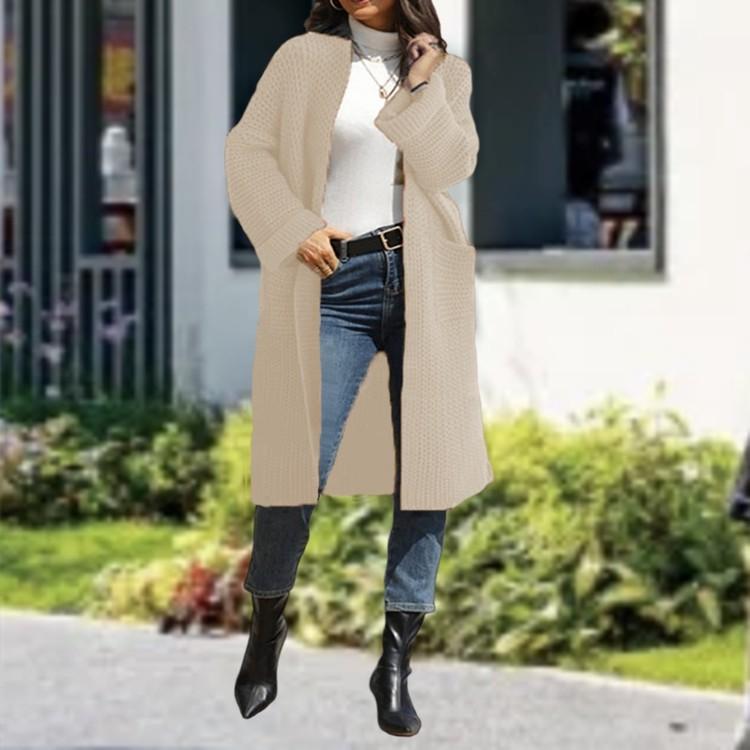 Otoño e Invierno Amazon Transfronterizo Nuevo Cárdigan de Punto para Mujer con Puños Acampanados Ondulados y Bolsillos, Abrigo de Longitud Media, Suéter para Mujer