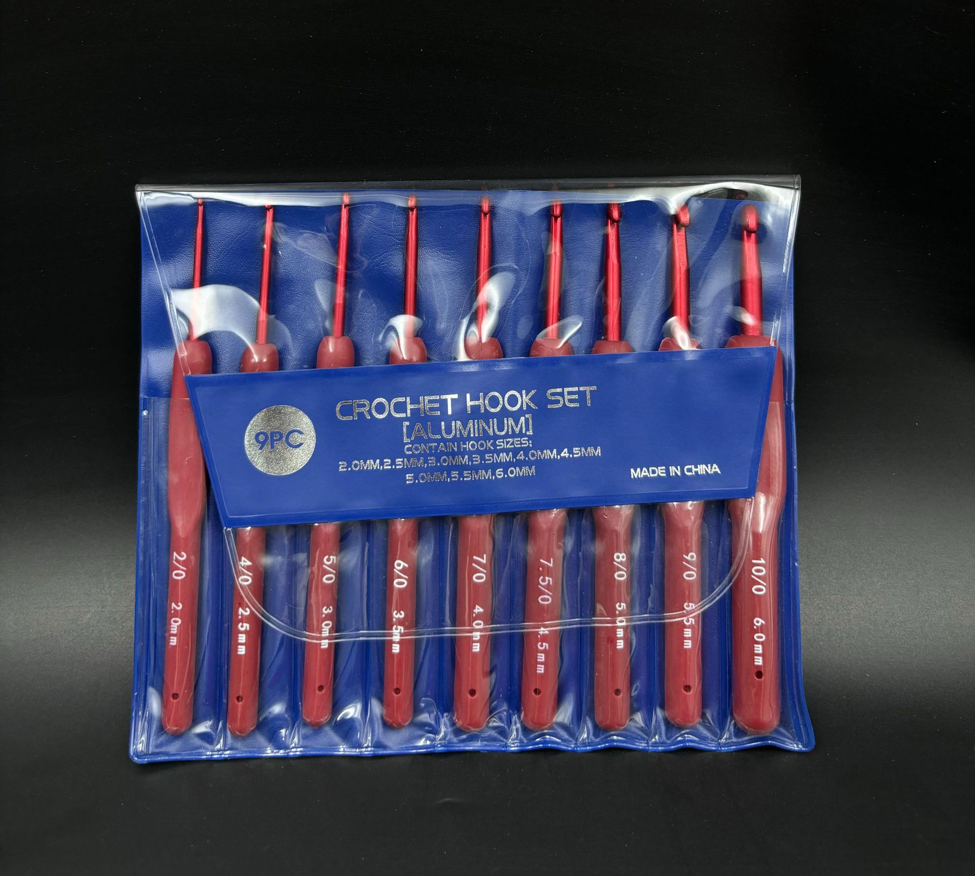 A set of 9 red handle crochet hooks pvc packaging 122.6g, A set of 9 blue handle crochet hooks pvc packaging, ...
