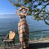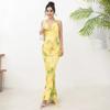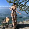 Vestido Francés con Tirantes y Cuello en V para Mujer en Verano, Sexy Estilo Resort Costero con Estampado Empalmado sin Espalda Corte A Vestido Largo de Playa