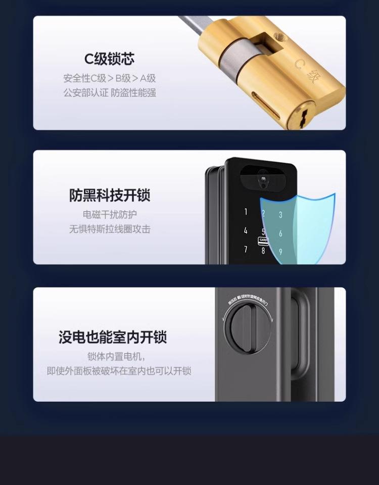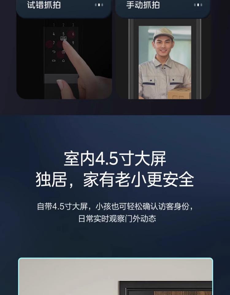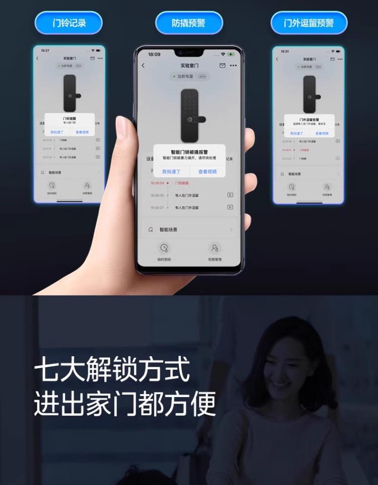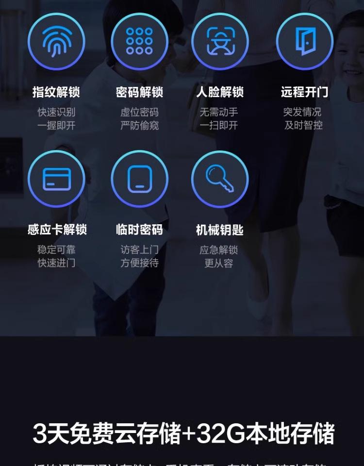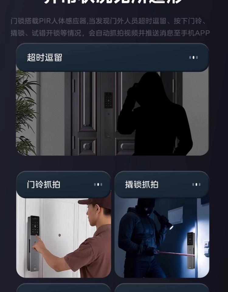 Fingerprint, Password, With key, Visual cat eye, Face recognition, Remote unlock