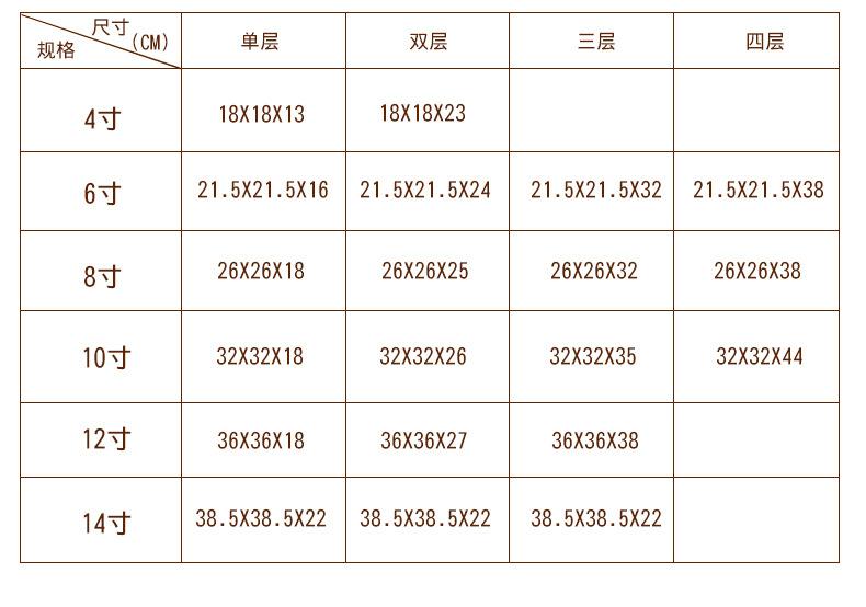 12inch single layer 36x36x18cm, 6inch single layer 22x22x16cm, 6inch double layer 22x22x24cm, 8inch single lay...
