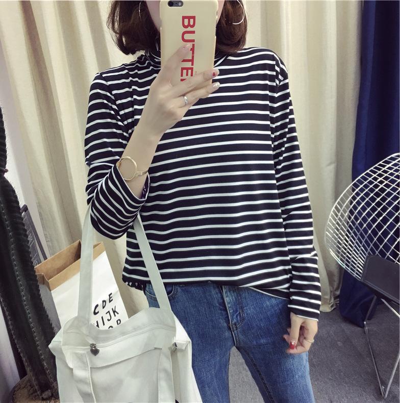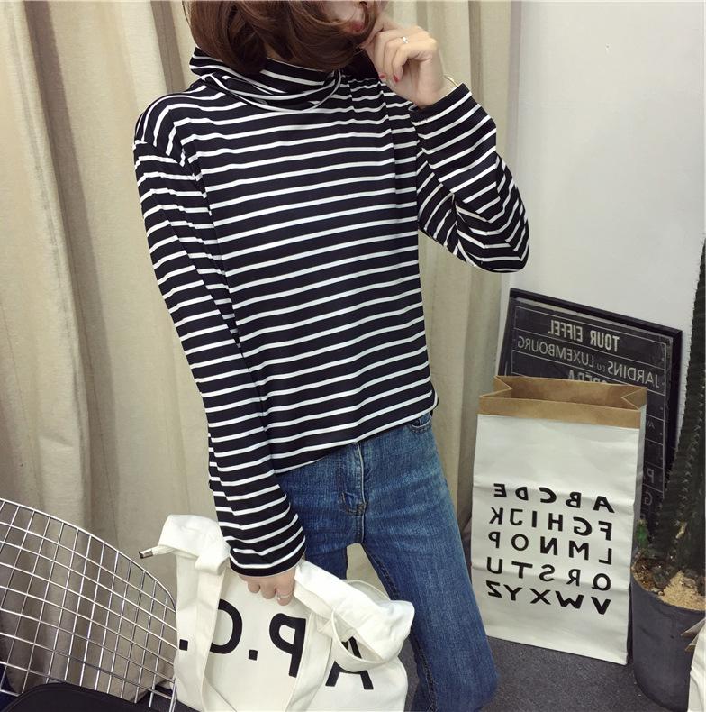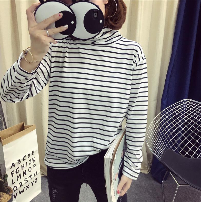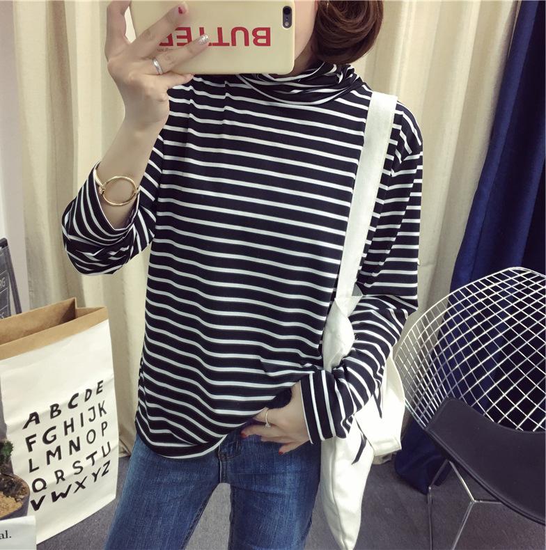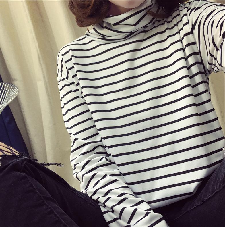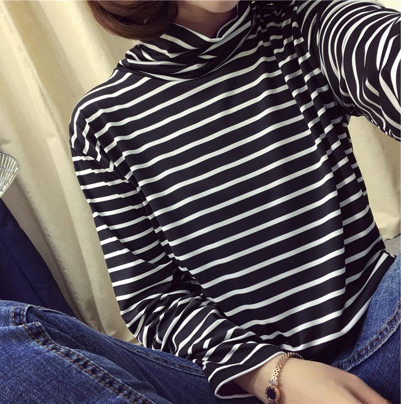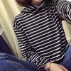 Playera de Manga Larga para Mujer Estilo Coreano con Rayas Playera Básica de Cuello Alto Protector de Cuello para Primavera y Otoño Playera de Manga Larga para Mujer Estilo Holgado