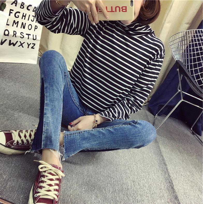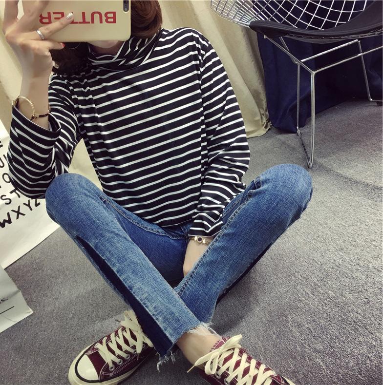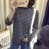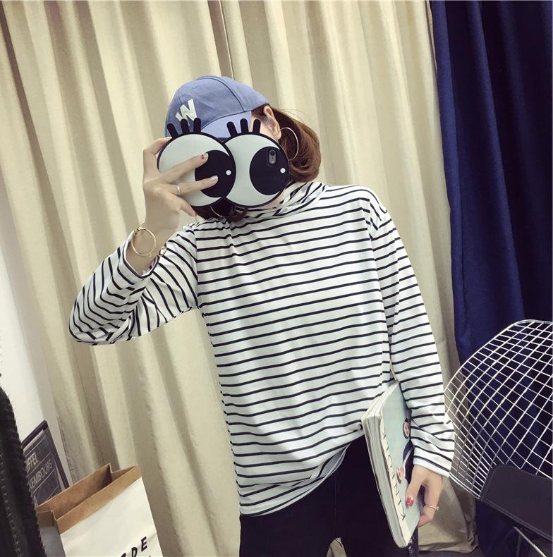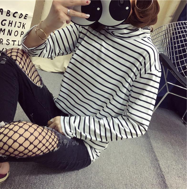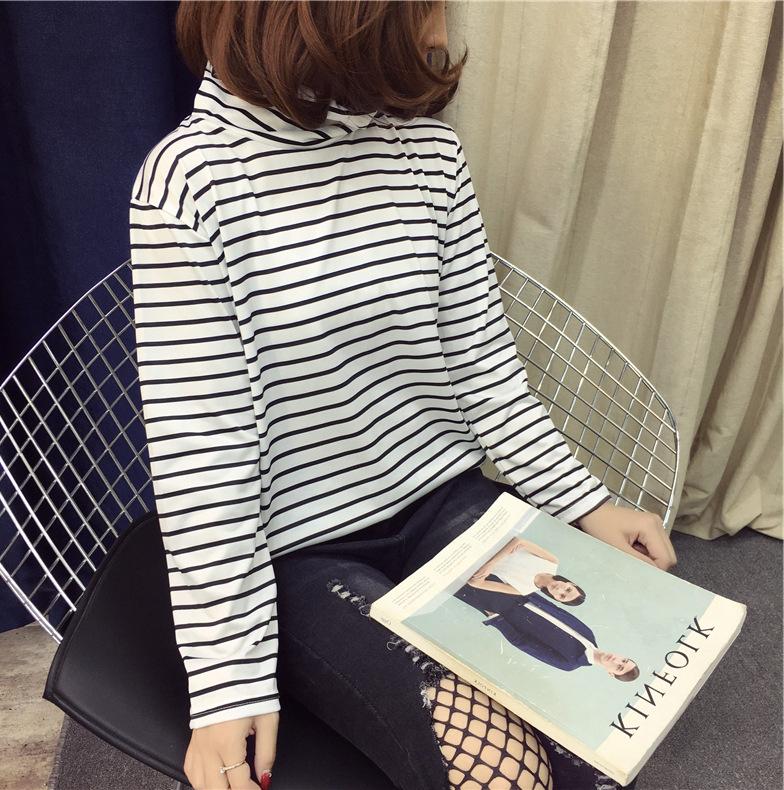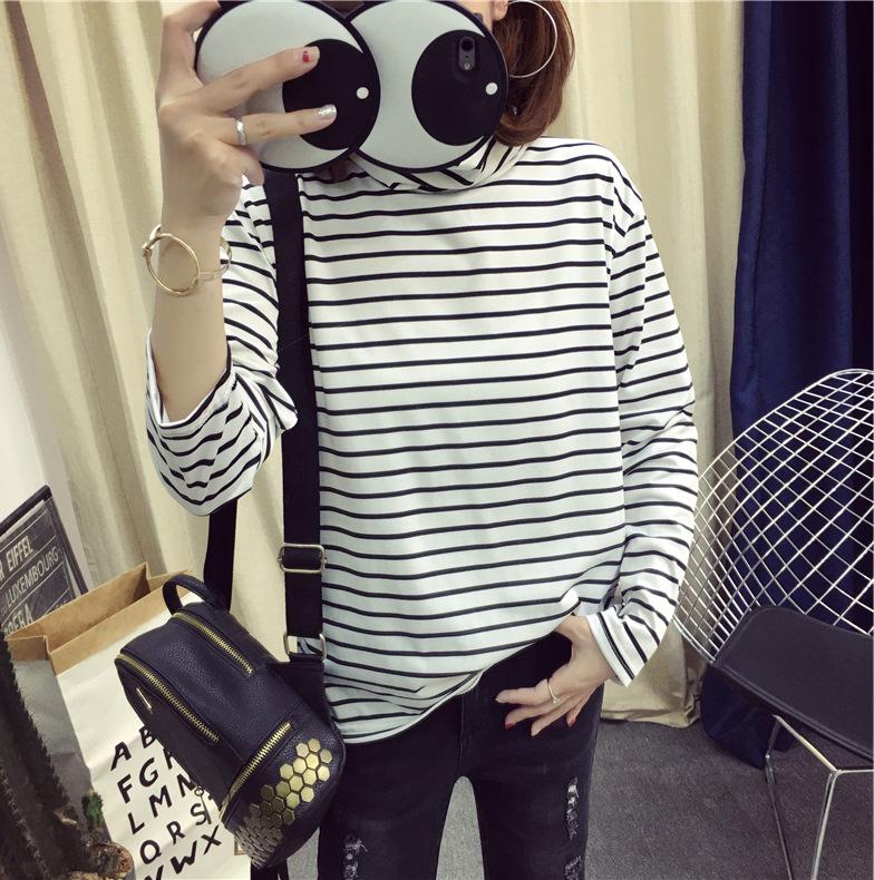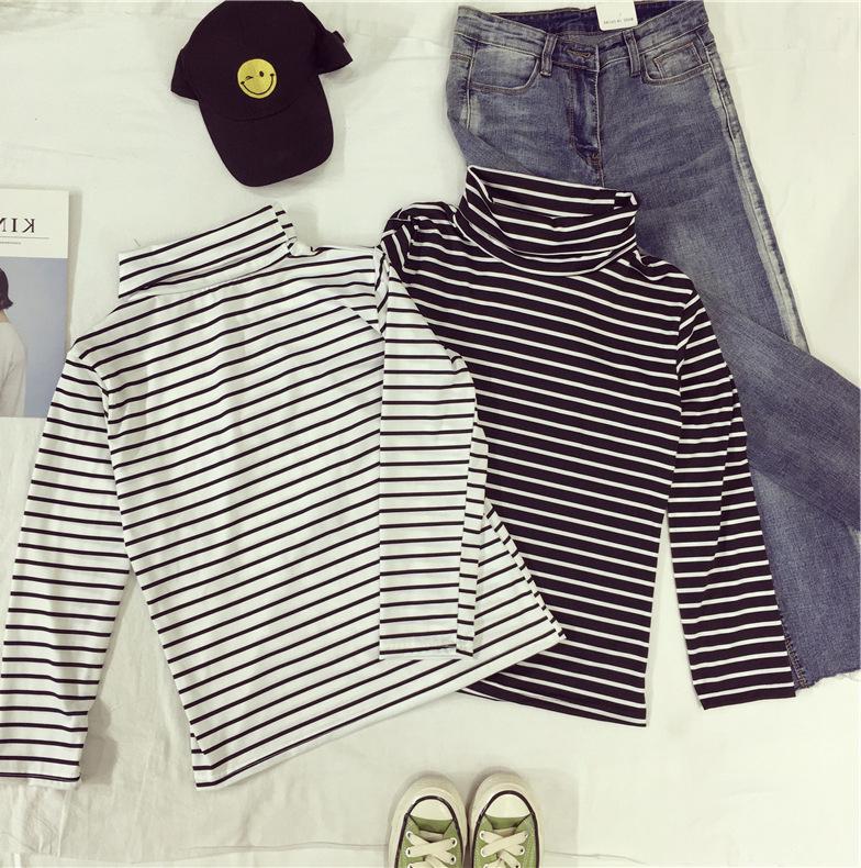 Playera de Manga Larga para Mujer Estilo Coreano con Rayas Playera Básica de Cuello Alto Protector de Cuello para Primavera y Otoño Playera de Manga Larga para Mujer Estilo Holgado