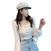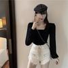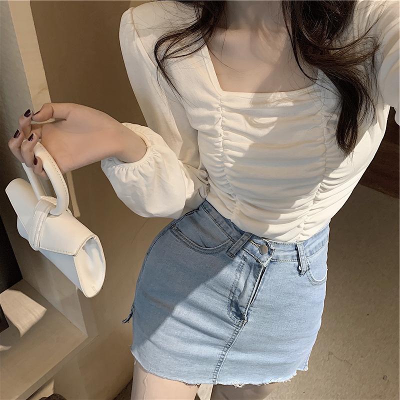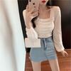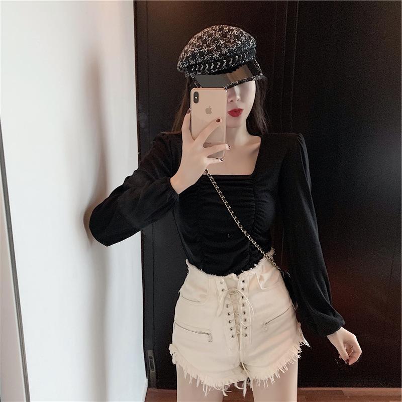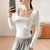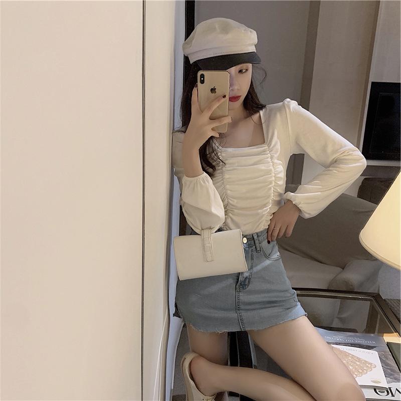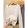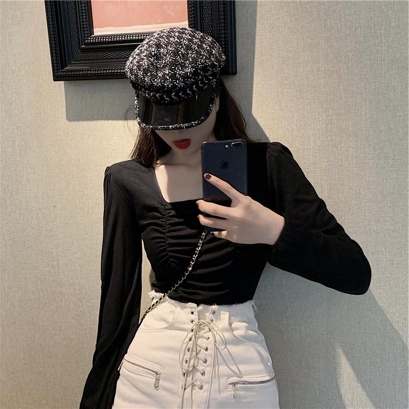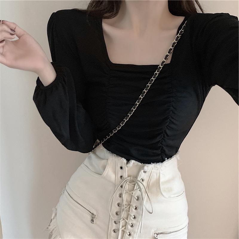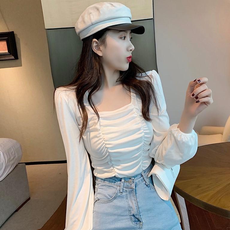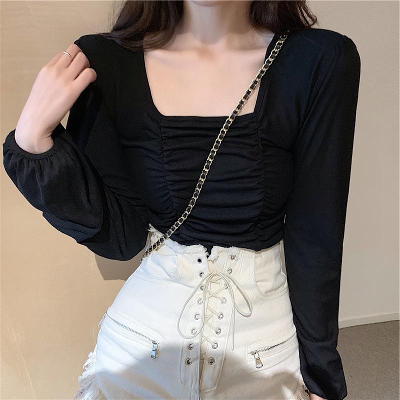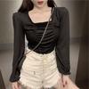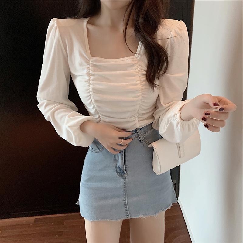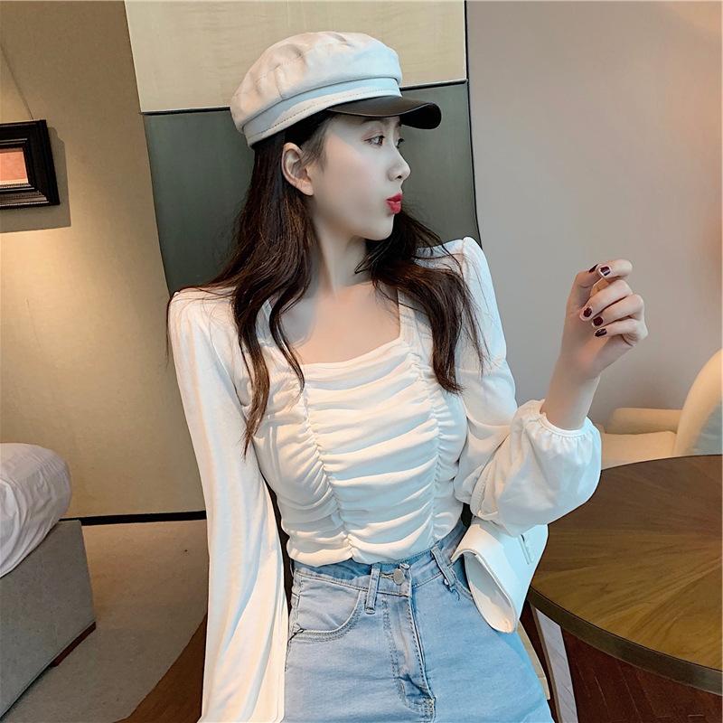 Nueva camiseta de algodón para mujer, camiseta de manga larga con cuello cuadrado y clavícula, estilo coreano, camiseta ajustada con base plisada, top de color liso, moda de otoño e invierno.