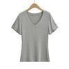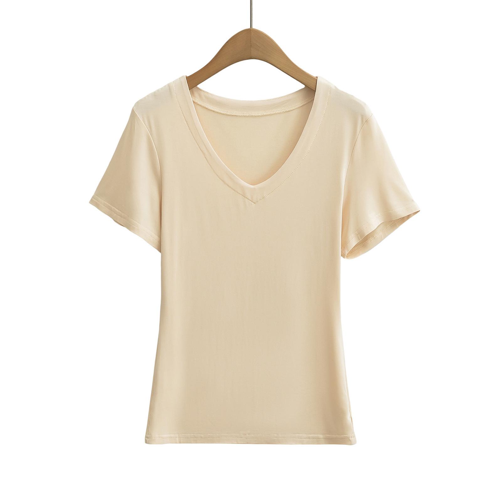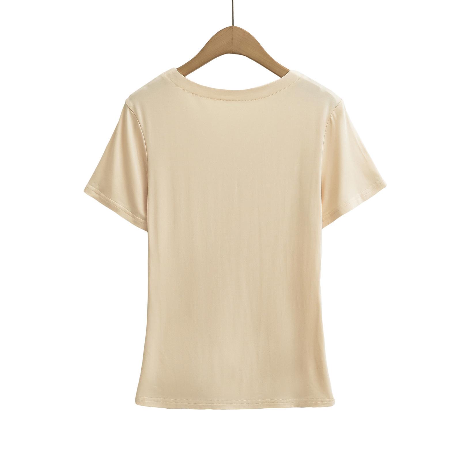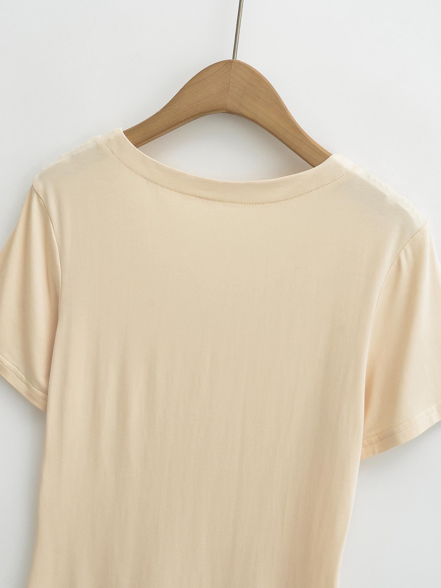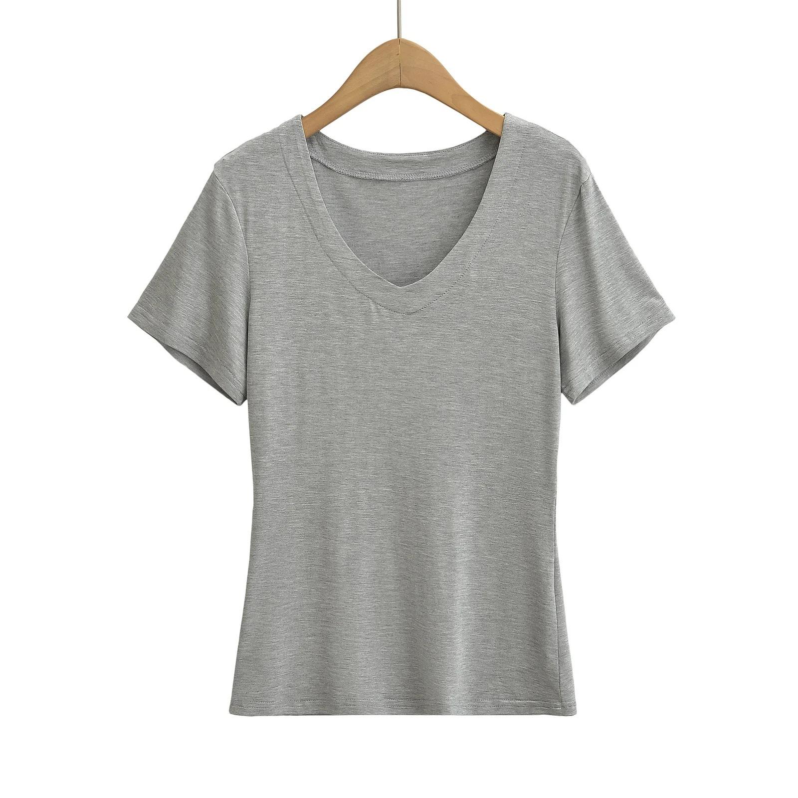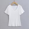 Camiseta de manga corta ajustada con cuello en V y hombros descubiertos para mujer, sencilla y atractiva, de verano, con un solo color liso.