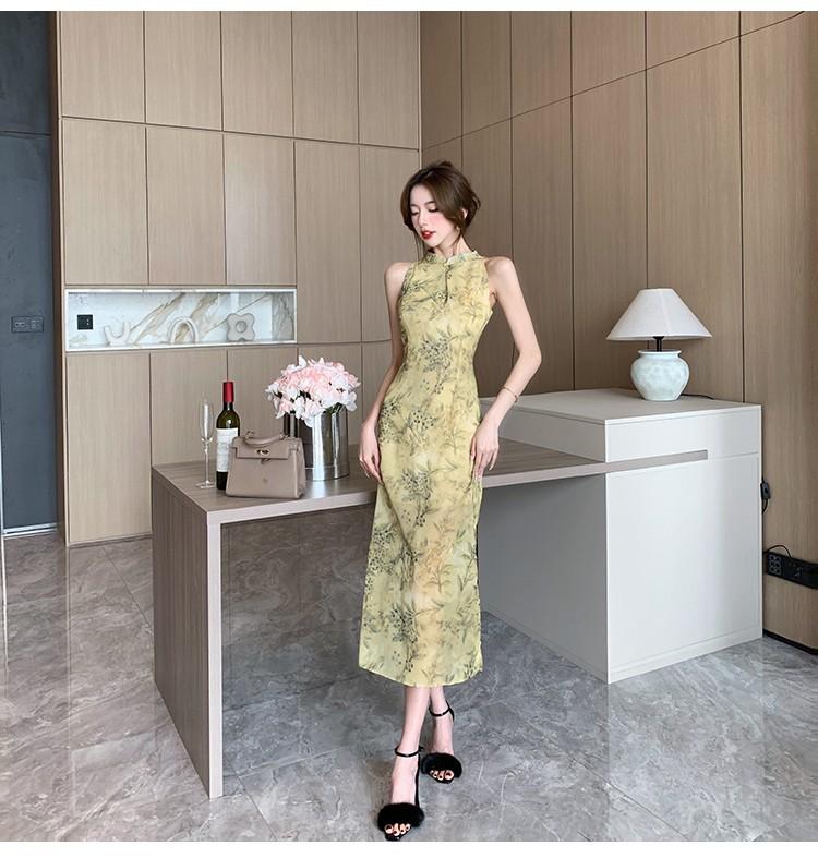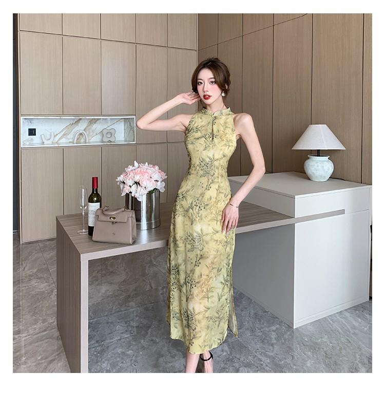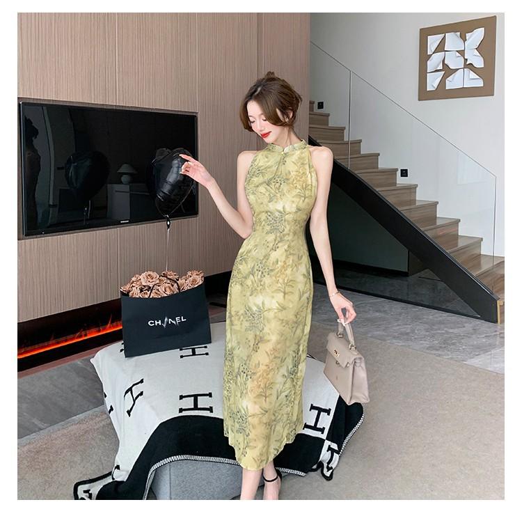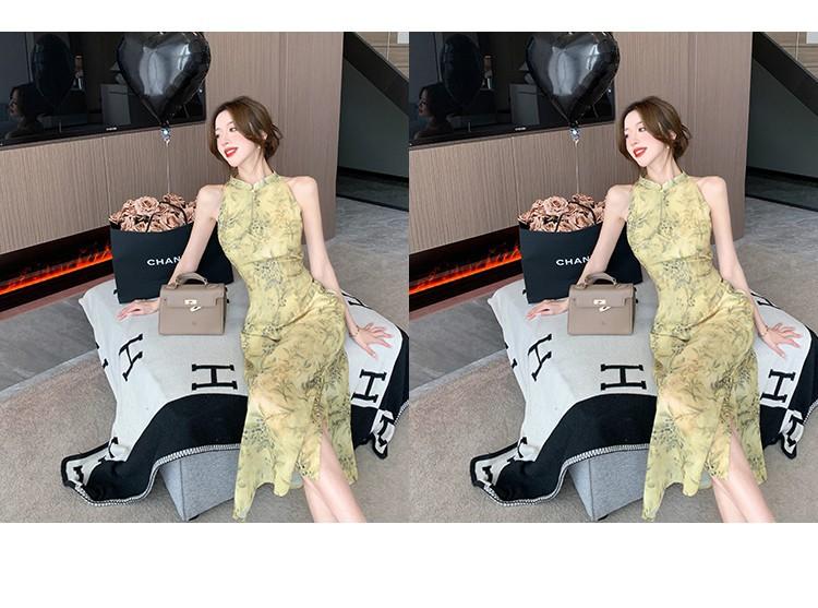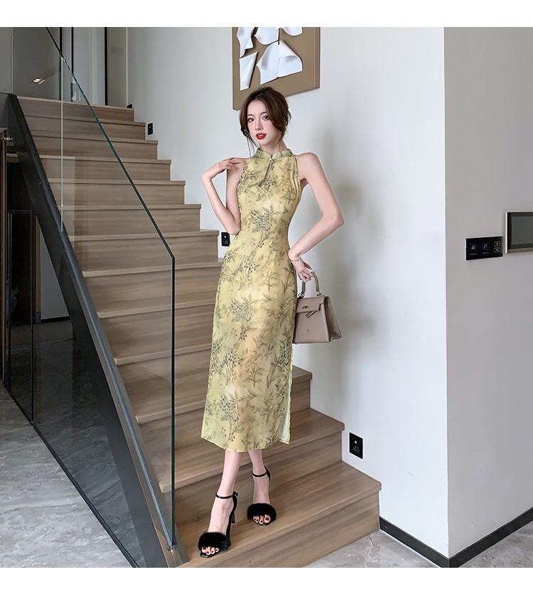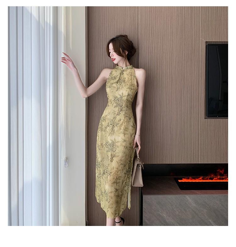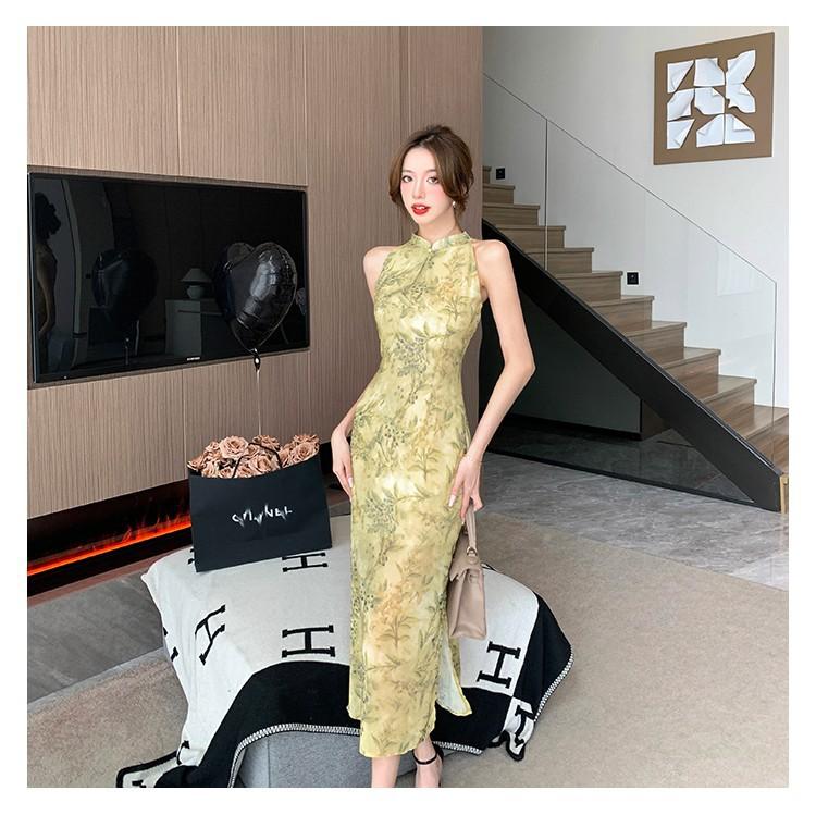 Elegante vestido cheongsam de gasa con estampado de alta sociedad, ajustado y sexy, con escote tipo chaleco y abertura, 2023