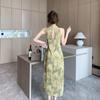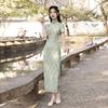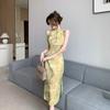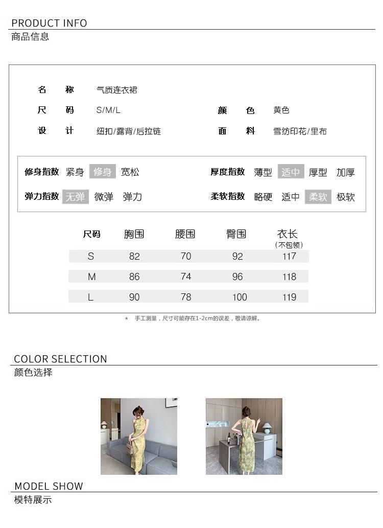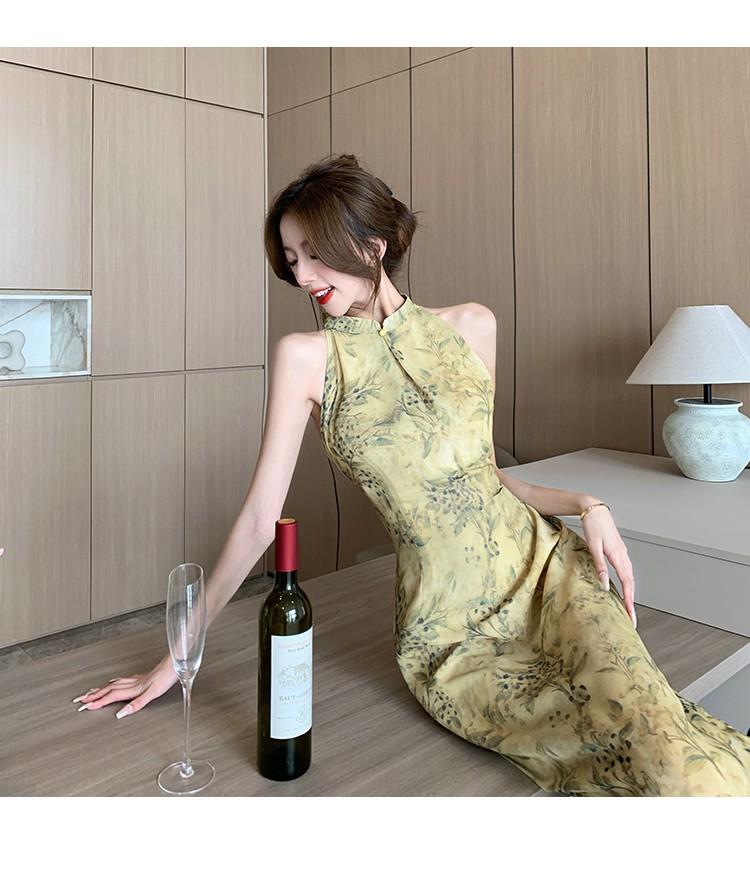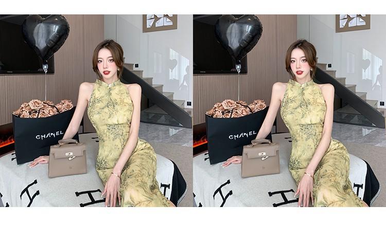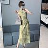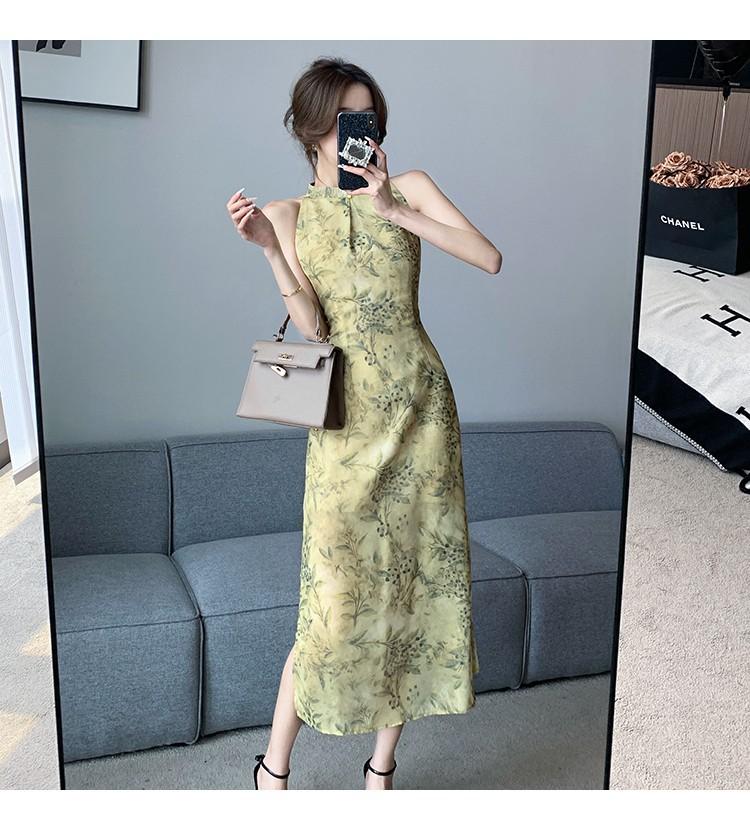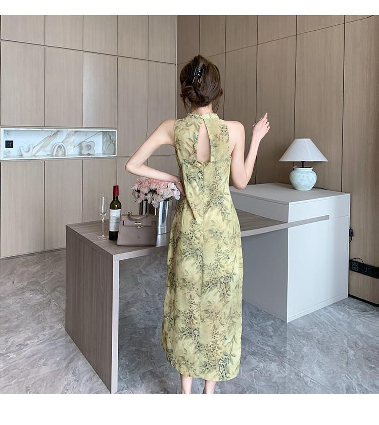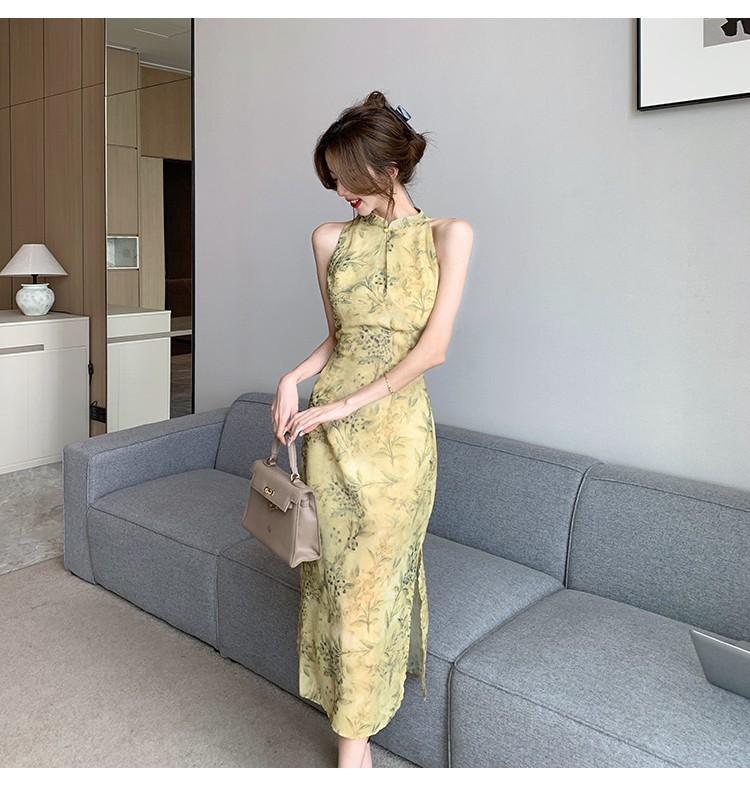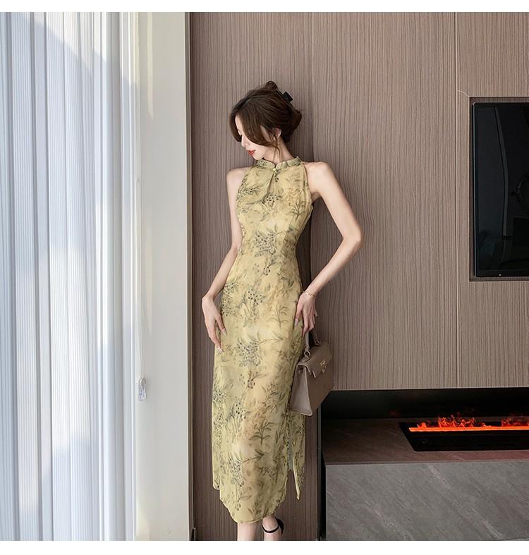 Elegante vestido cheongsam de gasa con estampado de alta sociedad, ajustado y sexy, con escote tipo chaleco y abertura, 2023