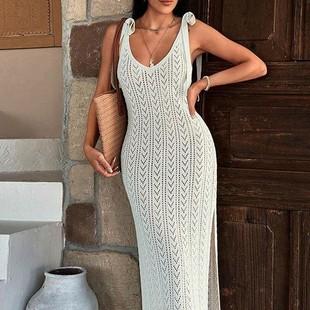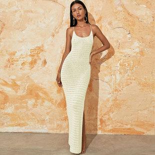 Yangyang Europeo y Americano Transfronterizo Cubreplayas Amazon Sexy Largo Tejido Calado Tirantes Espagueti Espalda Descubierta Vacaciones Vestido Protector Solar