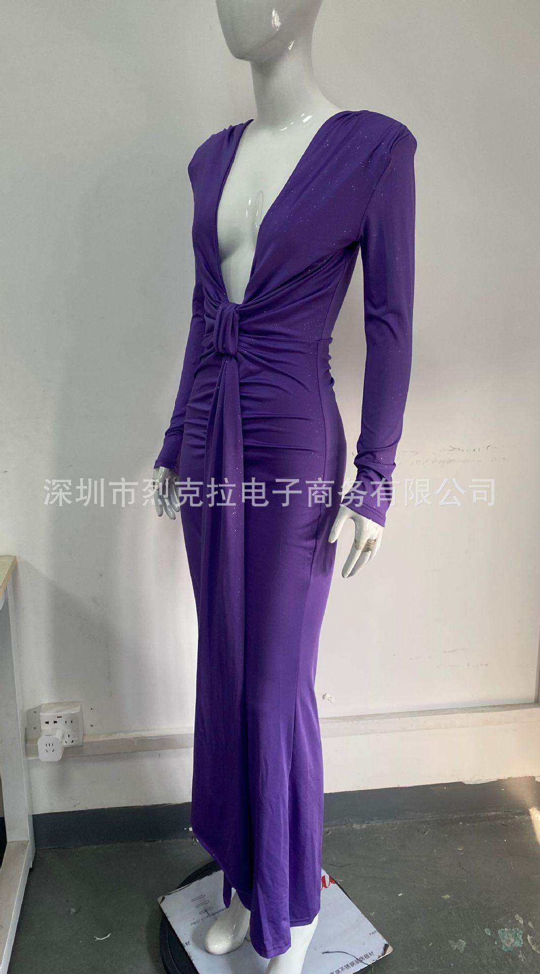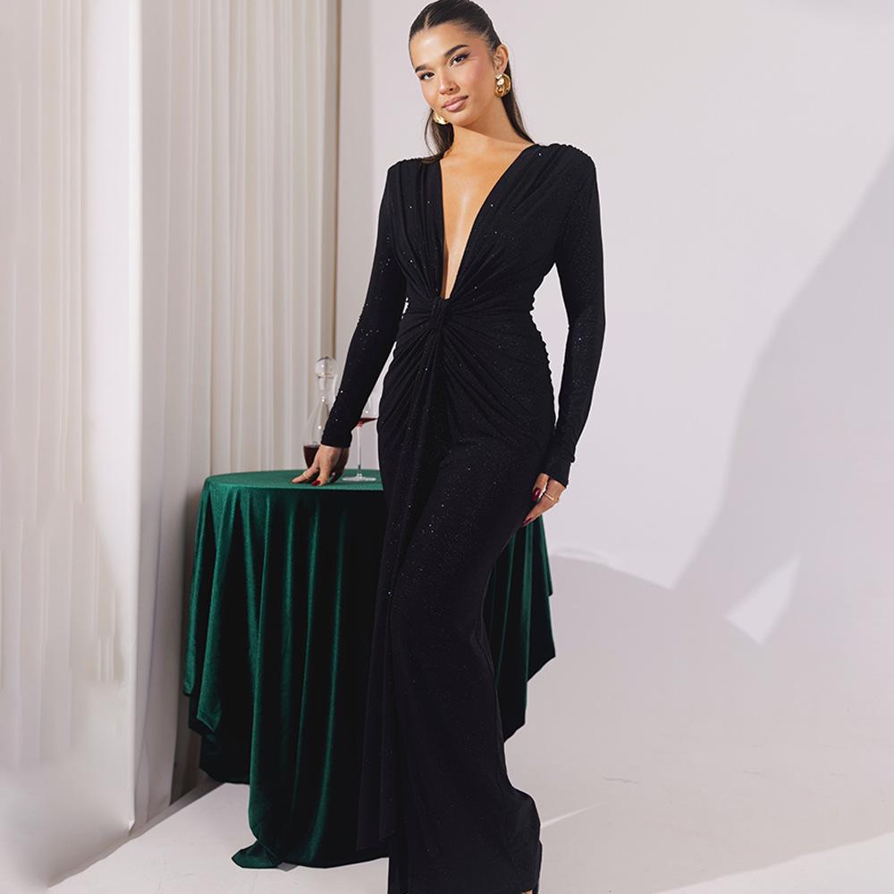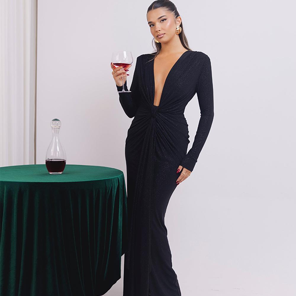 Europeo y Americano Transfronterizo 2025 Otoño e Invierno Elegante Escote en V Profundo con Cinta Falda Larga Sexy Abertura Vestido Ajustado Mujer Venta al por Mayor