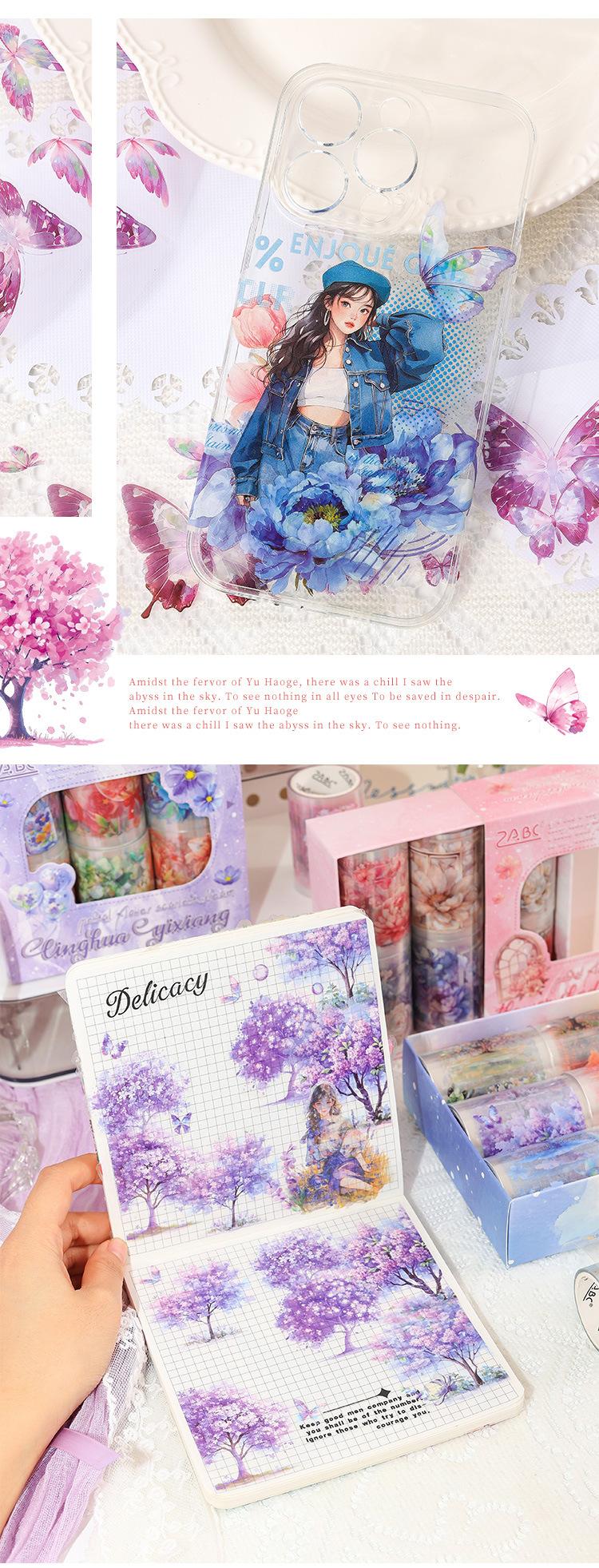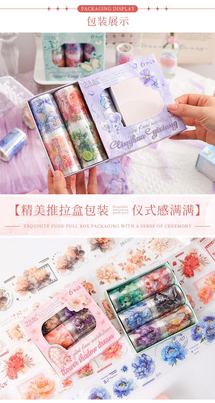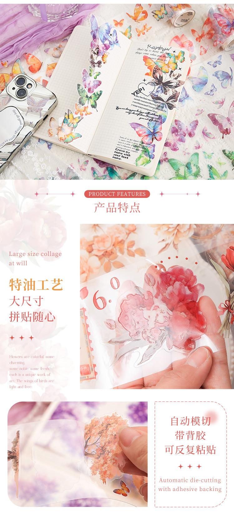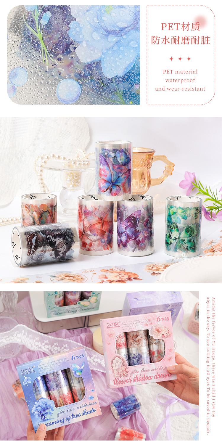 Juego de cinta adhesiva especial de PET con diseño de flor de solapa Fei Meng, resistente al agua y al aceite, para manualidades, diario, pegatinas, paisaje transfronterizo, flores y mariposas.