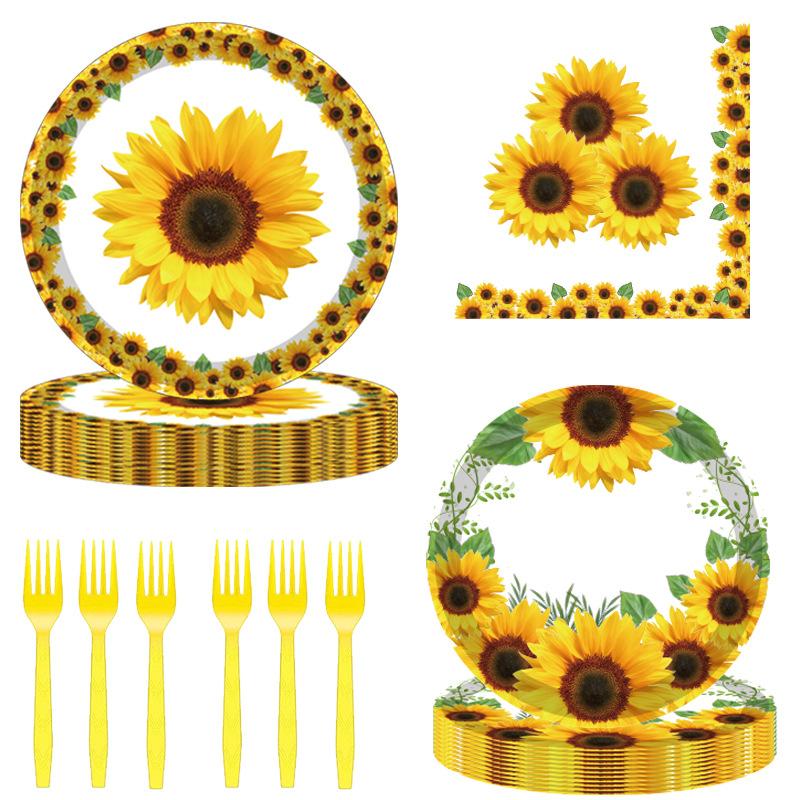 Girasol girasol vajilla festiva juego de 4 piezas platos de papel, toallas de papel, vasos de papel