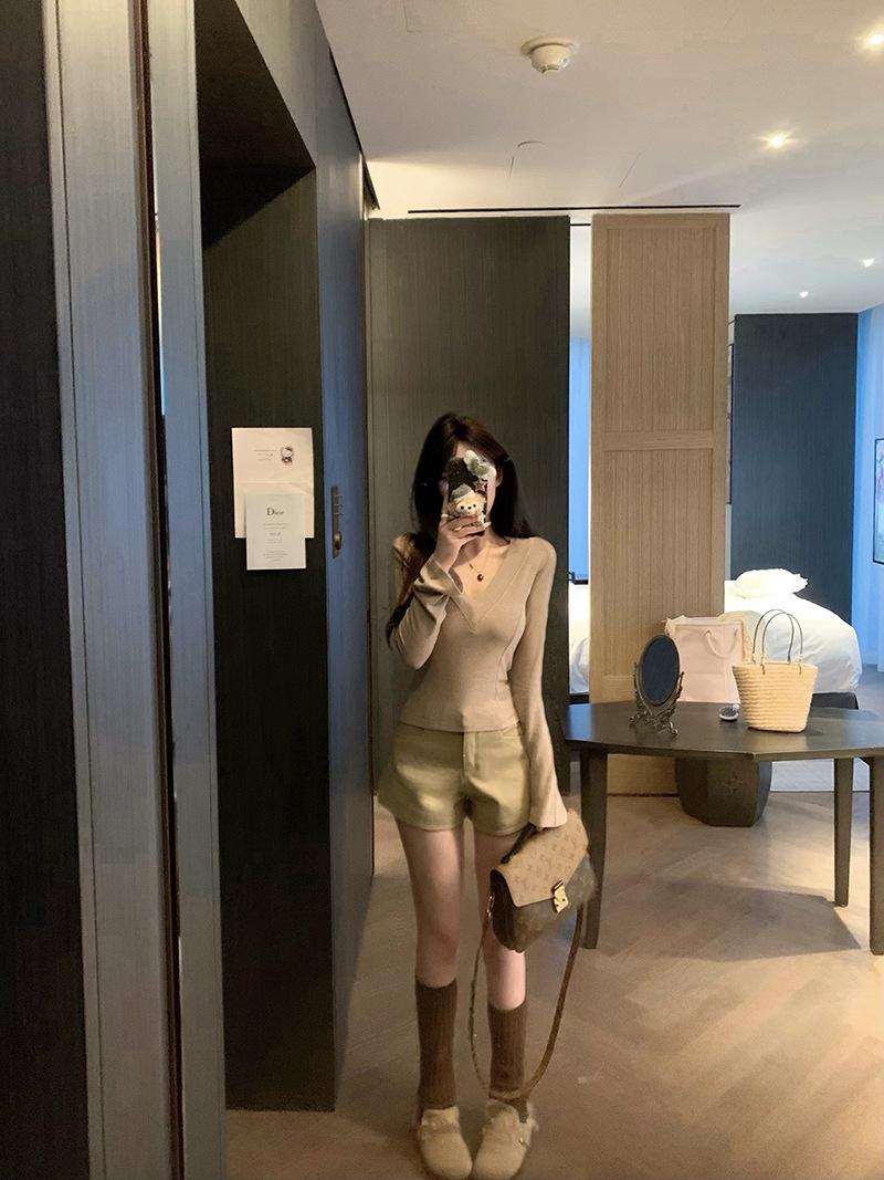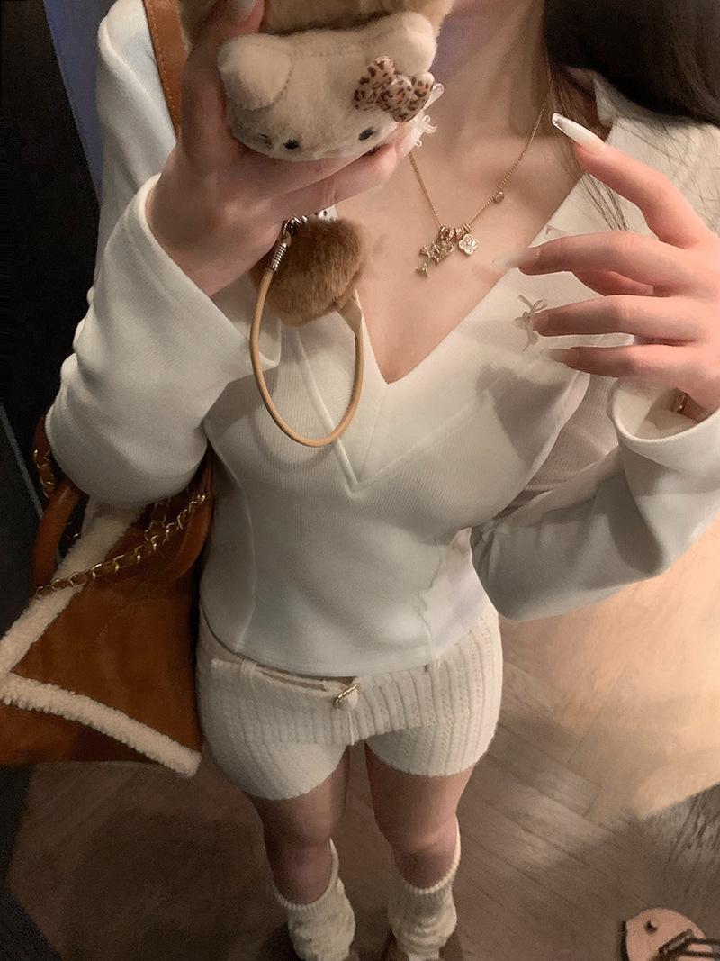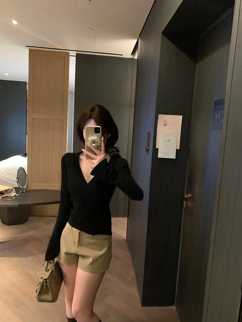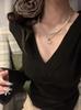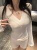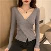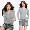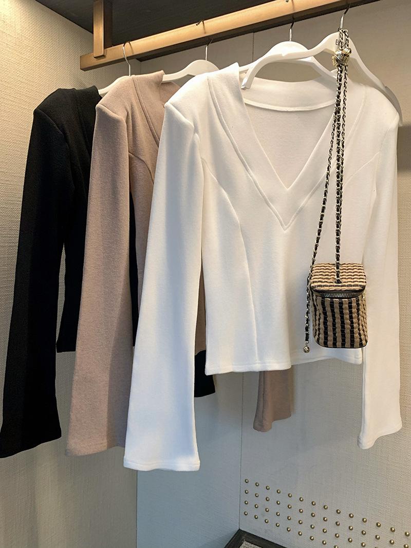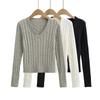 Camiseta básica de cachemira estilo casual 2024 invierno nueva delgada ajustada cuello en V manga larga top de mujer tendencia chic