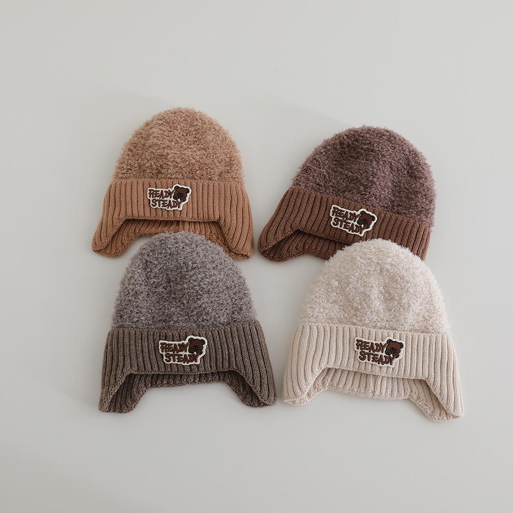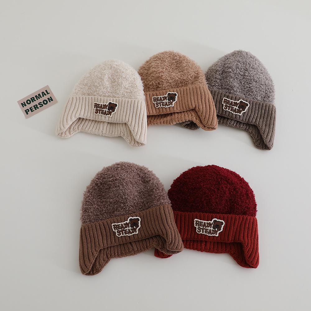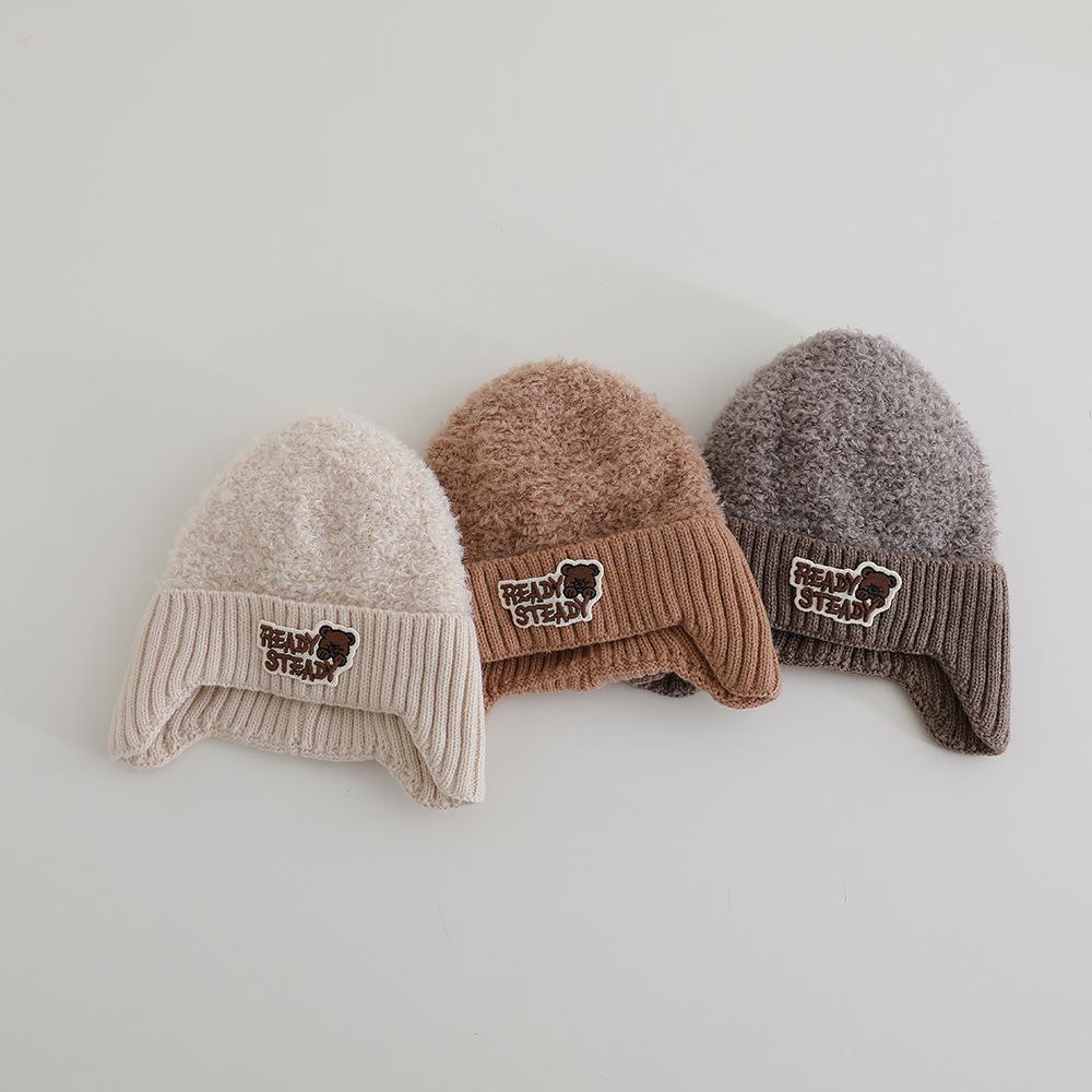 Nuevo gorro de punto de invierno para niños con letras de oso de peluche de algodón, gorro protector para los oídos, gorro cálido para niños y niñas de 2 a 7 años