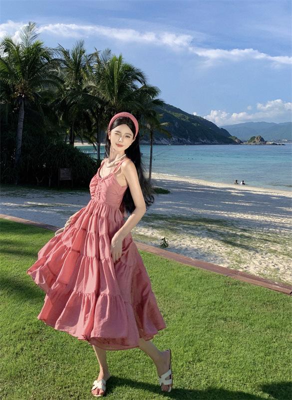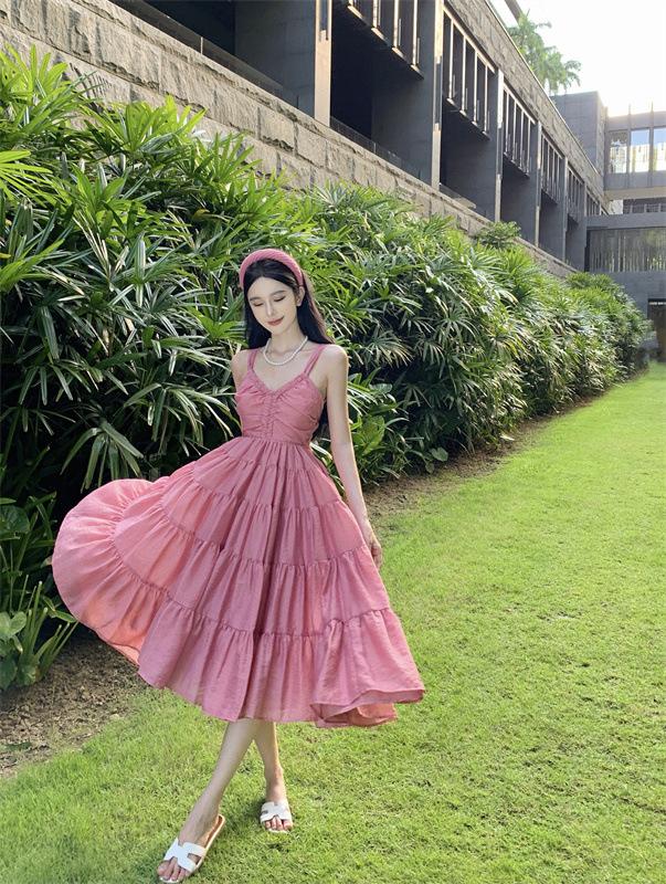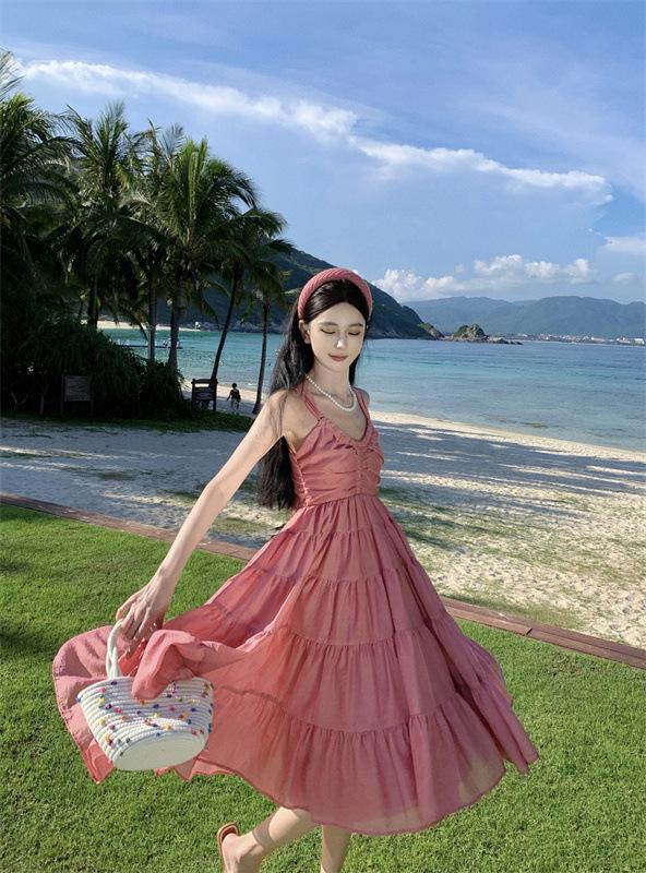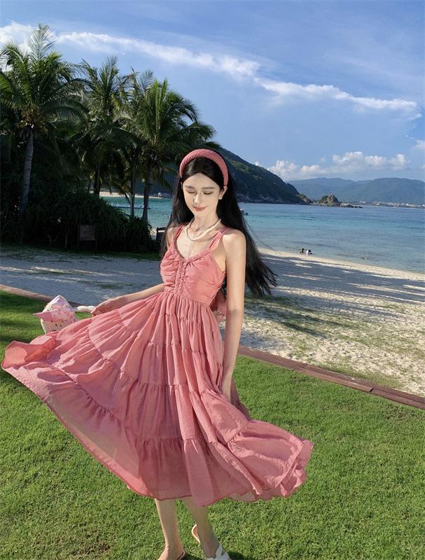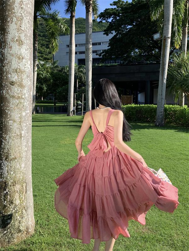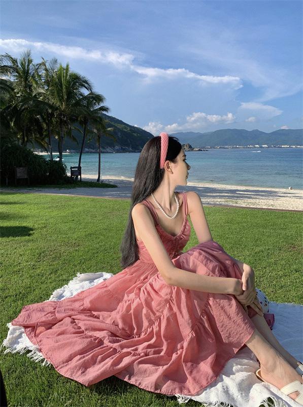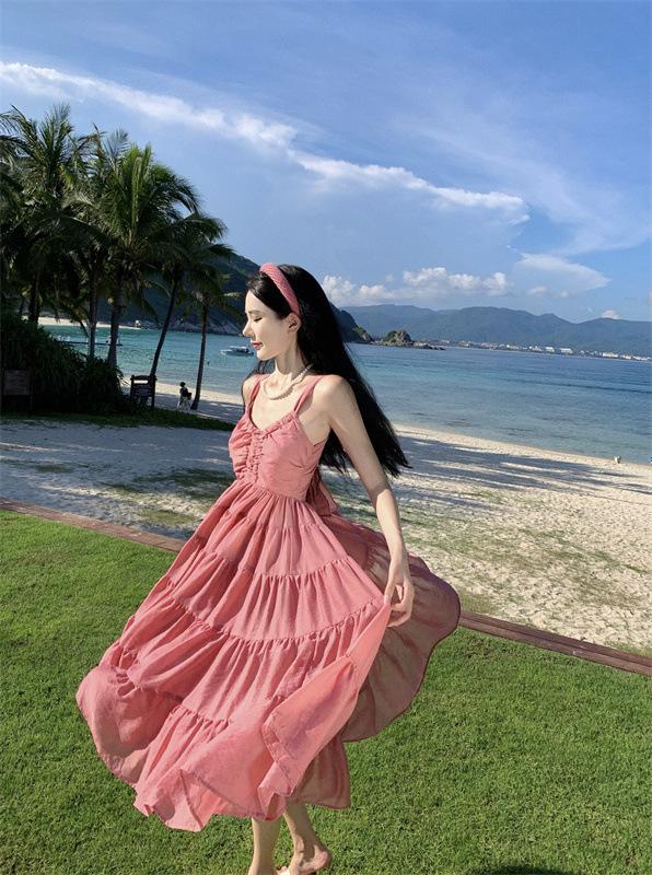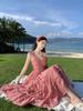 Vestido Rosa de Tirantes Descubierto por la Espalda para Mujer Verano 2025 Nuevo Estilo Pequeño Vacaciones en la Playa Playa Francés Vestido Largo