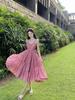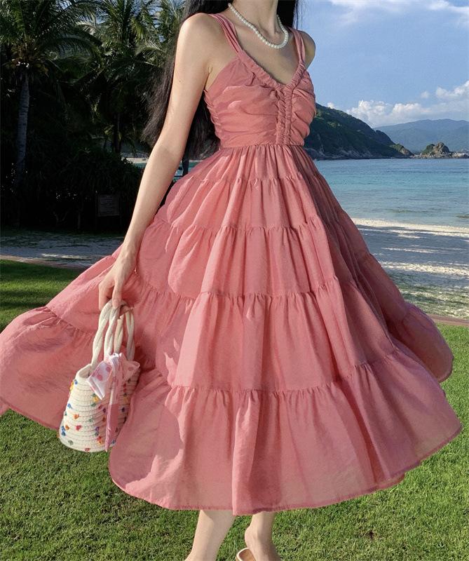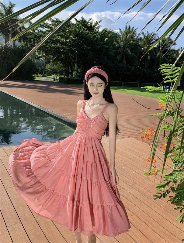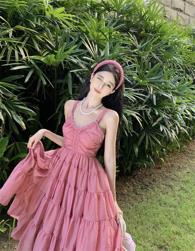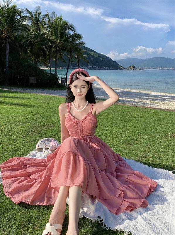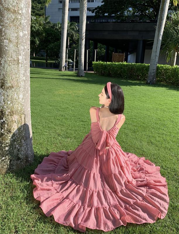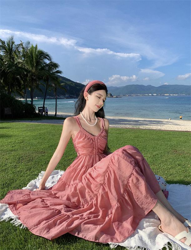 Vestido Rosa de Tirantes Descubierto por la Espalda para Mujer Verano 2025 Nuevo Estilo Pequeño Vacaciones en la Playa Playa Francés Vestido Largo