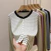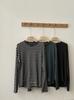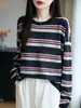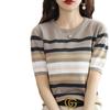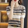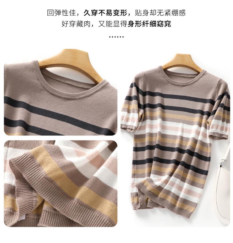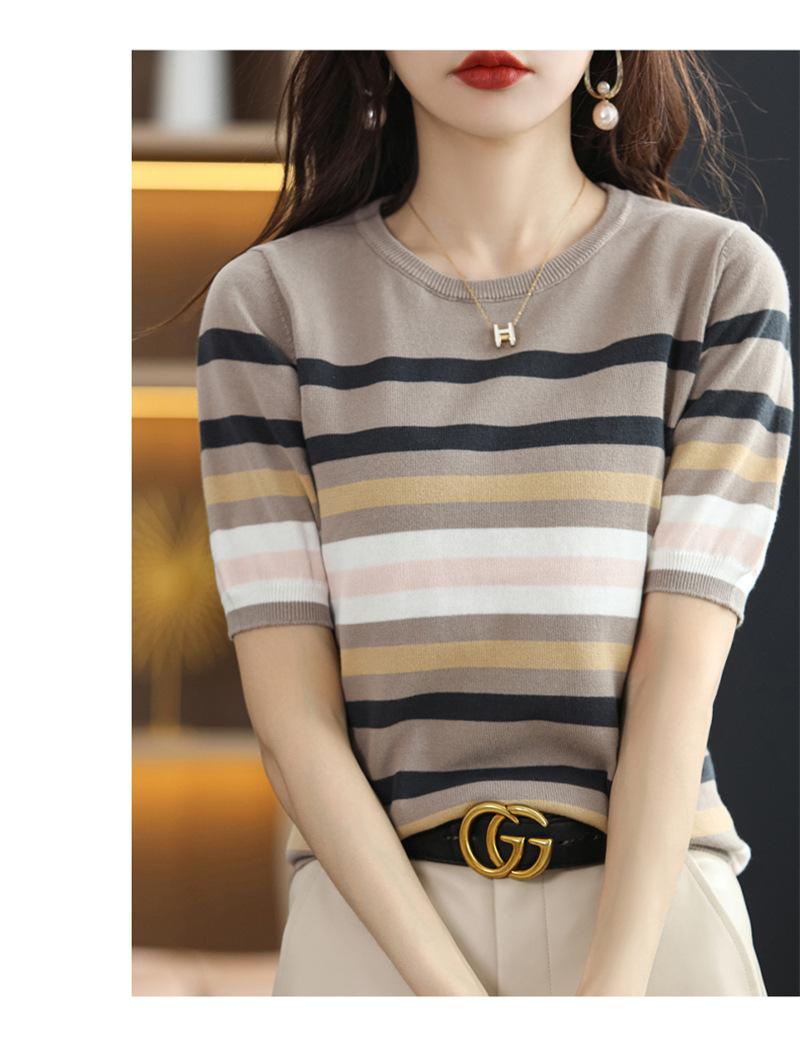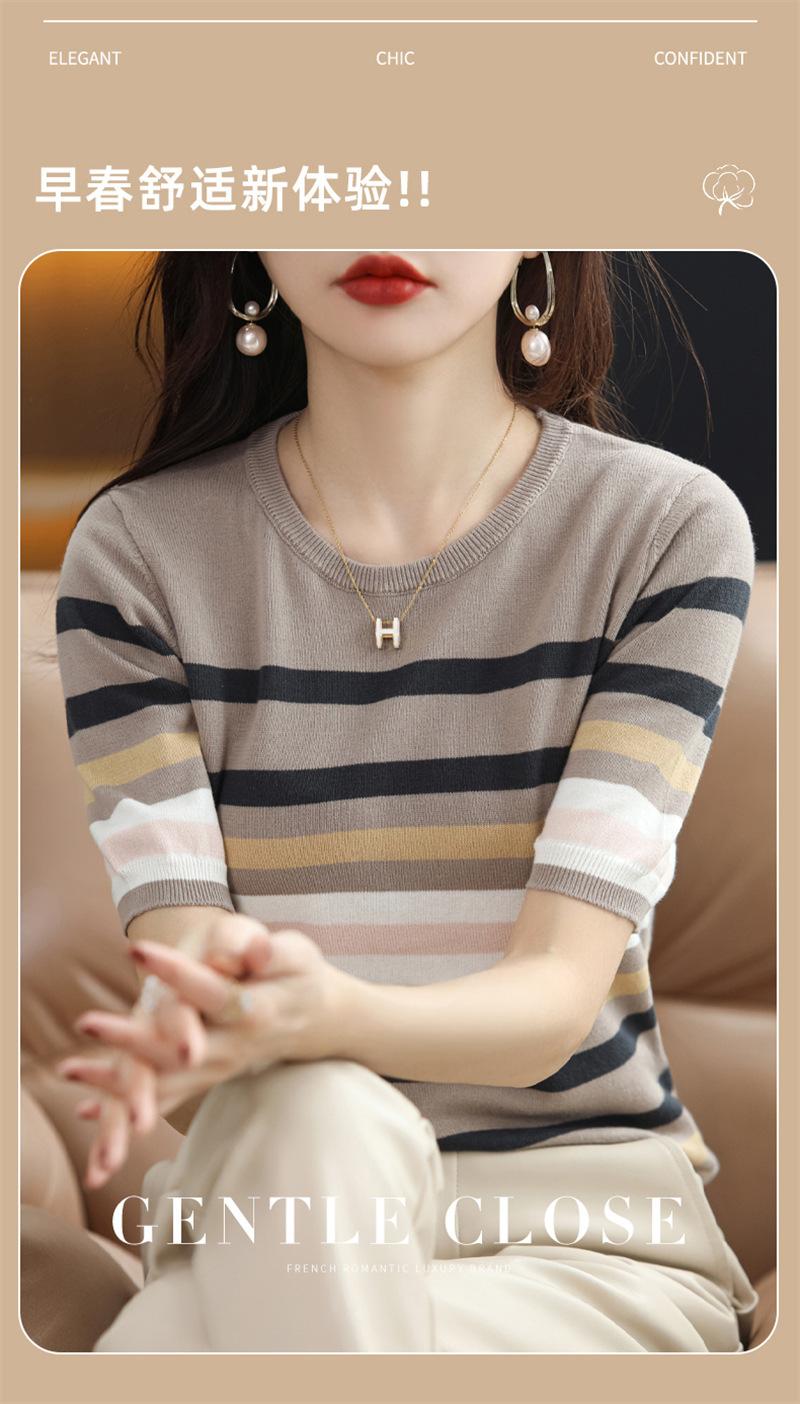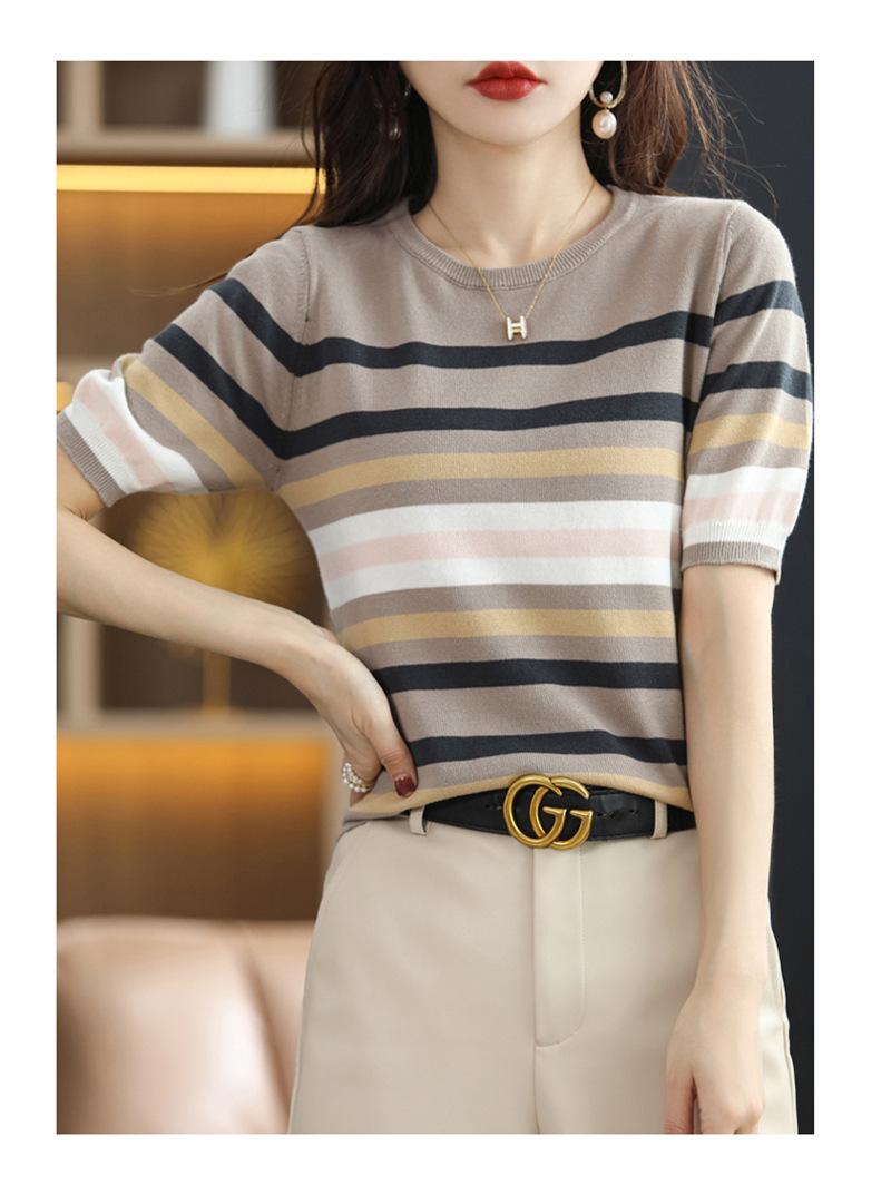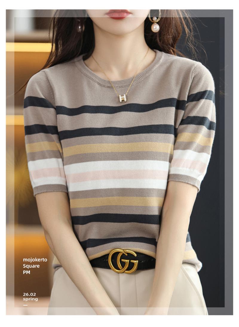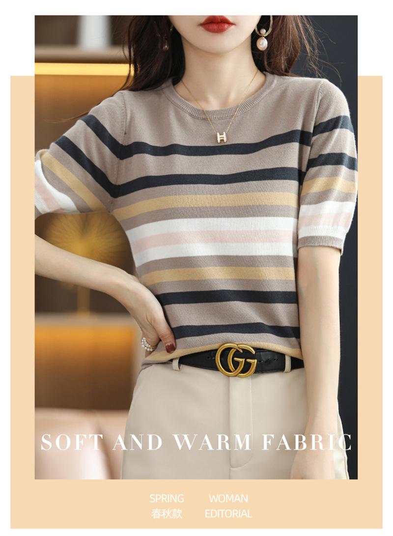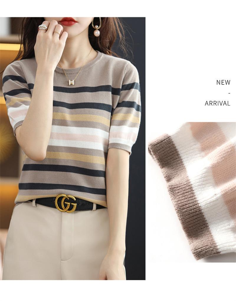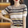 Cuello Redondo Color Block Rayado Tejido Manga Corta Mujer 2025 Verano Nuevo Versátil Camiseta Top Estilo Coreano Holgado Algodón Media Manga