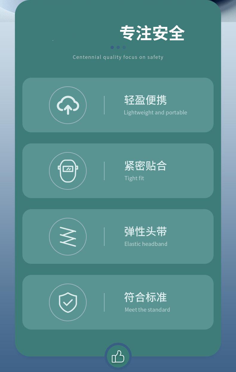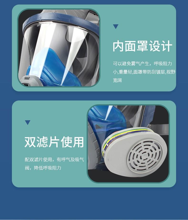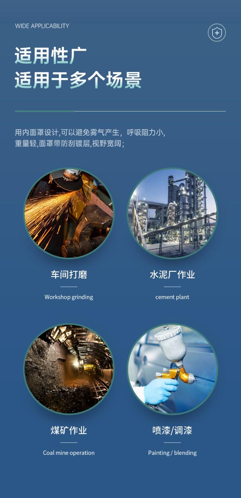 El diseño interior de la máscara puede evitar el empañamiento, tiene baja resistencia a la respiración, es ligero, tiene un revestimiento resistente a los arañazos y proporciona un amplio campo de visión.