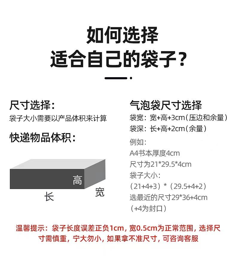 2. Las dimensiones indicadas son para bolsas.Dimensiones externasEl ancho interior es 2 cm menor que el exterior. Por ejemplo, 11 x 13 + 4, el tamaño real (diámetro interior) de la bolsa es 9 x 13 + 4, y la longitud del sello es de 4 cm.La bolsa se fabrica a máquina, por lo que puede haber ligeras diferencias de tamaño. Es mejor elegir una talla más grande que una más pequeña..comoSi tiene alguna pregunta, comuníquese con el servicio de atención al cliente.