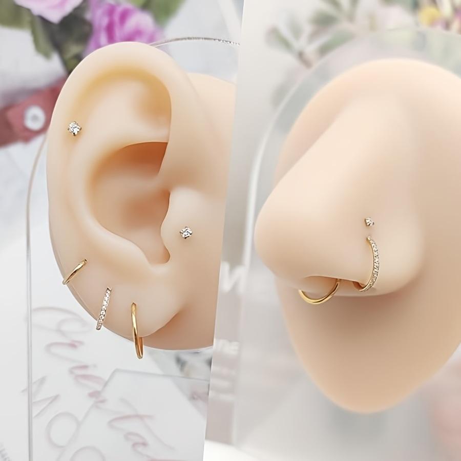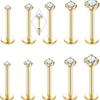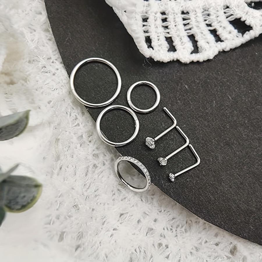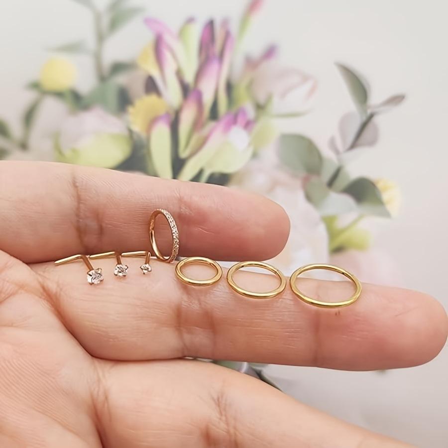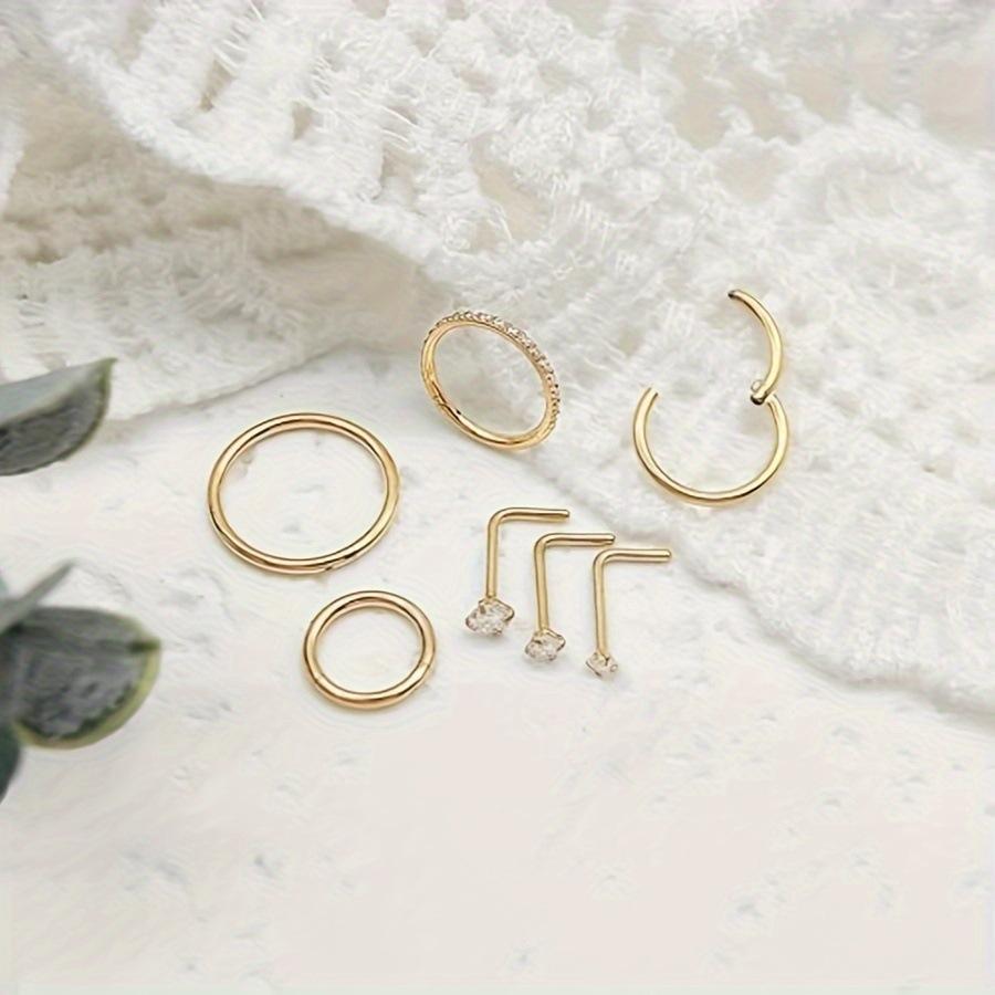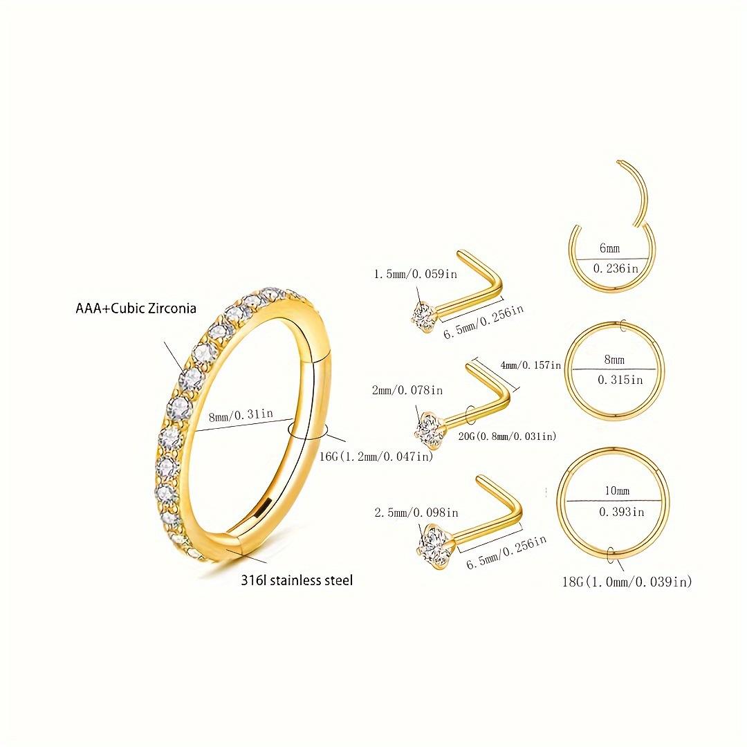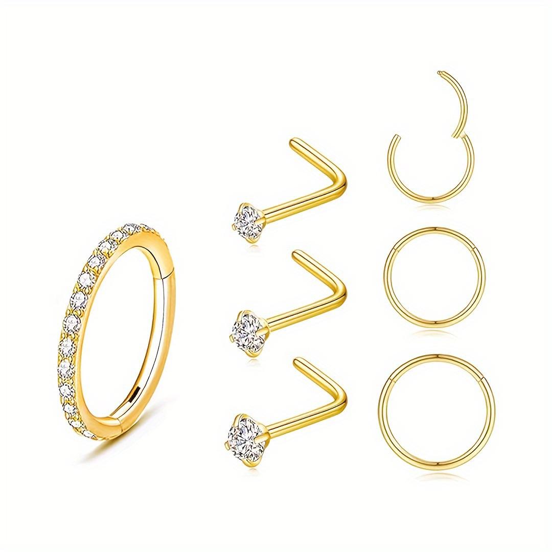 Anillo nasal de acero inoxidable dorado de 7 piezas con diamantes y circonitas, combinación de joyería con punción en forma de L, ideal para Amazon.