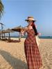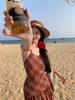 Vestido sexy de verano con cuello halter y espalda descubierta a cuadros rojos para vacaciones en la playa, estilo francés, elegante y largo
