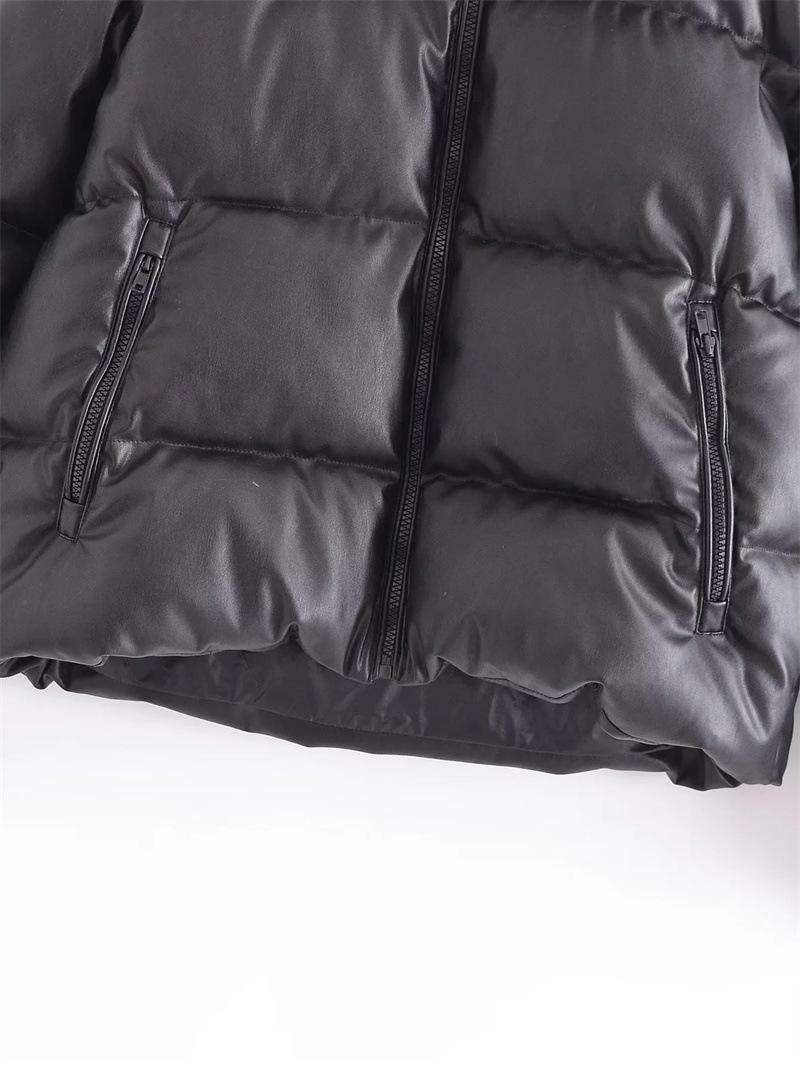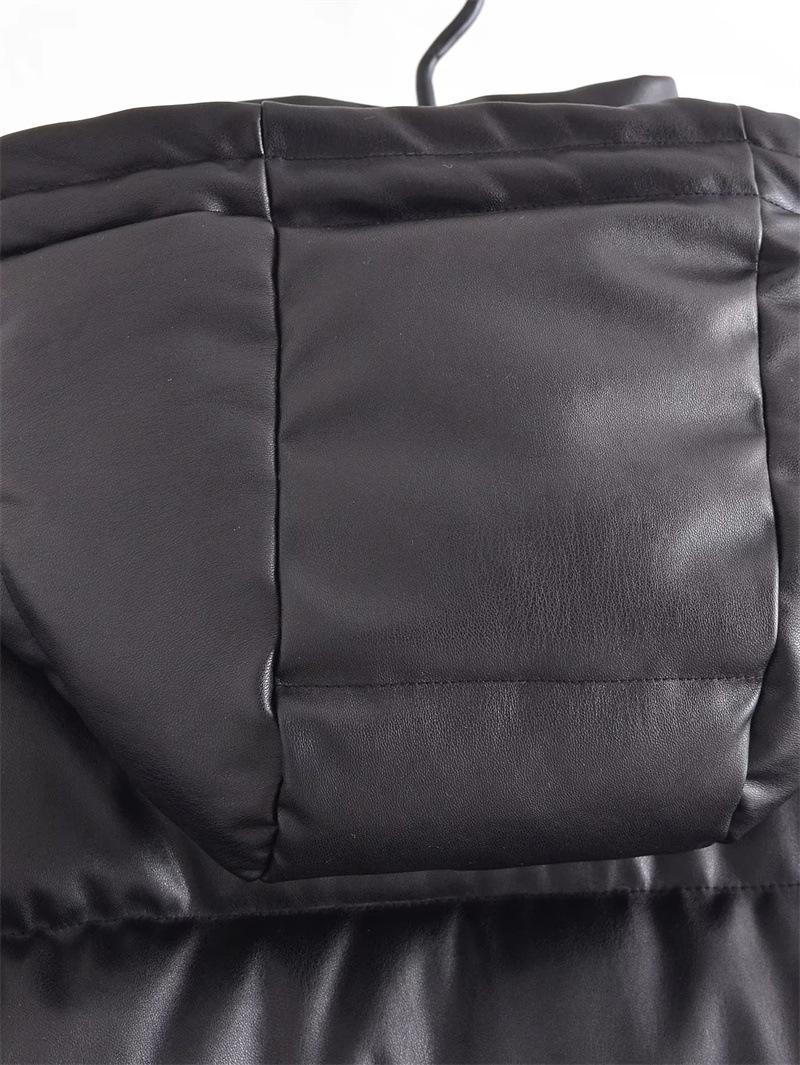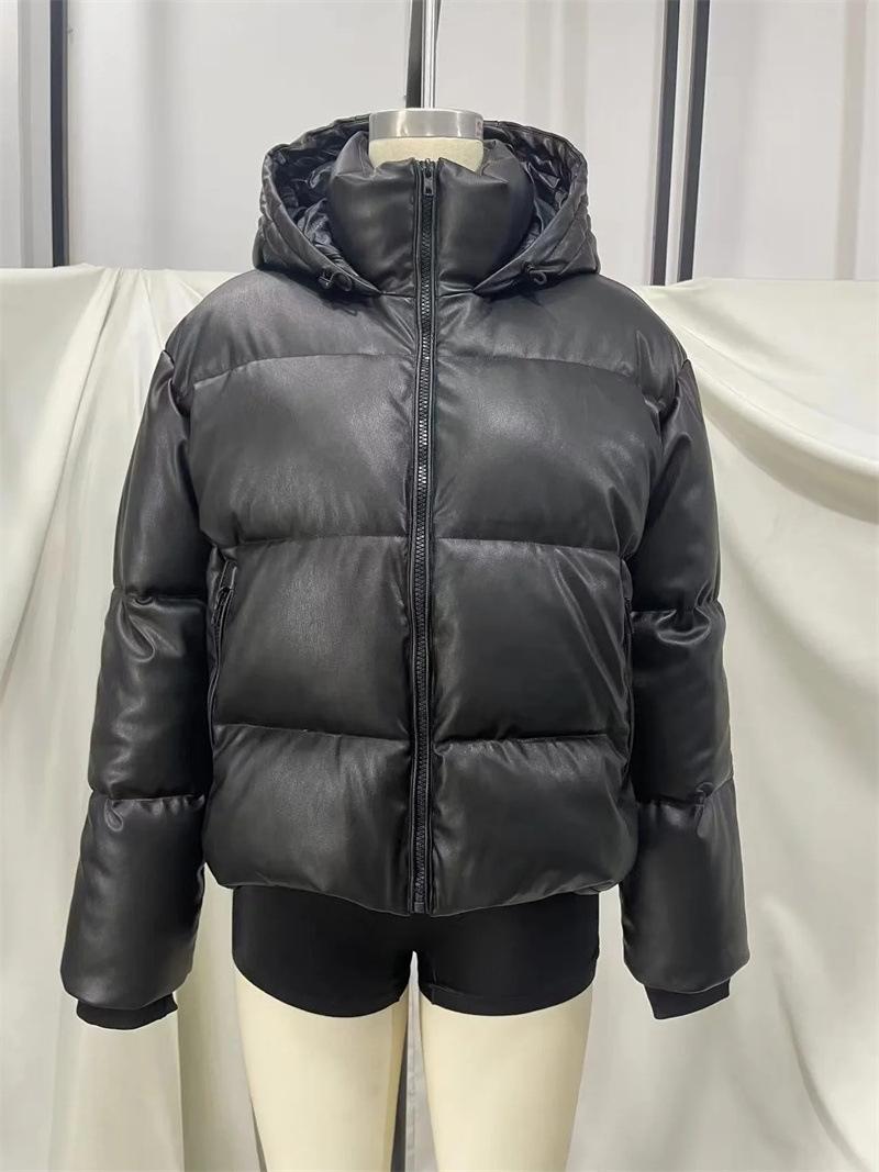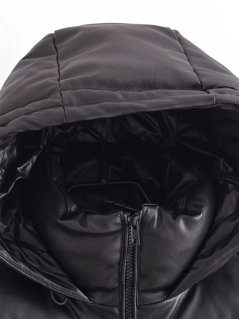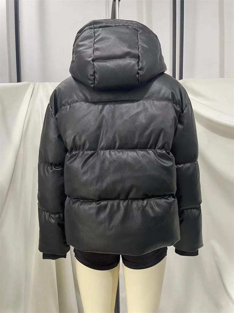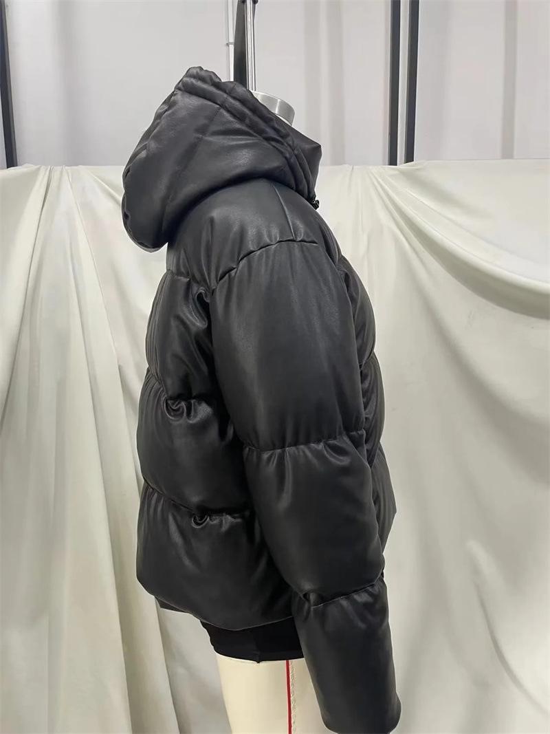 Chaqueta regular de invierno para mujer con capucha de PU negra, cálida y acolchada de algodón, Moda europea y americana 2024, chaqueta de cuero acolchada de algodón personalizada