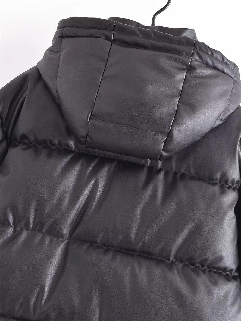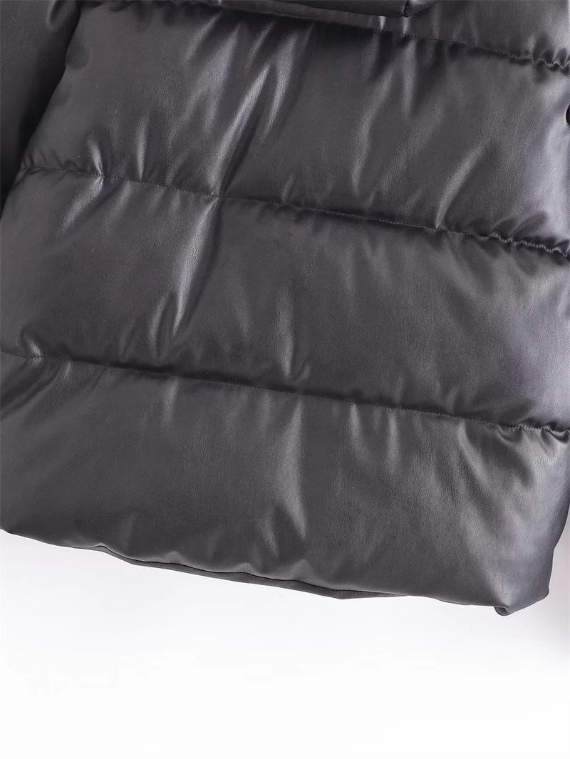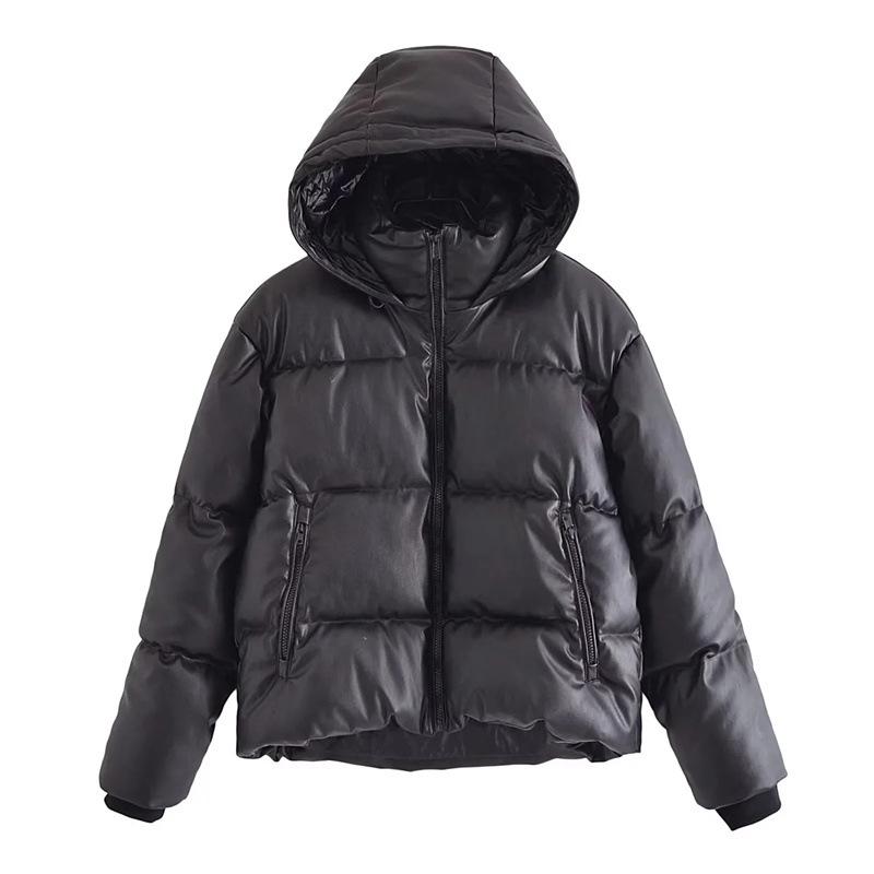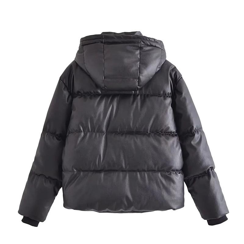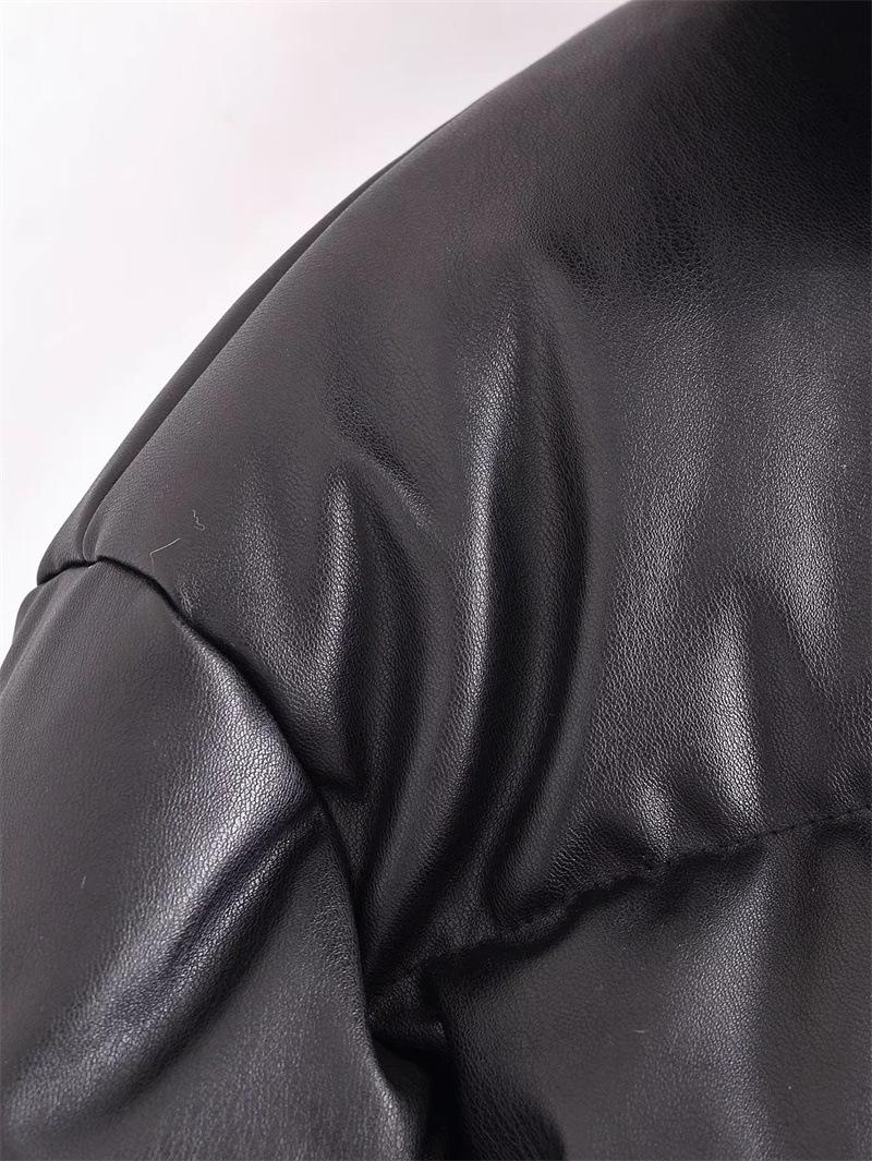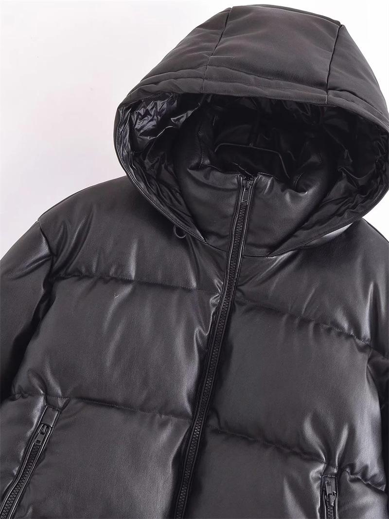 Chaqueta regular de invierno para mujer con capucha de PU negra, cálida y acolchada de algodón, Moda europea y americana 2024, chaqueta de cuero acolchada de algodón personalizada