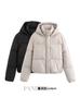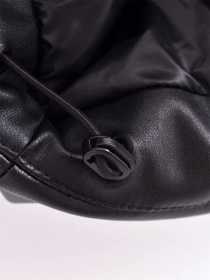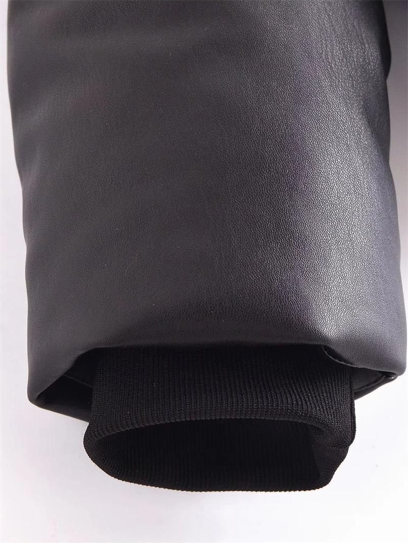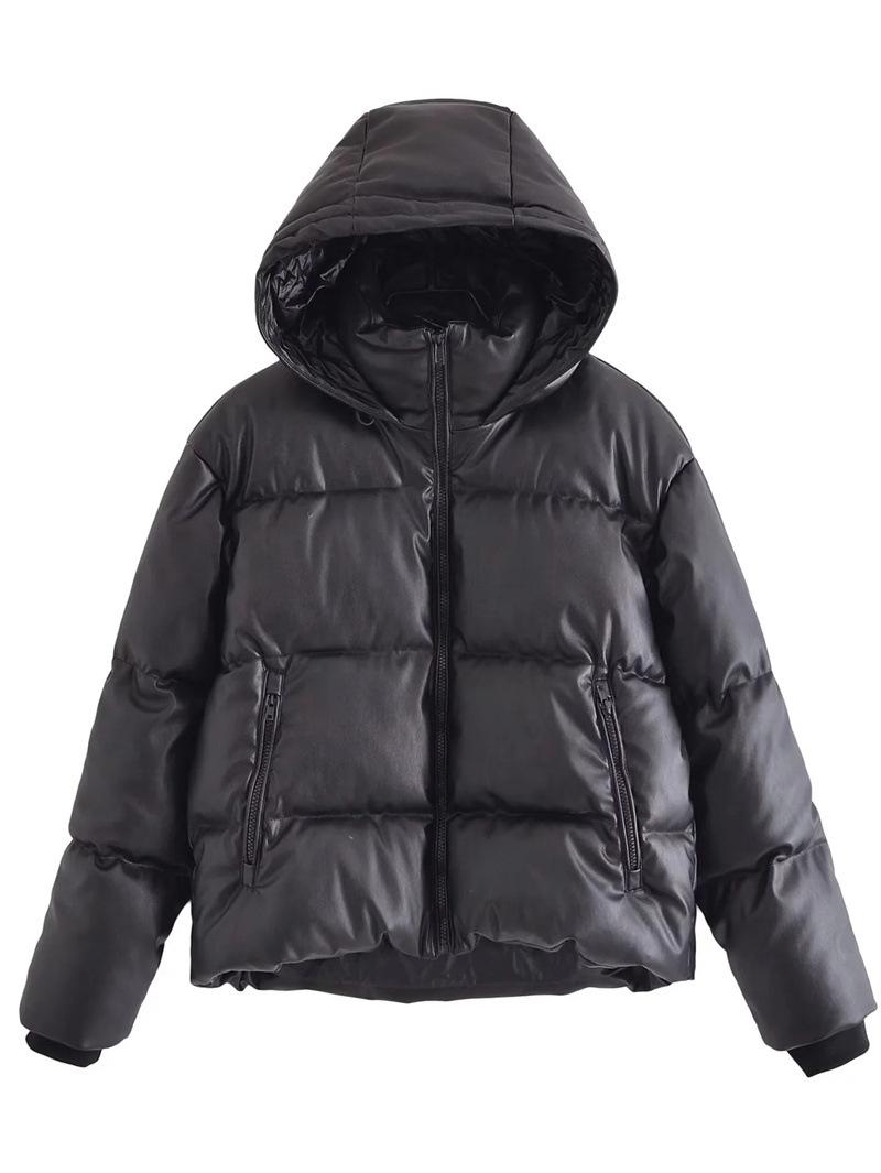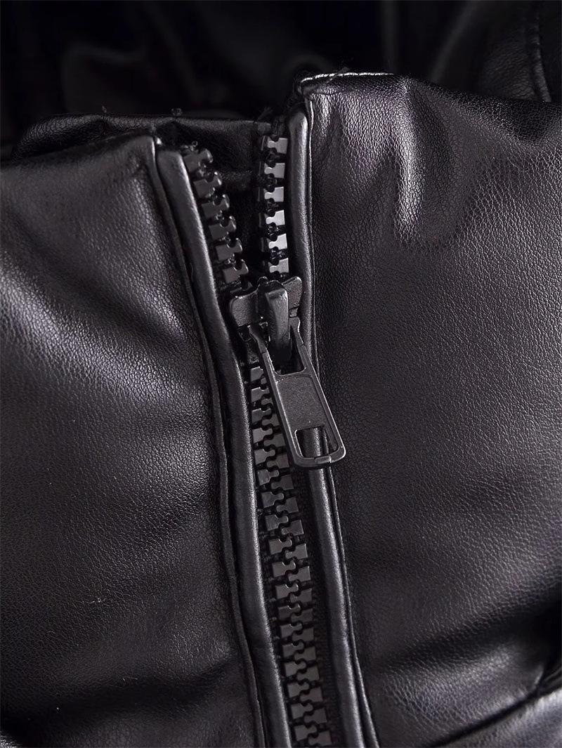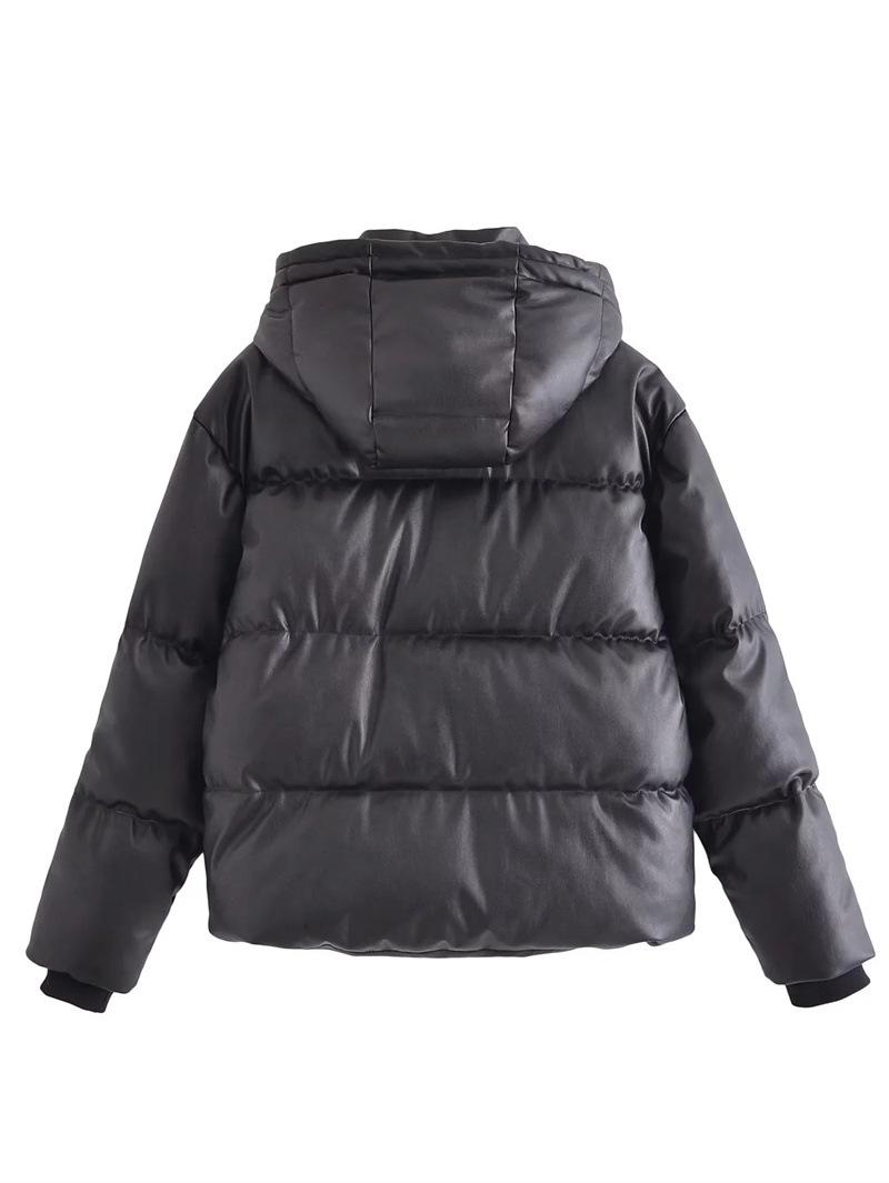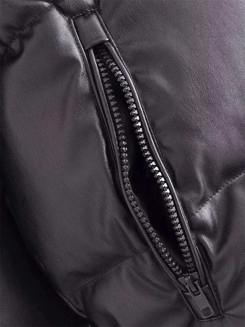 Chaqueta regular de invierno para mujer con capucha de PU negra, cálida y acolchada de algodón, Moda europea y americana 2024, chaqueta de cuero acolchada de algodón personalizada