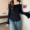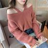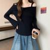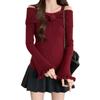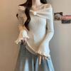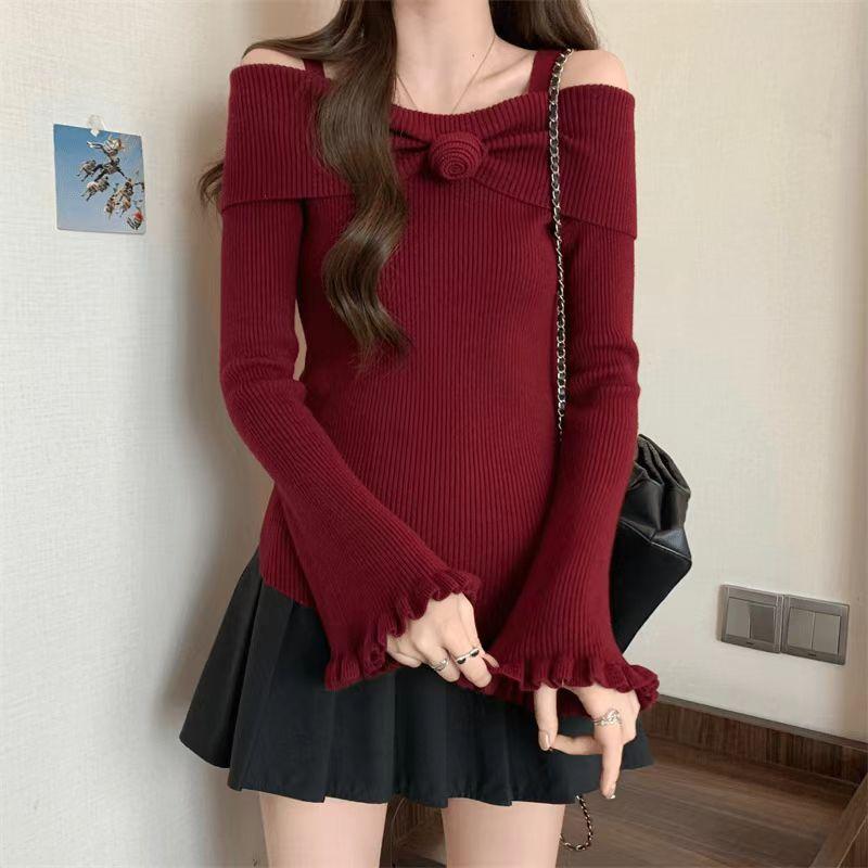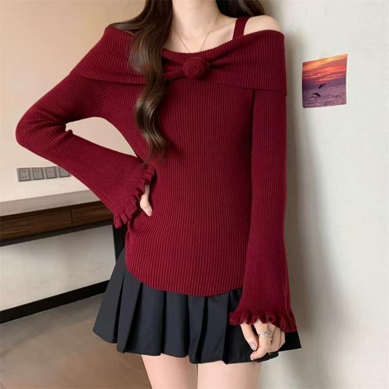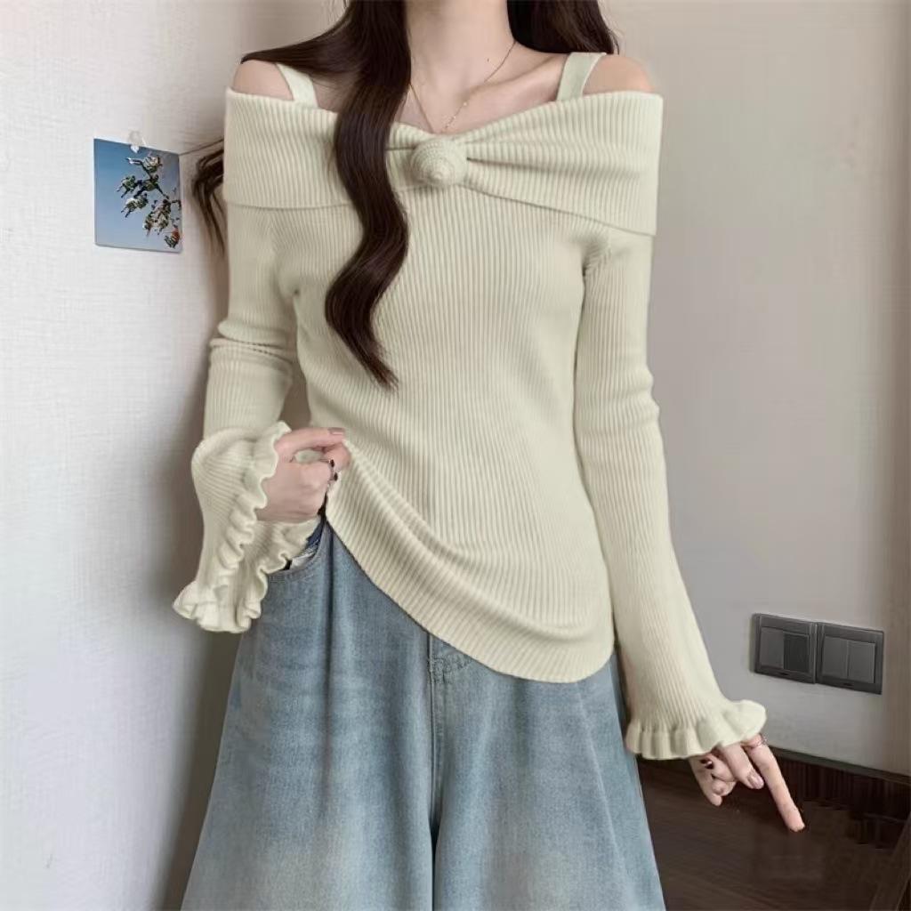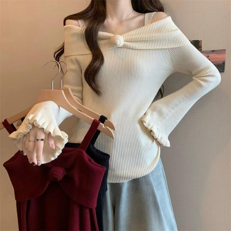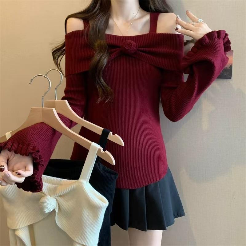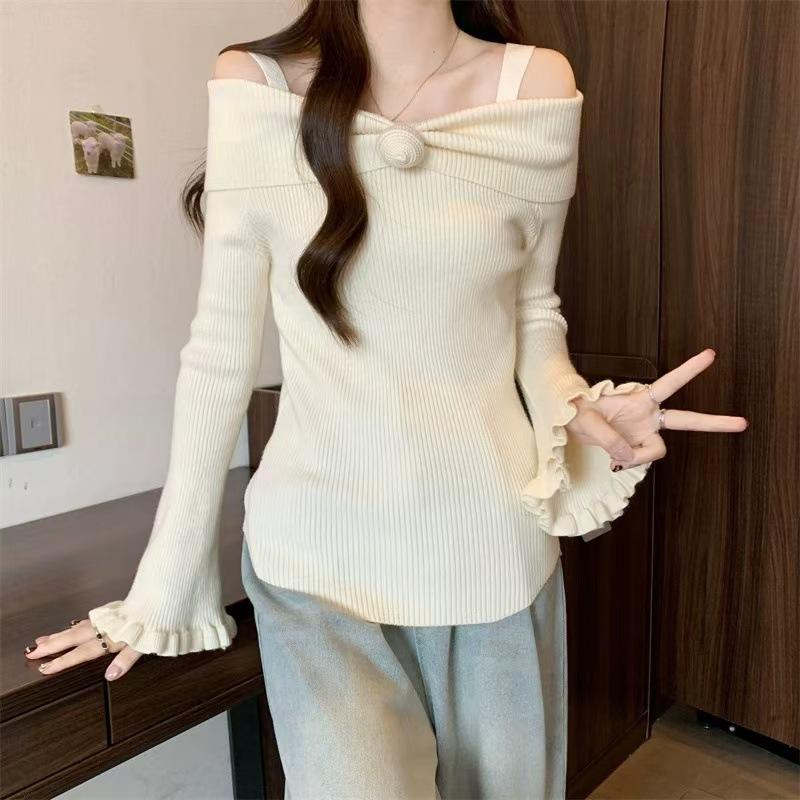 Talla única Otoño e Invierno para Mujer Nueva Llegada Hombro Descubierto Tirantes Spice Girl Suéter de Manga Larga Ajustado Adelgazante Combinable Suéter Pulóver