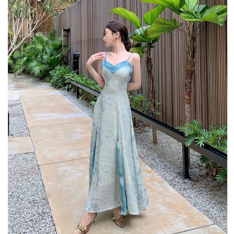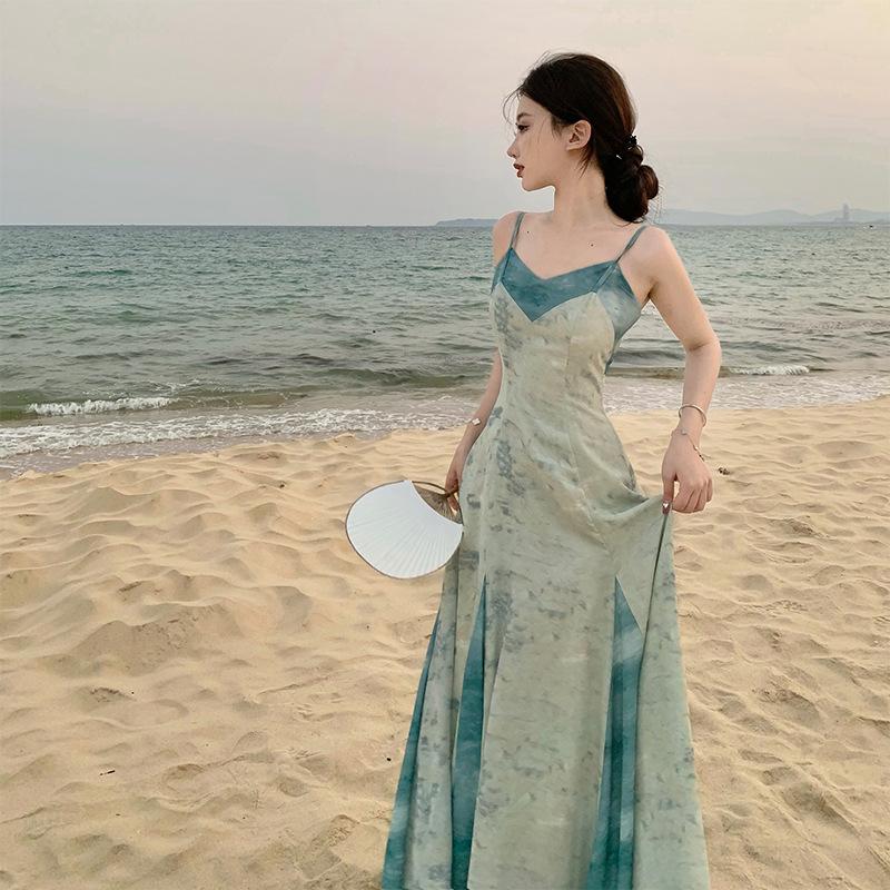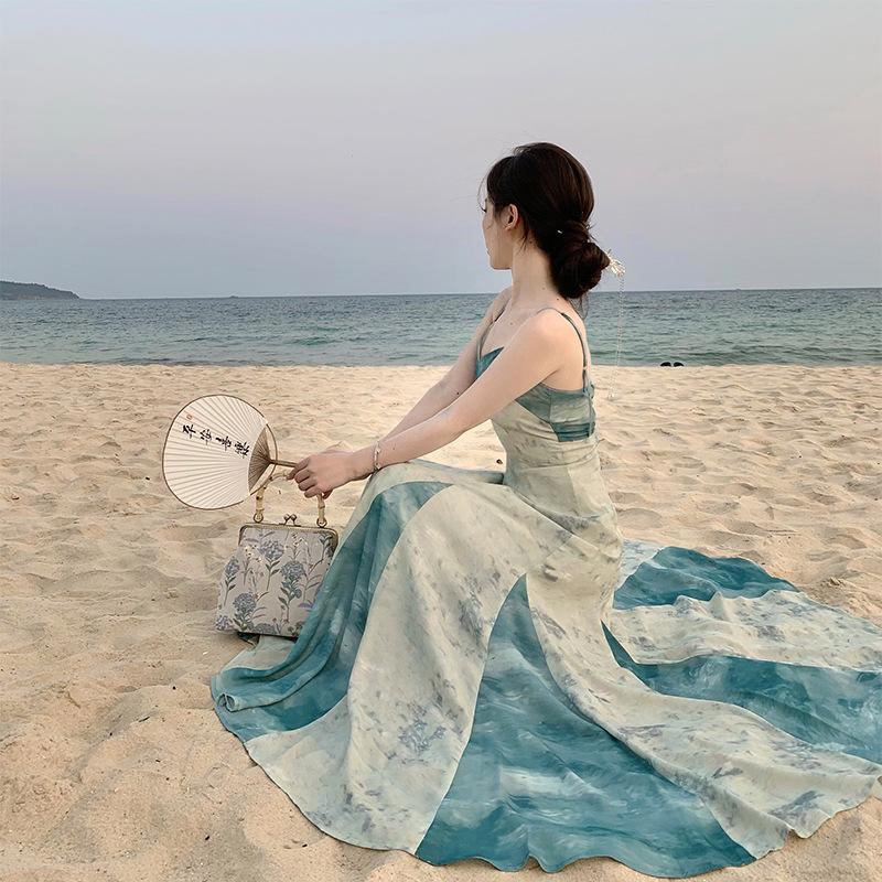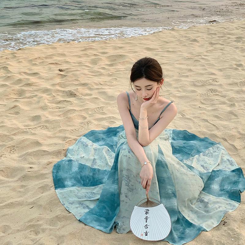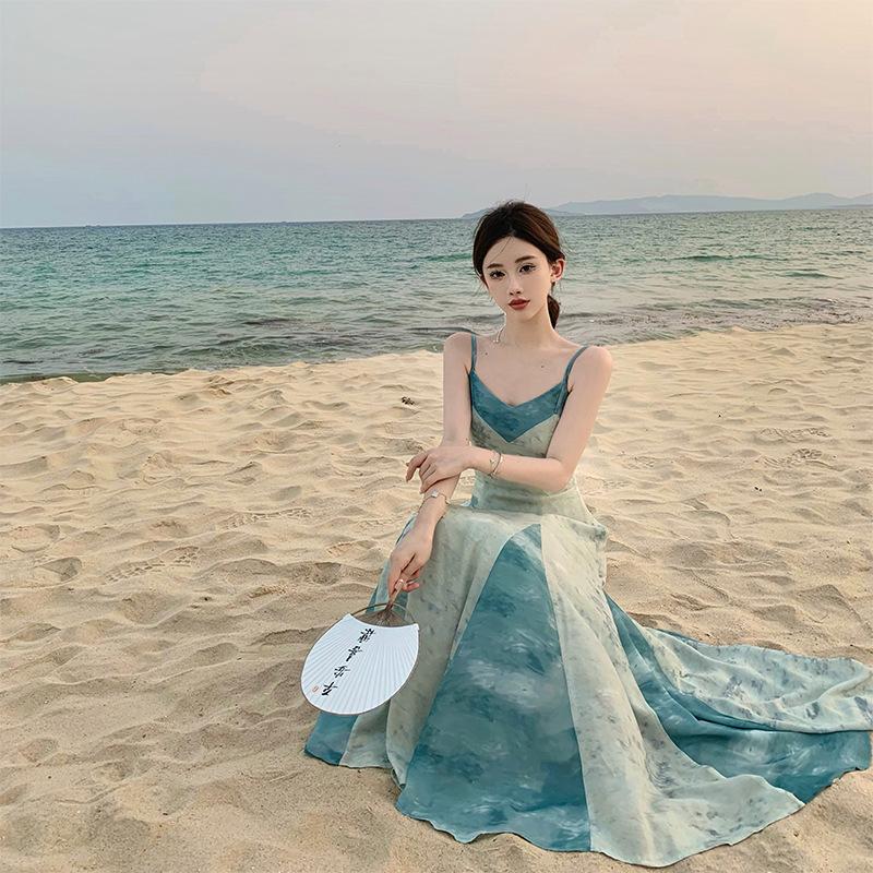 Foto Real de Primavera y Verano 2025 Nuevo Diseño Francés Azul Degradado Vestido Falda Grande Vacaciones en la Costa Falda de Playa