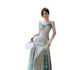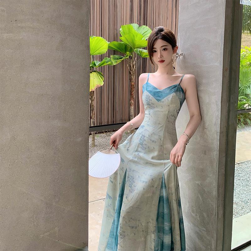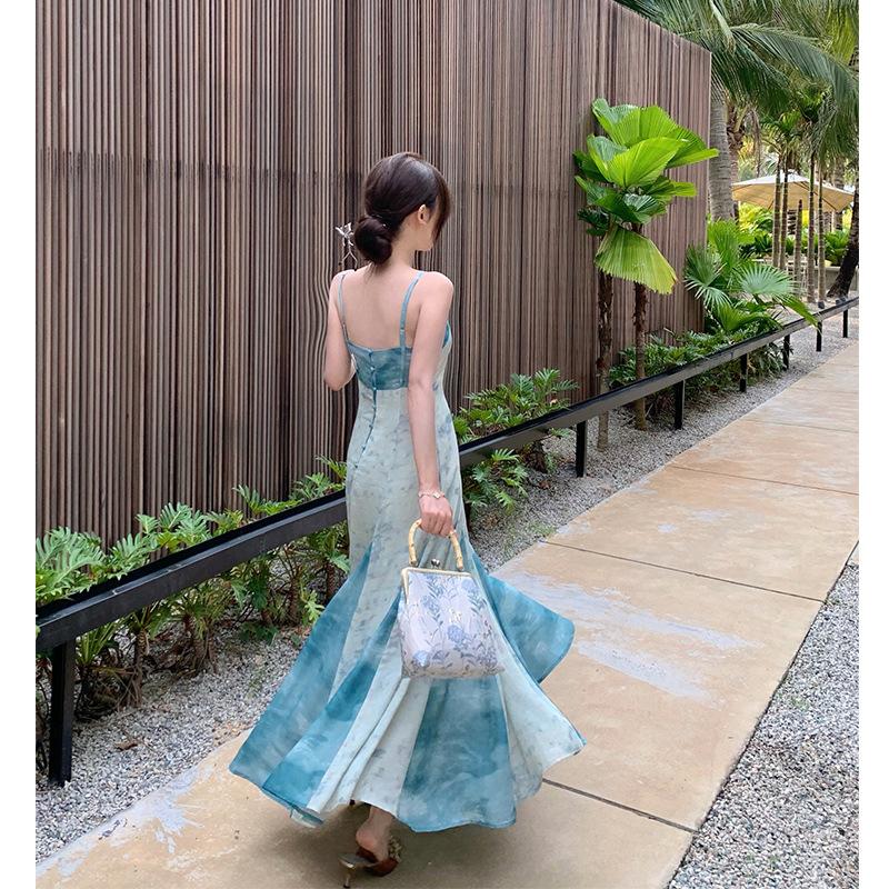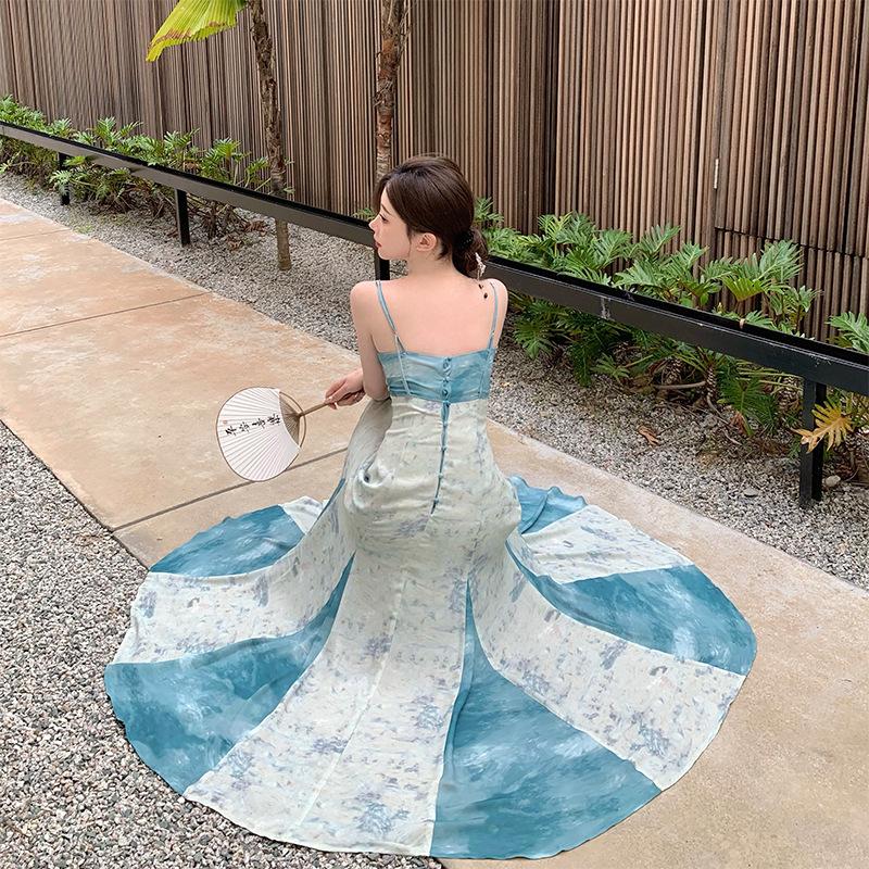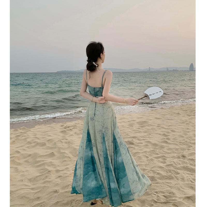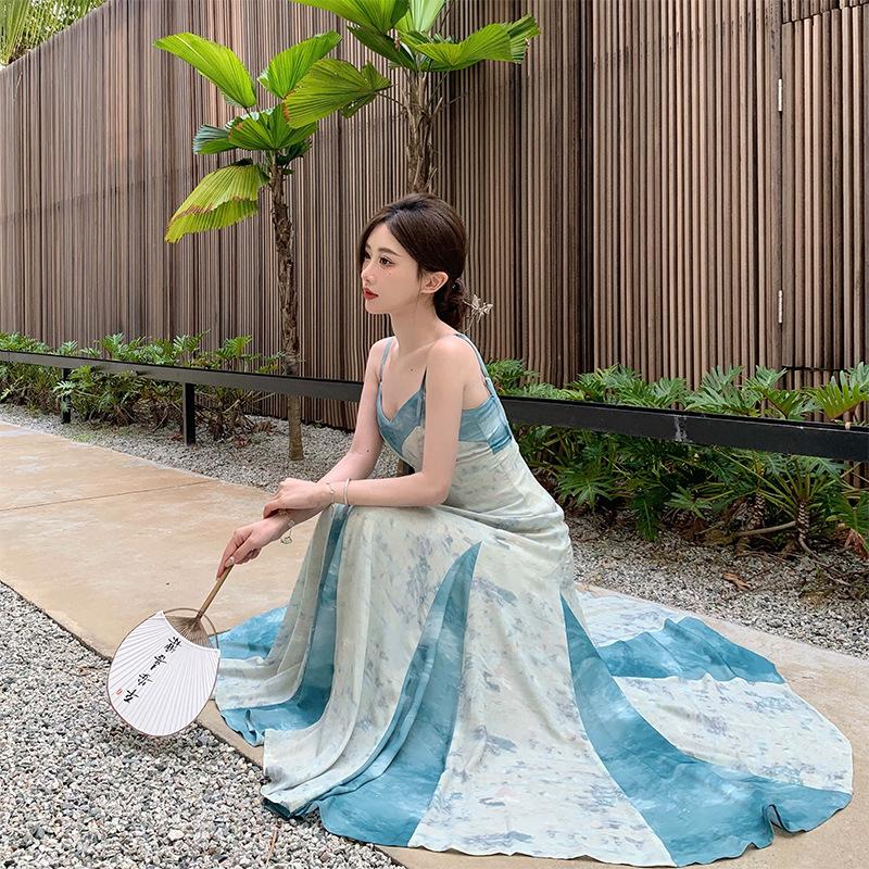 Foto Real de Primavera y Verano 2025 Nuevo Diseño Francés Azul Degradado Vestido Falda Grande Vacaciones en la Costa Falda de Playa