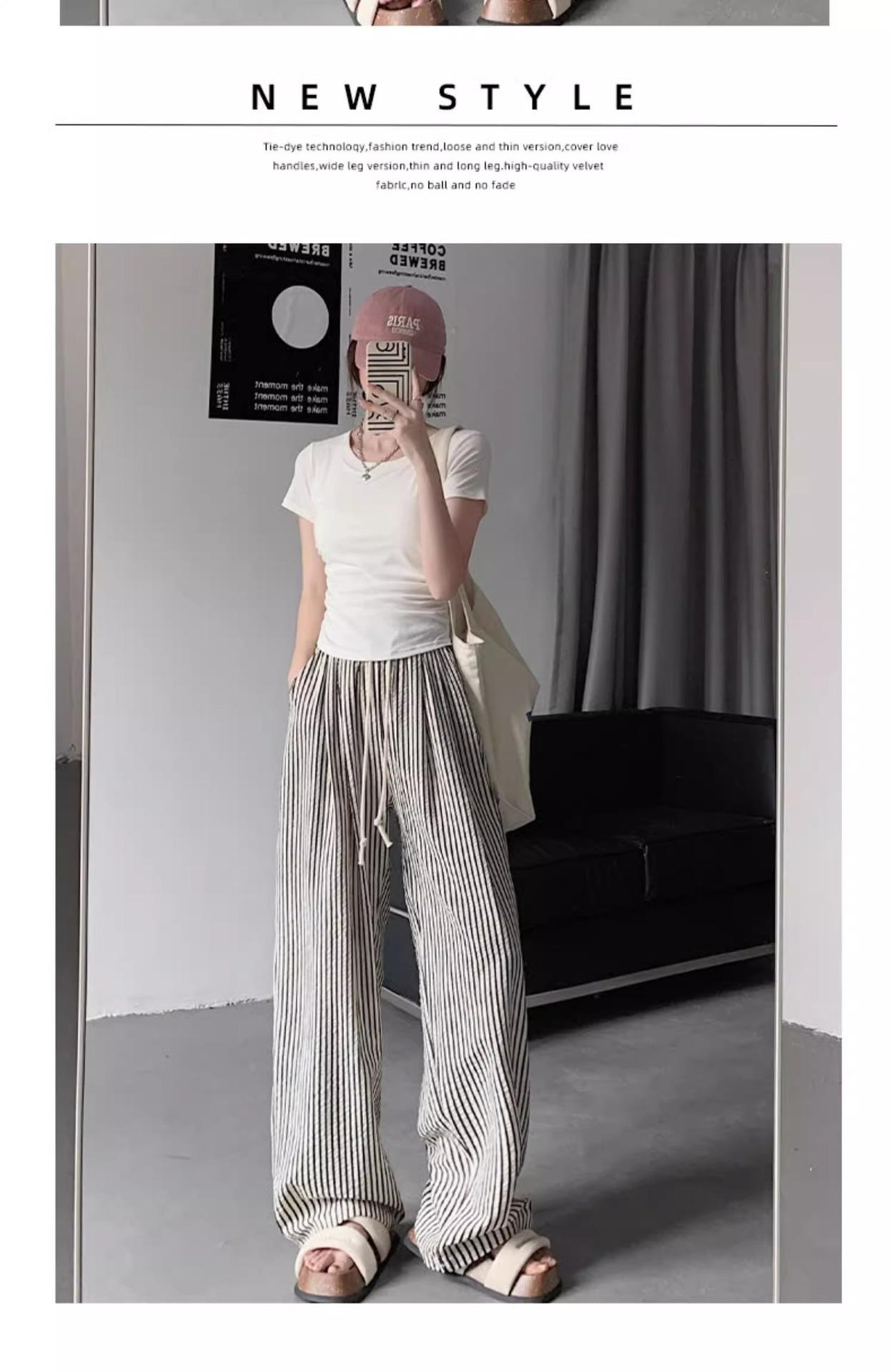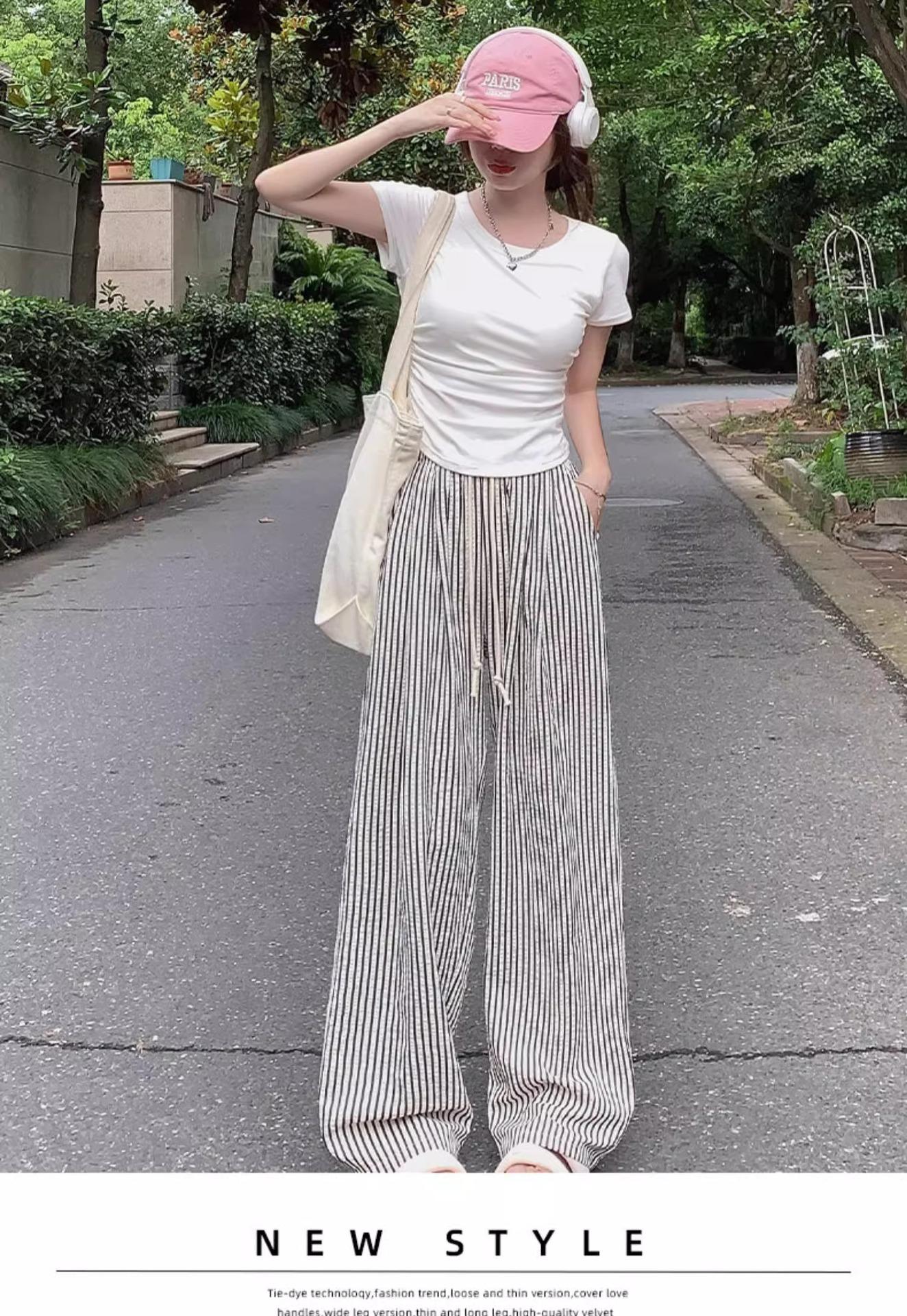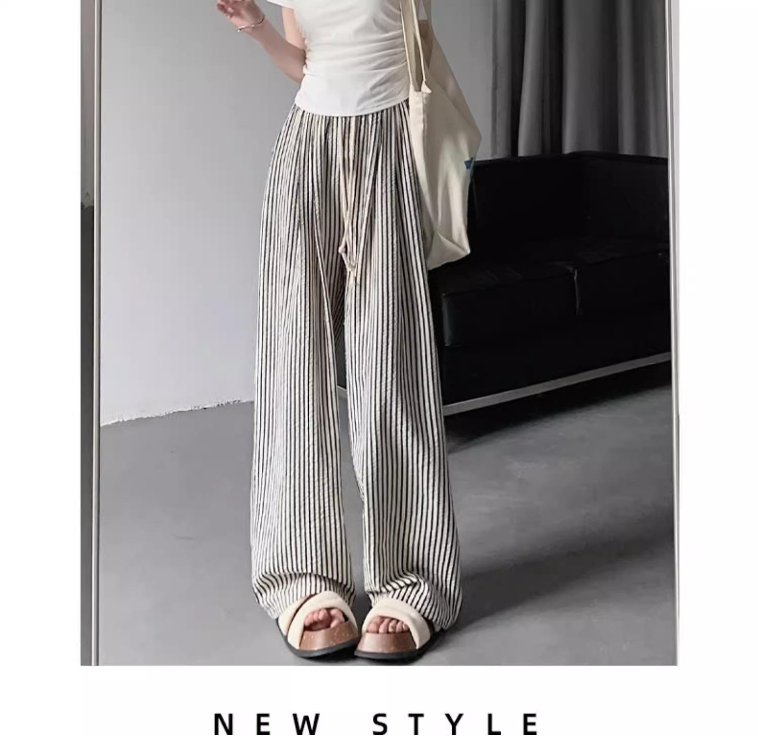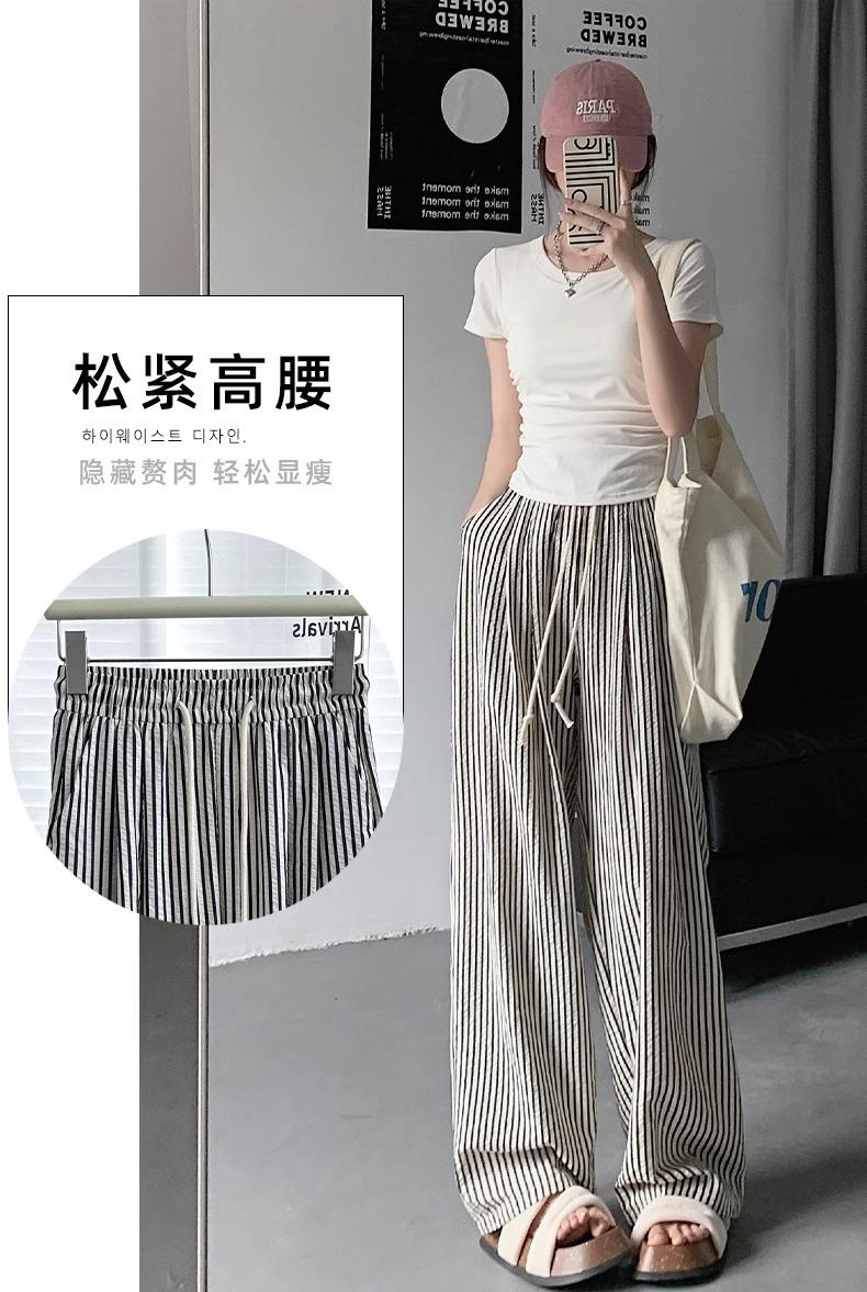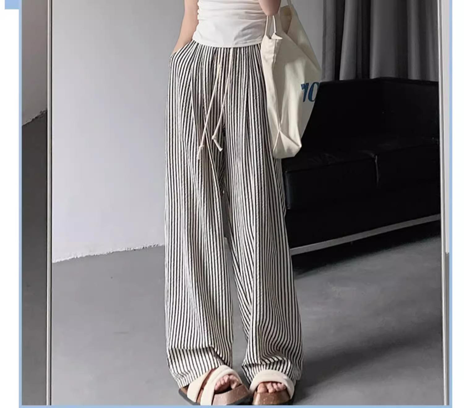 Pantalones casuales ajustados y pequeños para caminar, 145, nuevos pantalones anchos a rayas de cintura alta para mujer, verano 150, holgados y perezosos