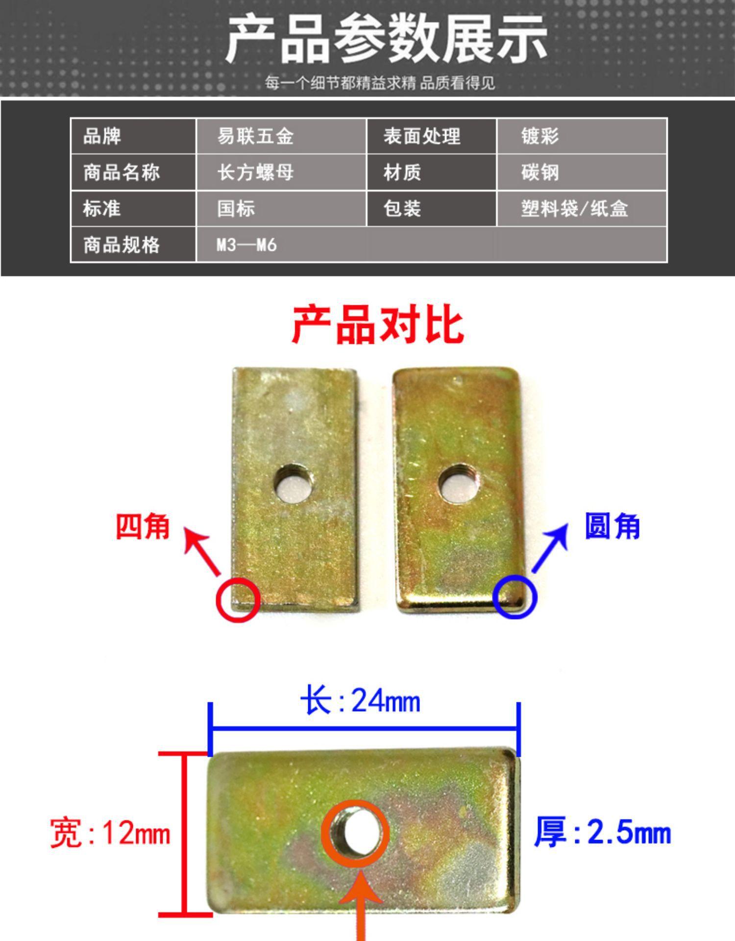 Bloque de tuerca rectangular m3m4, tuerca cuadrada de diferentes piezas, ranura para tarjeta, tuerca m5, junta de tuerca de hierro, tuerca cuadrada chapada en color m6