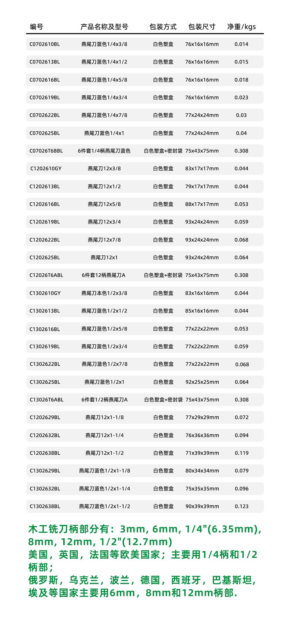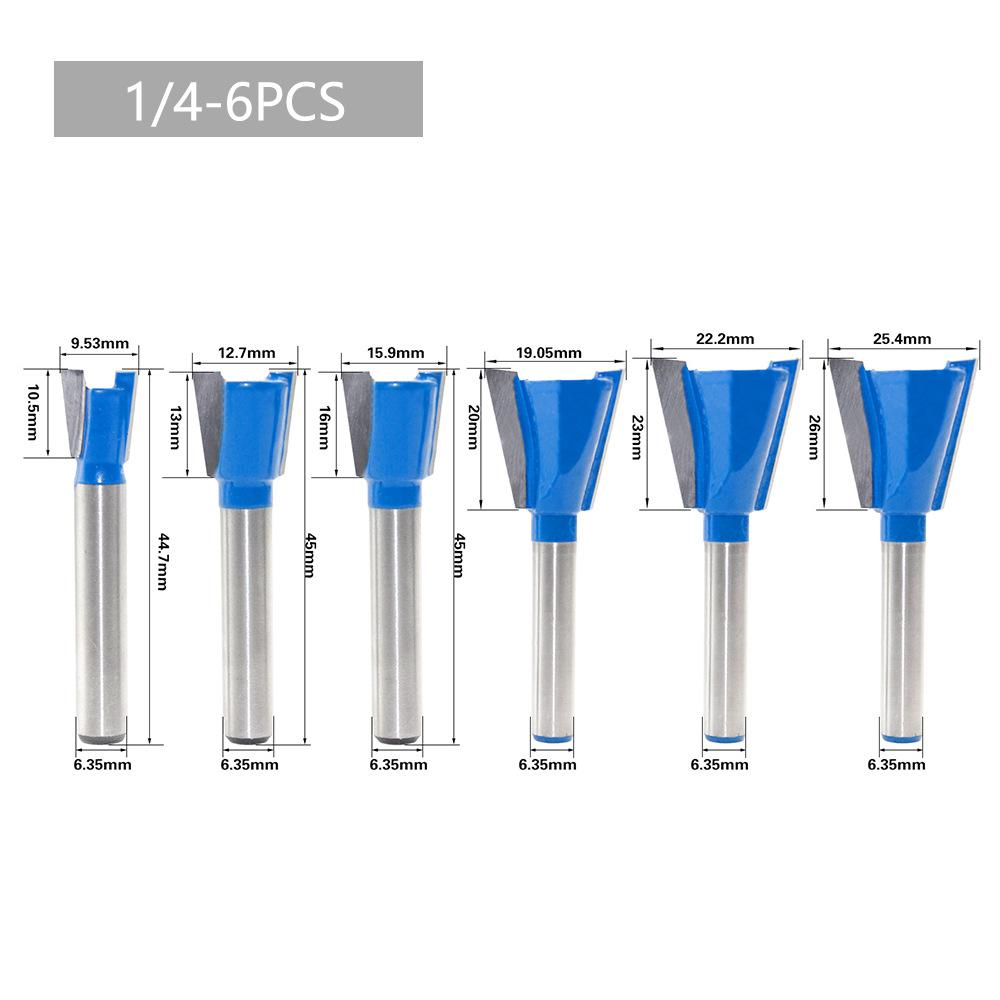 6-piece set 1/4 handle dovetail knife blue 3/8, 1/2, 5/8, 3/4, 7/8, 1