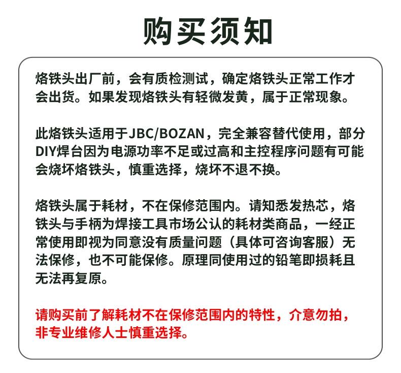 Debido a las necesidades de inspección, la punta del cabezal del soldador puede tener una pequeña cantidad de soldadura adherida. Este es un procedimiento de inspección estándar antes de enviar el cabezal del soldador. Este fenómeno no significa que el cabezal del soldador haya sido usado y no constituye un problema de calidad del producto. Si le molesta esto, por favor no compre. ¡Gracias por su comprensión!