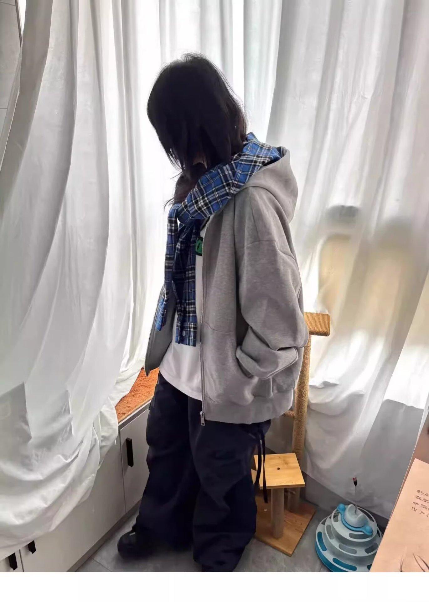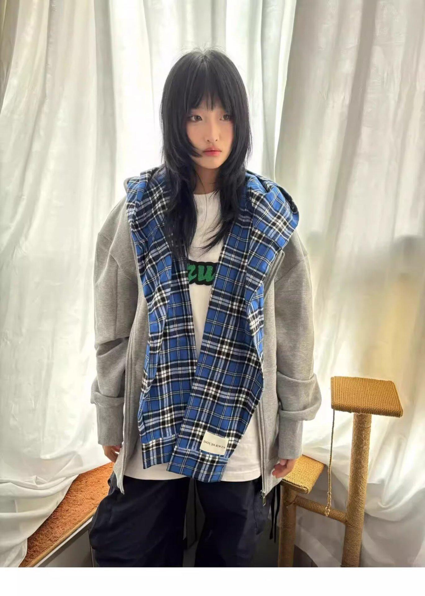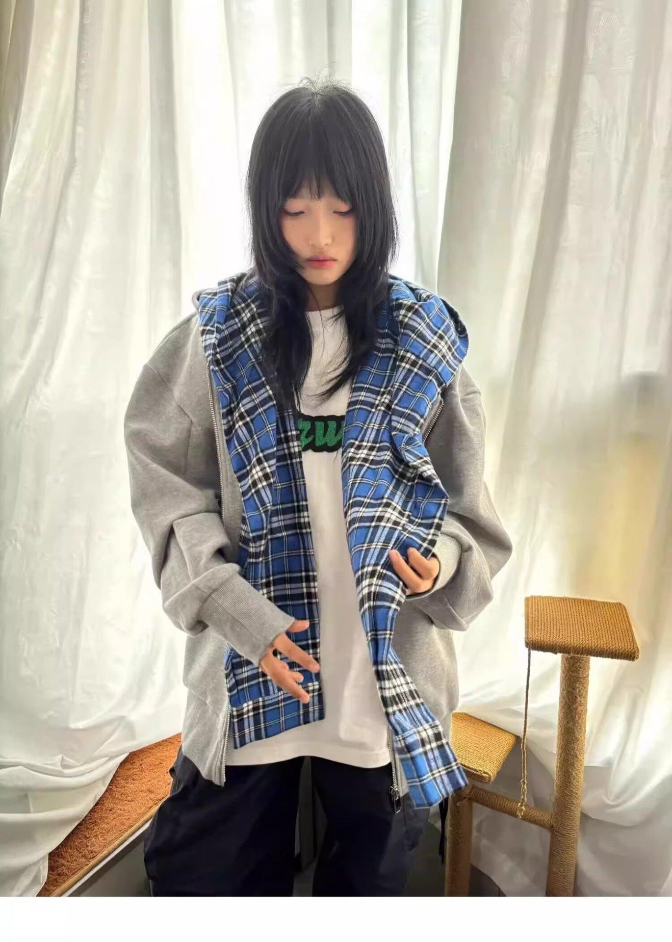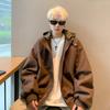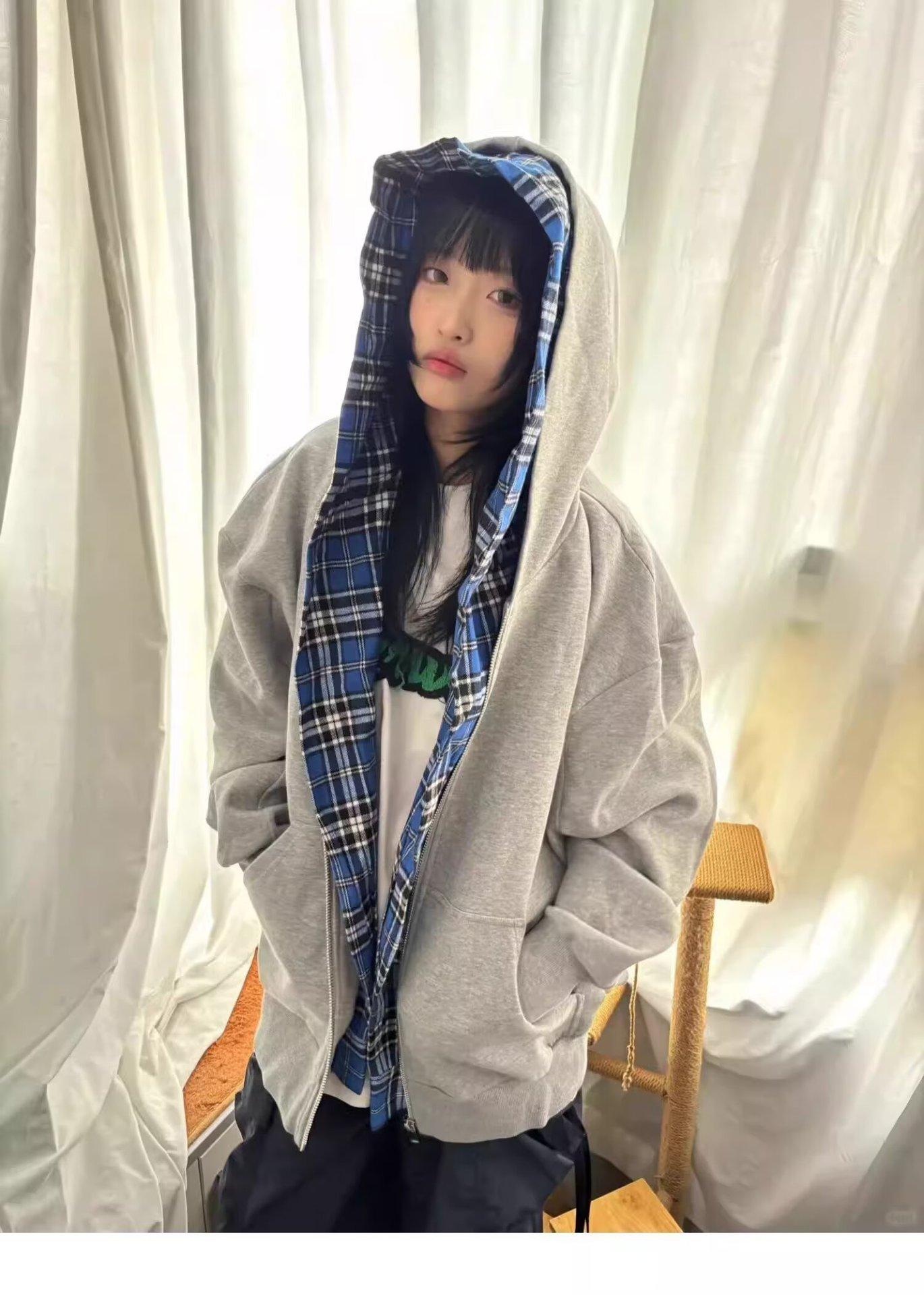 Chaqueta con capucha estilo americano retro para hombre y mujer, otoño e invierno, holgada, informal, de dos piezas, con estampado de cuadros y retazos