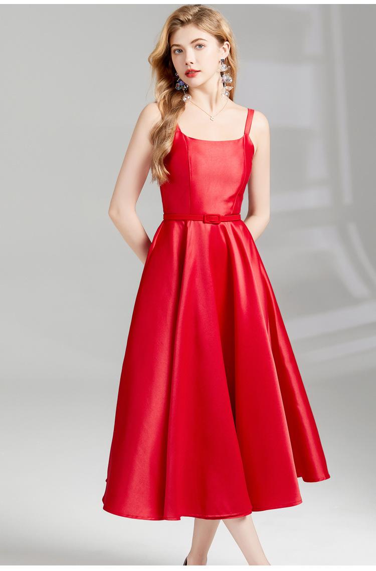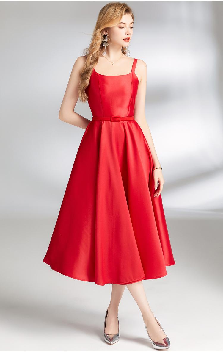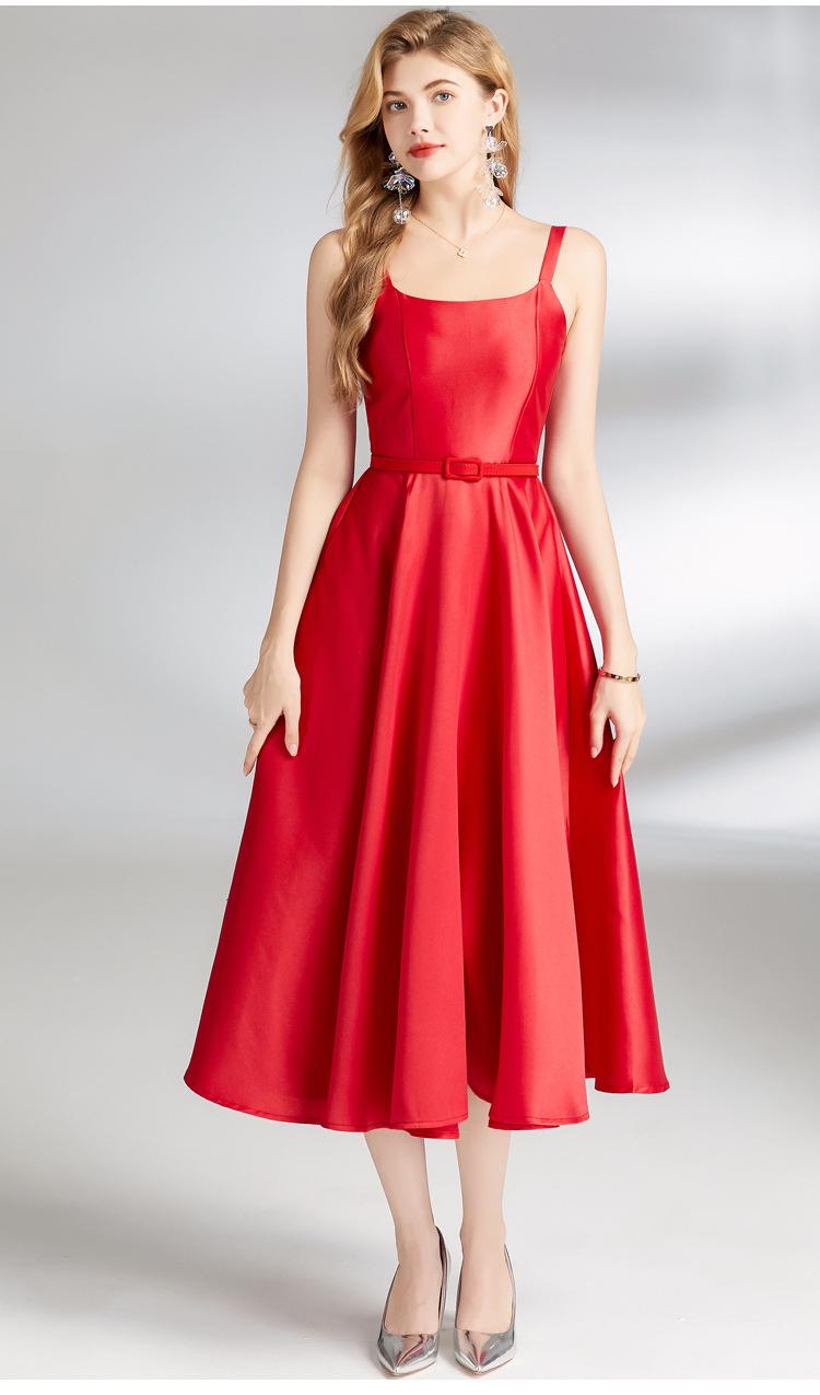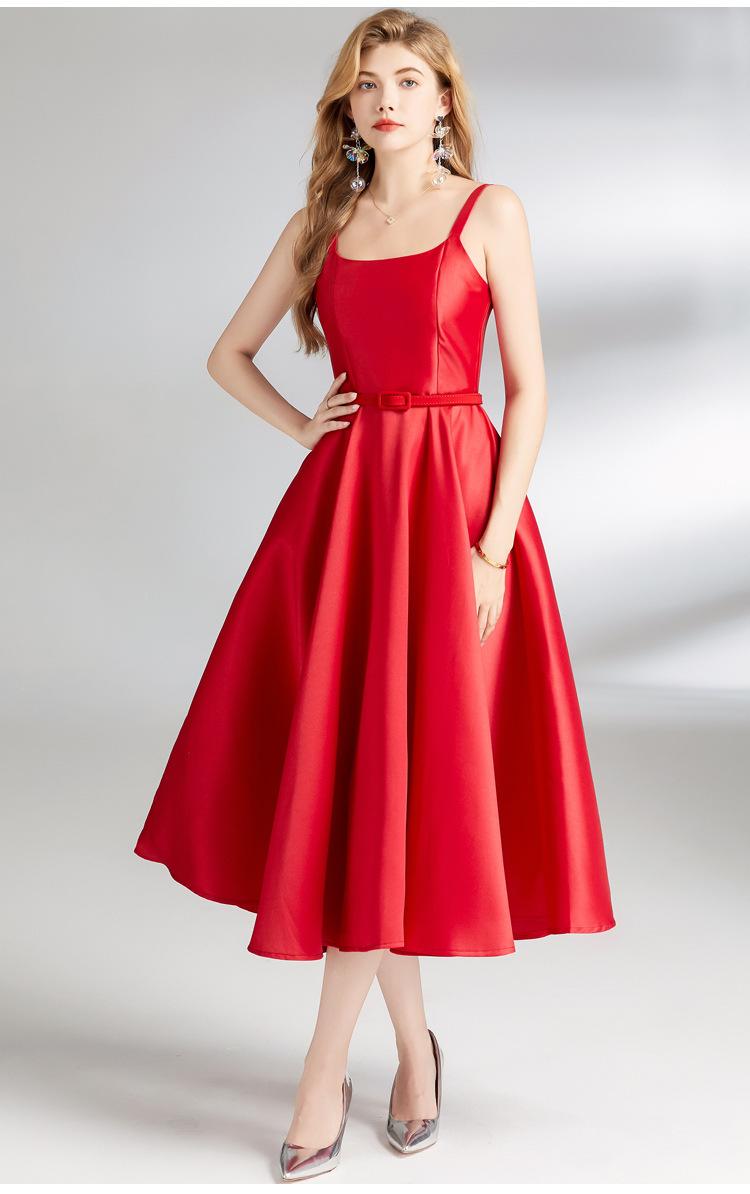 Vestido Rojo Estilo Hepburn de Moda Adelgazante de Cintura Vestido de Tirantes Nuevo para Mujer Ajustado con Cinturón