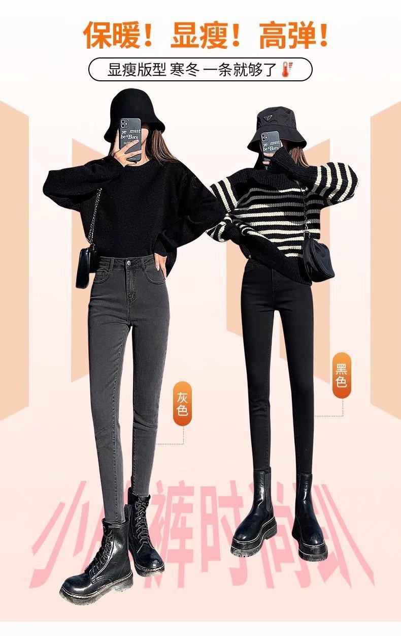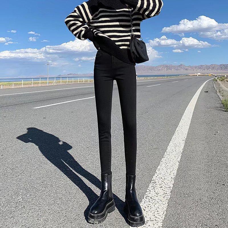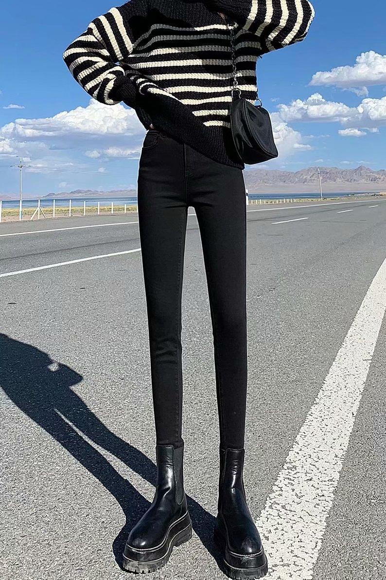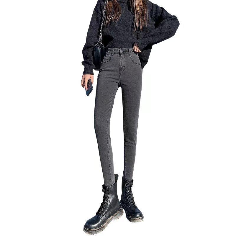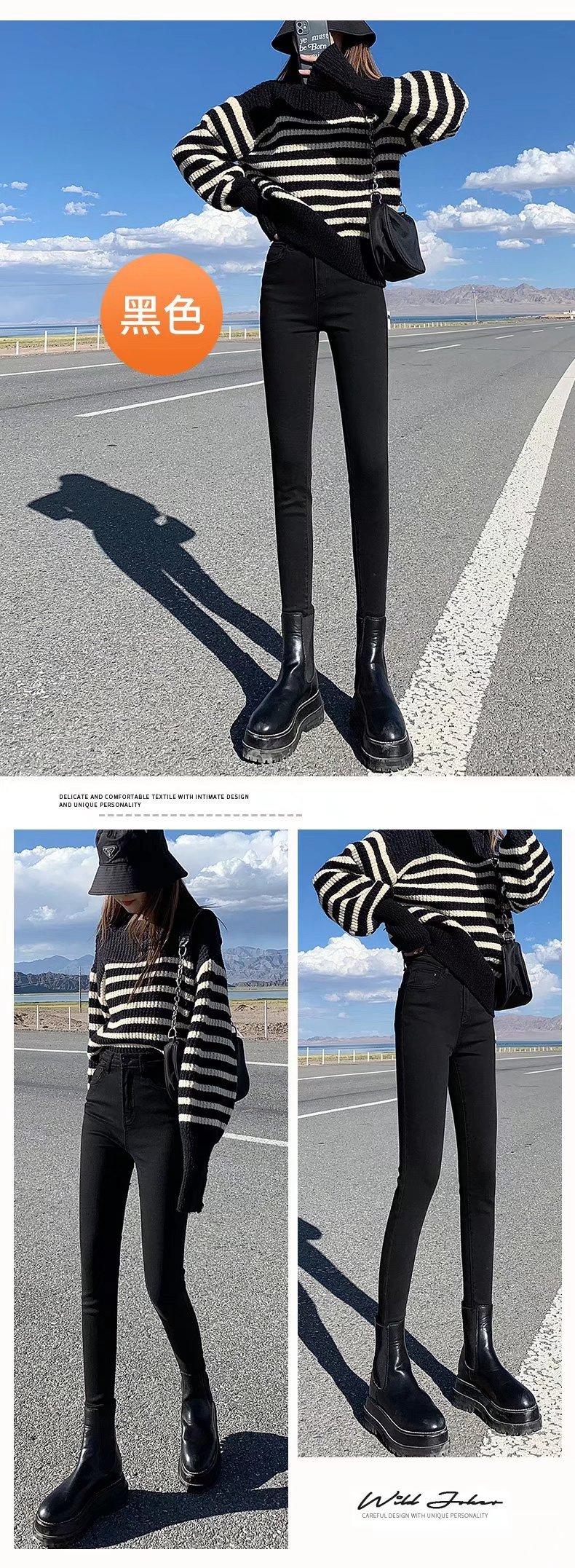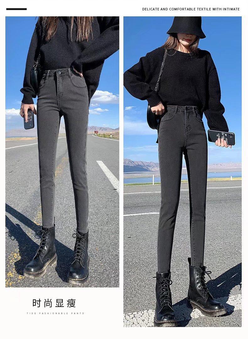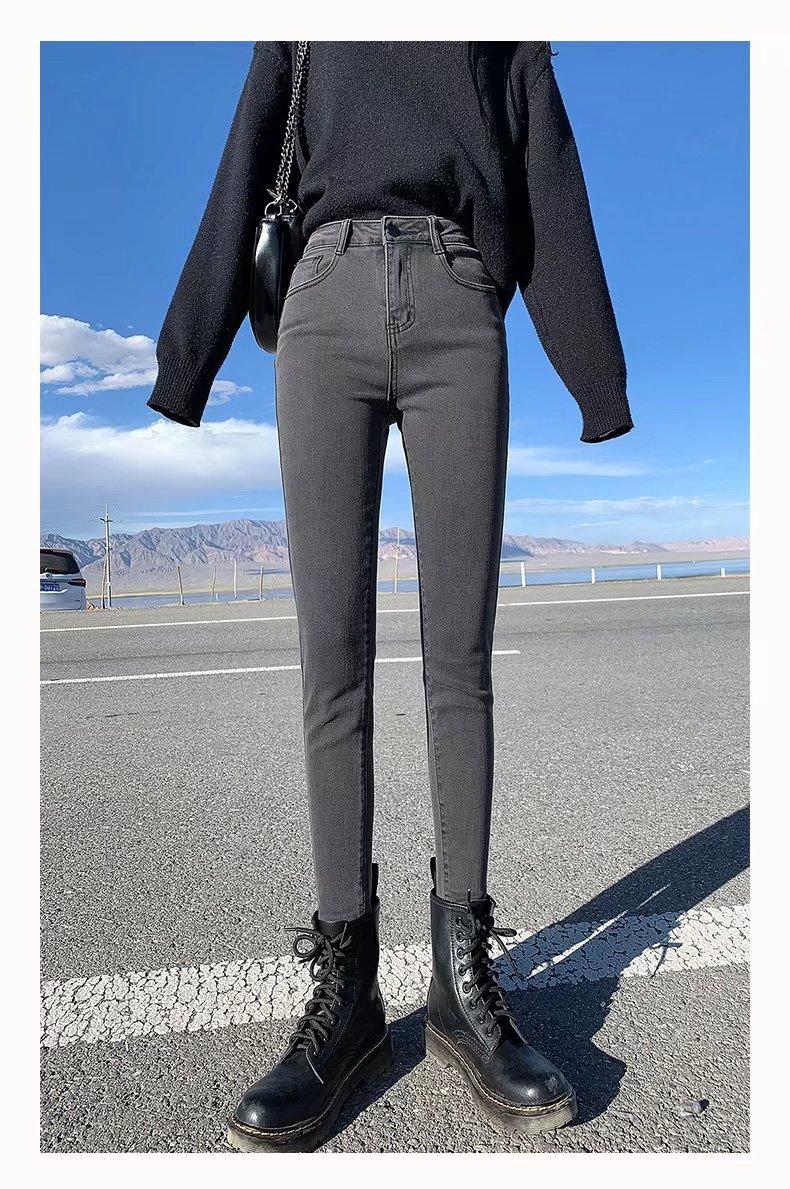 Calça jeans de cintura alta para mulheres 2023 outono novo emagrecimento preto slim fit apertado popular lápis calças com forro de lã