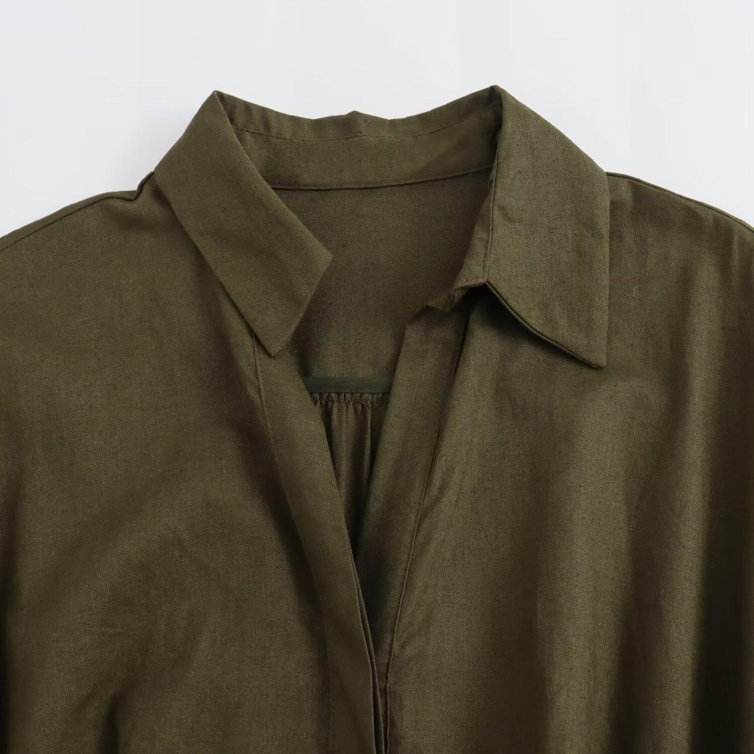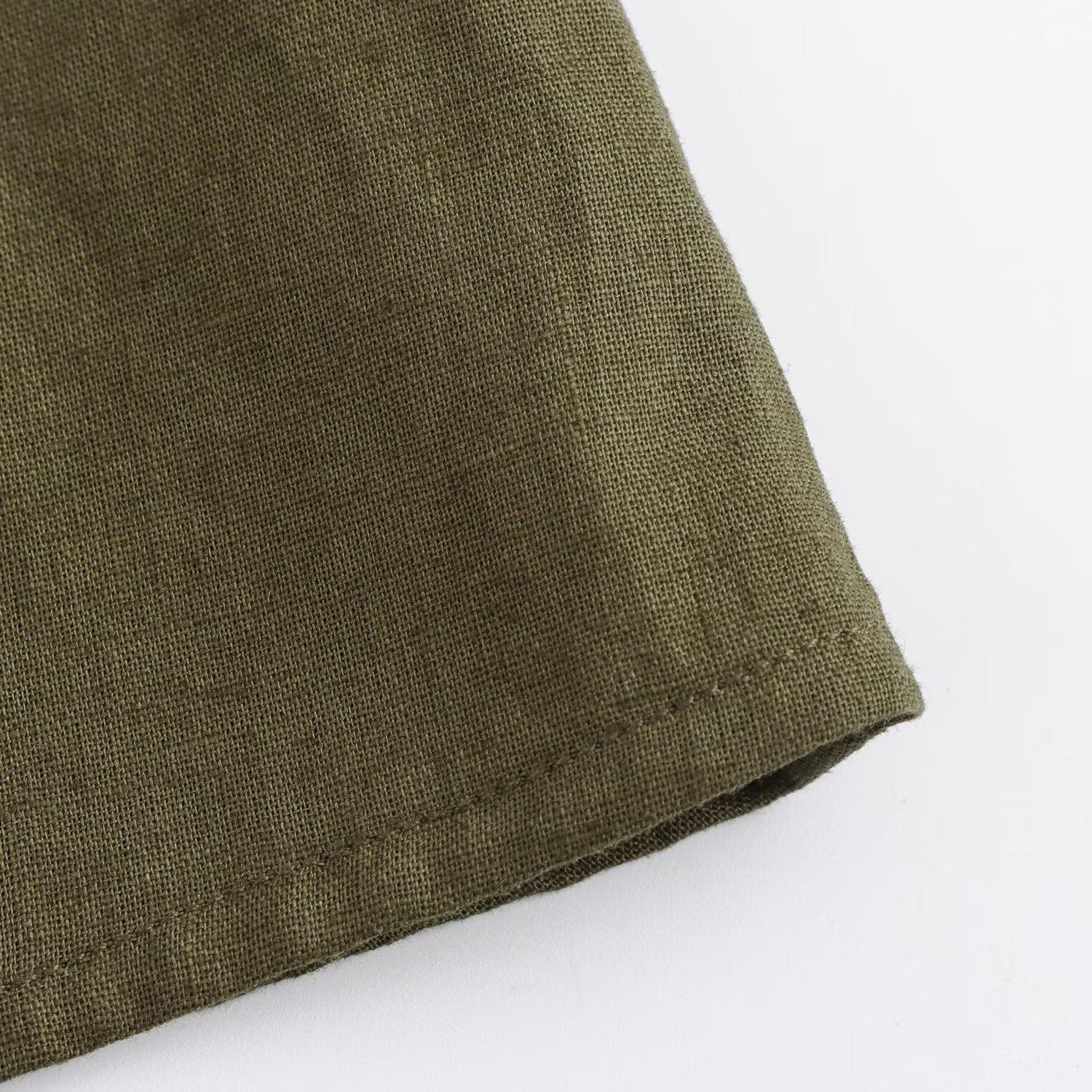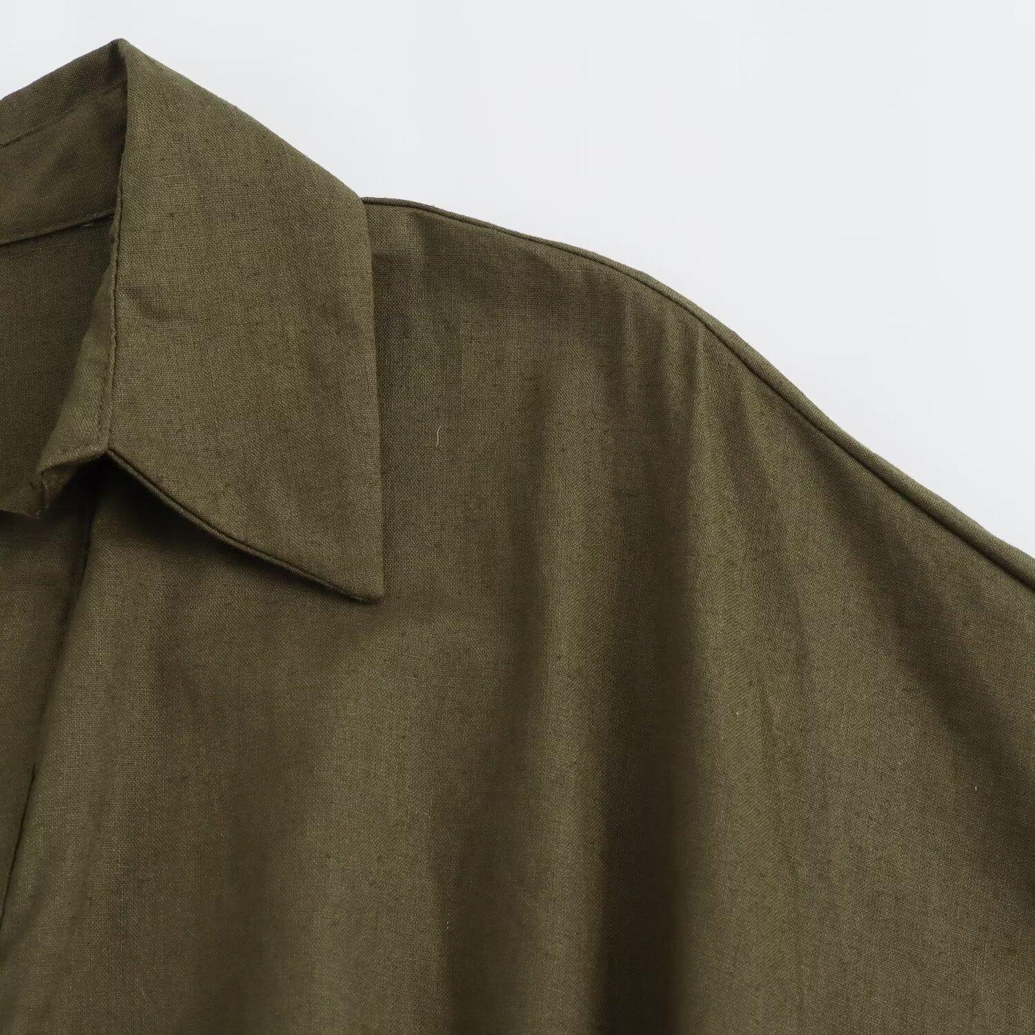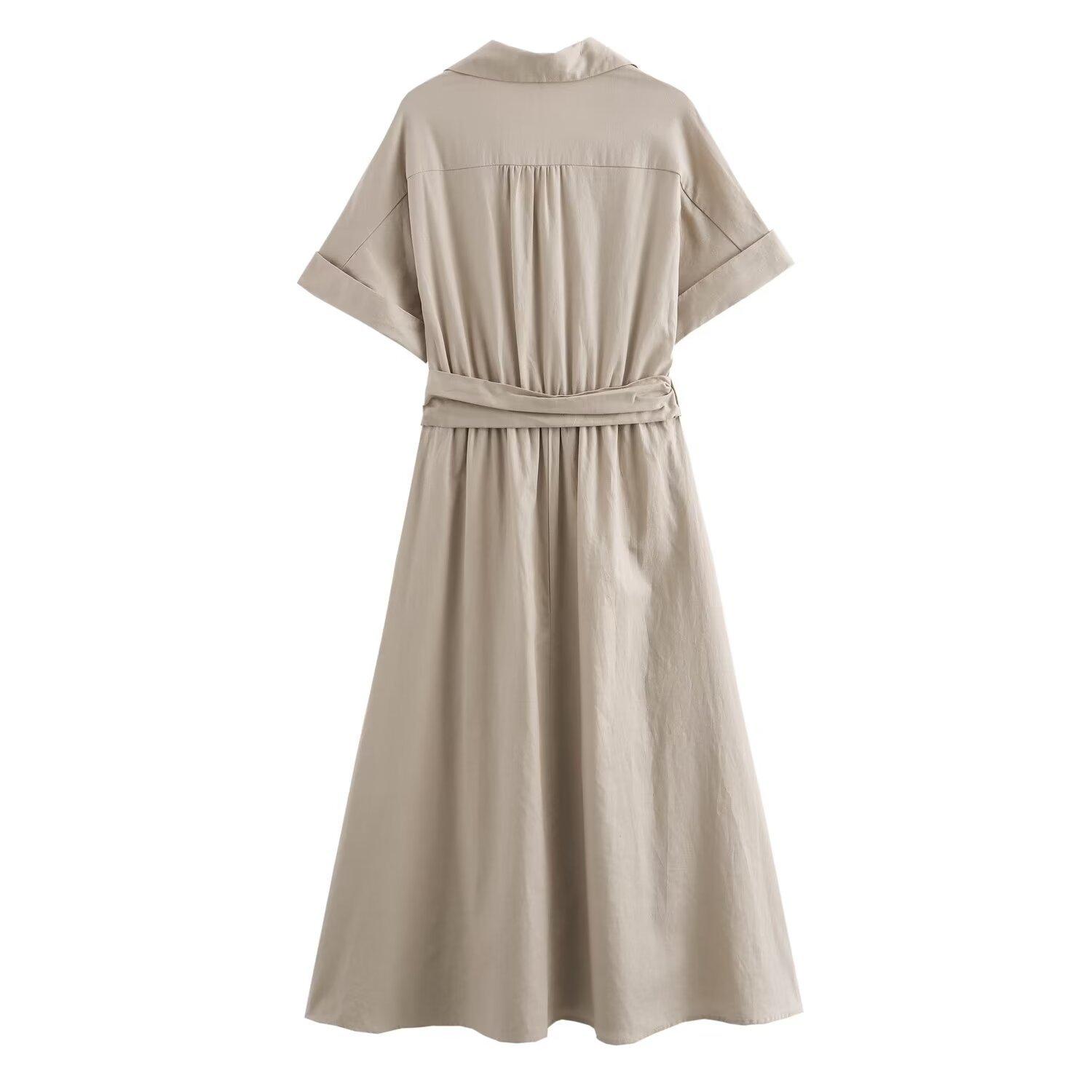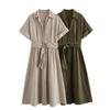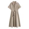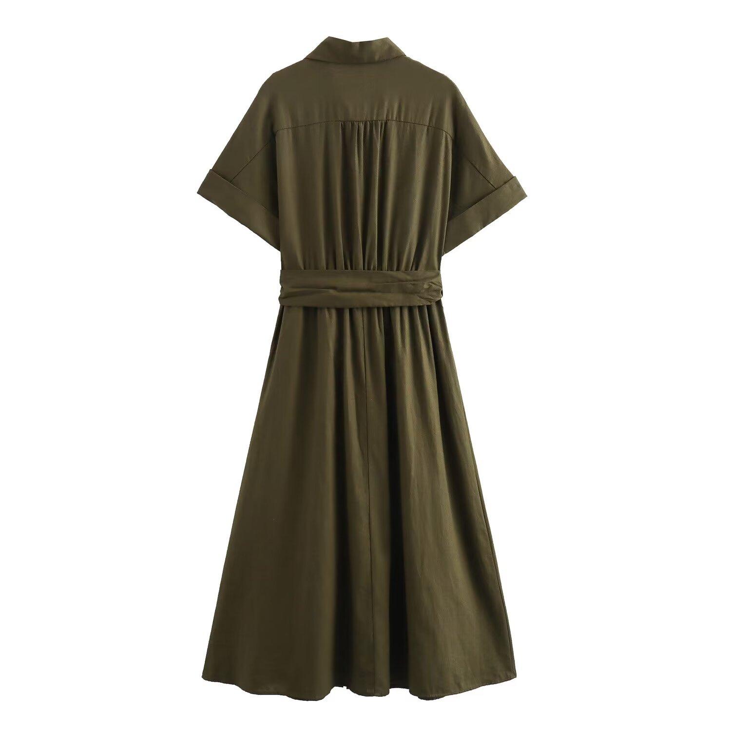 Vestido midi de lino mezclado con manga corta y color liso, novedad de verano 2024, falda con cinturón para mujer transfronteriza europea y americana.