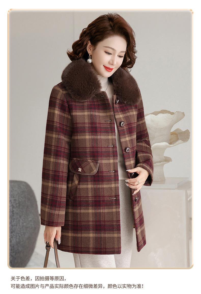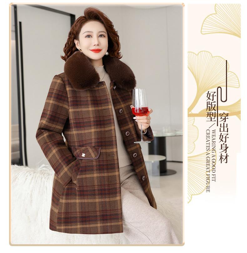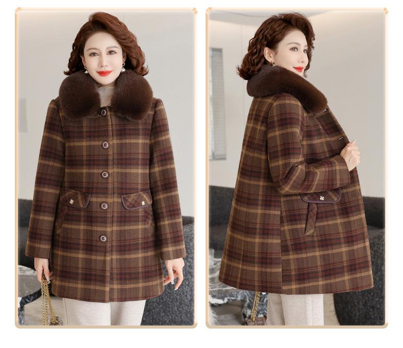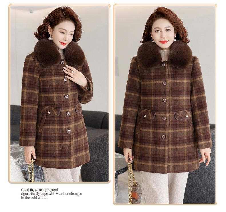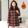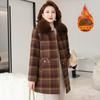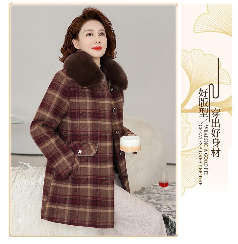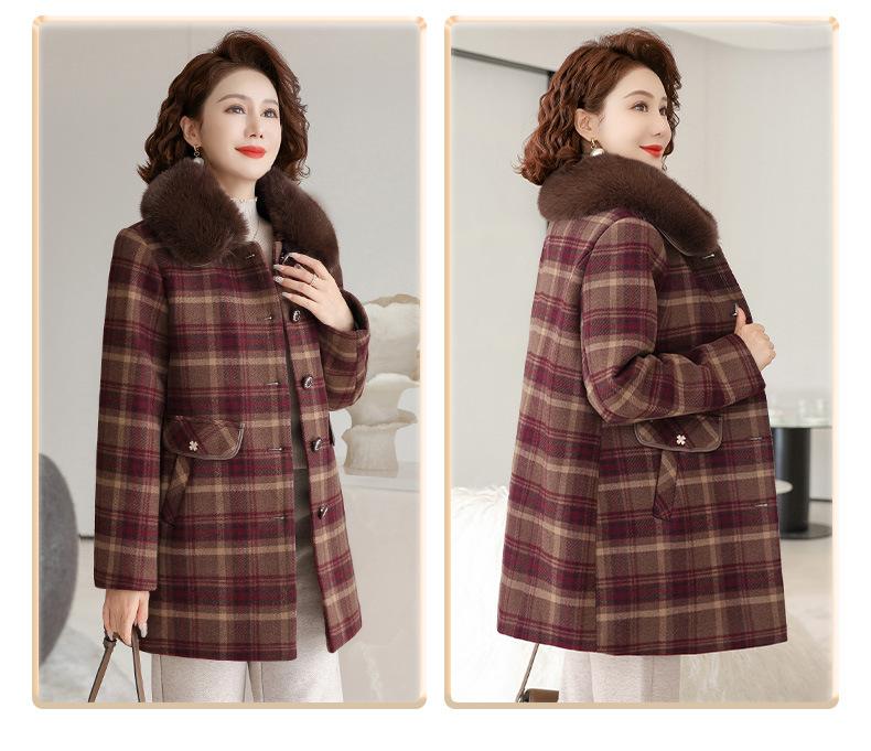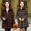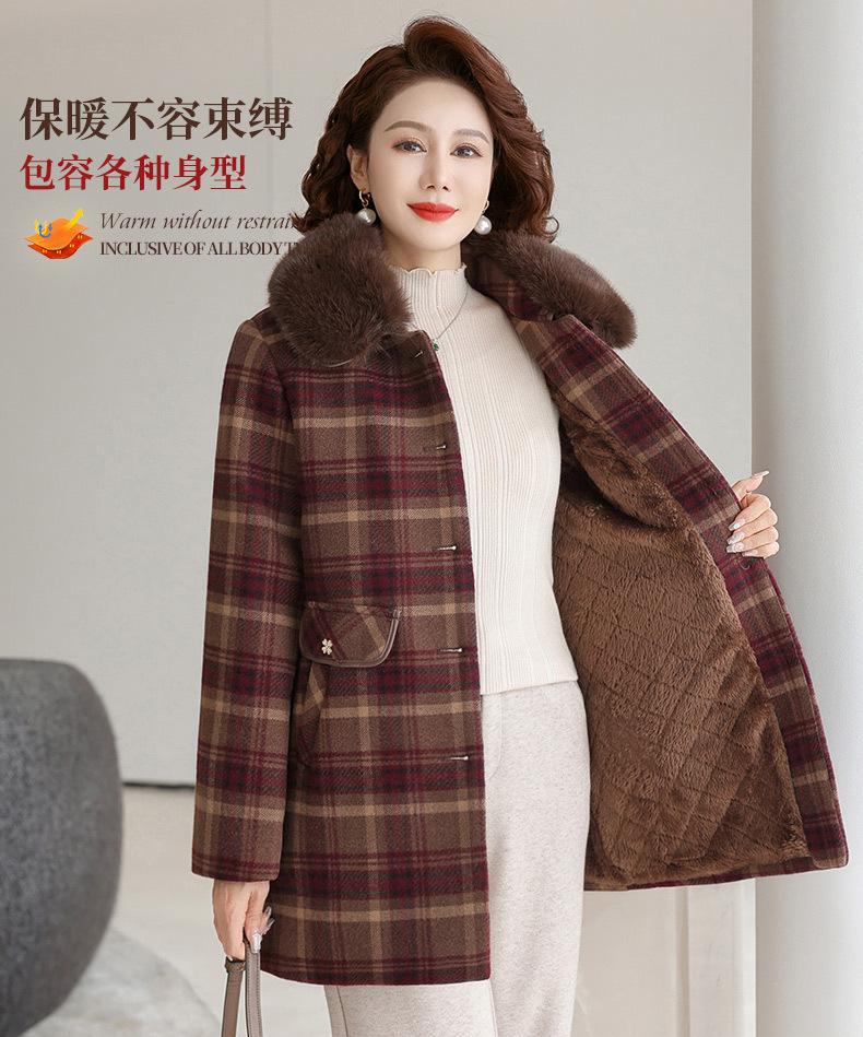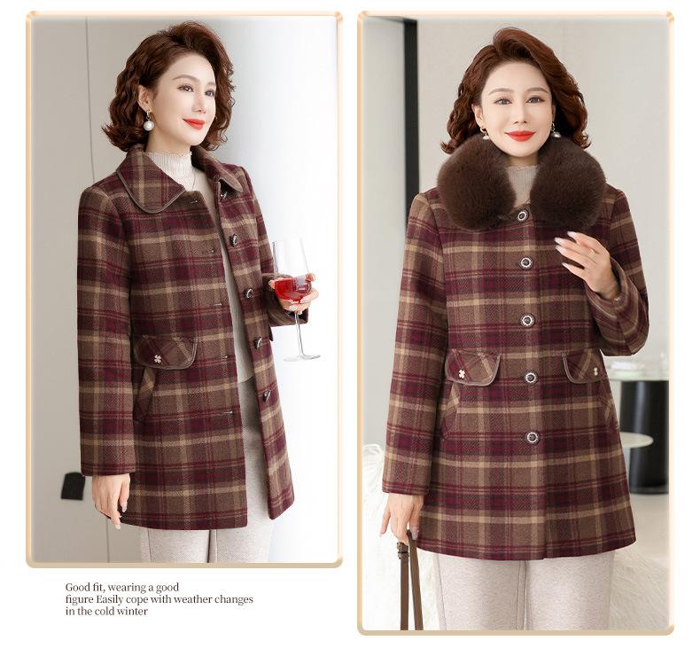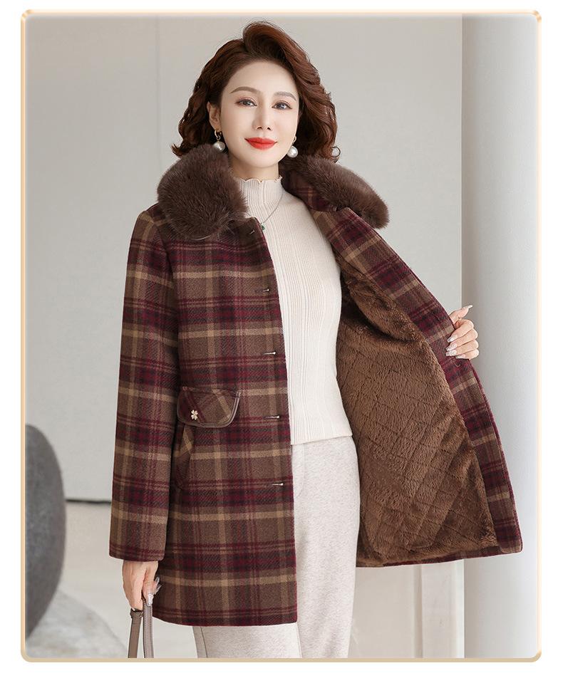 Abrigo de lana a cuadros grueso con forro polar de invierno para madres, abrigo de longitud media, abrigo de lana noble para mujeres de mediana edad y mayores para otoño e invierno.