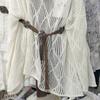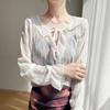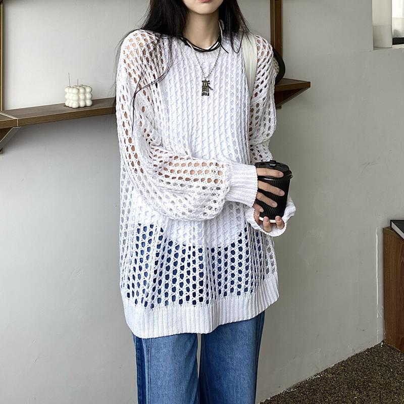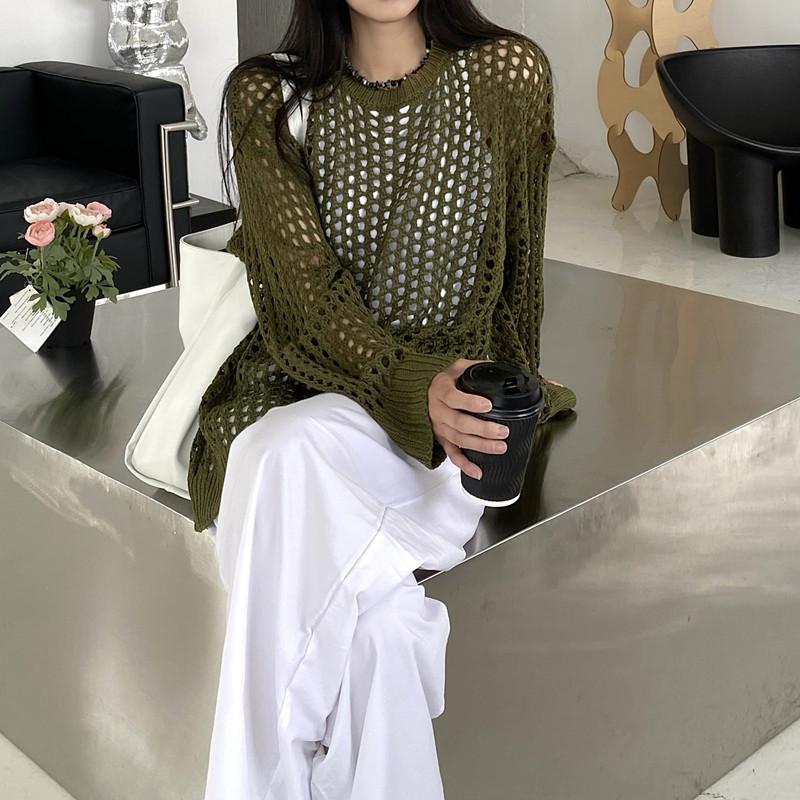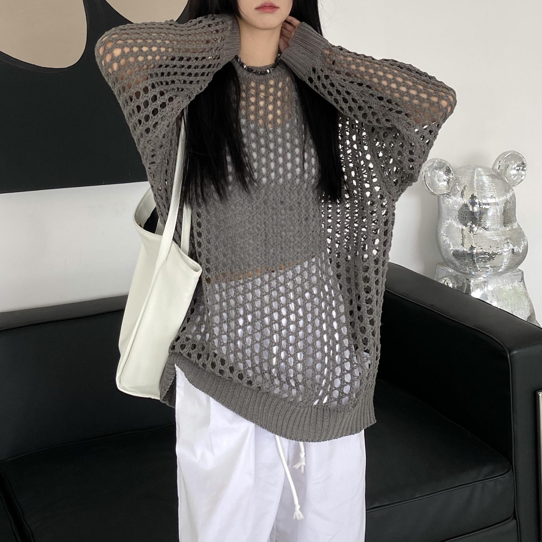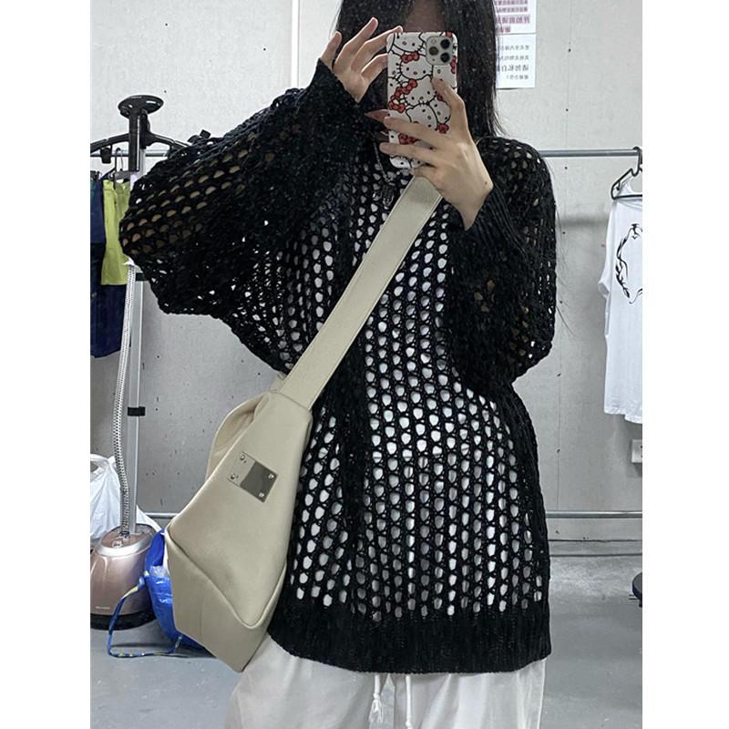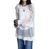 Blusa de manga larga drapeada única con diseño holgado y fino para mujer, de punto, con protección solar y aberturas.