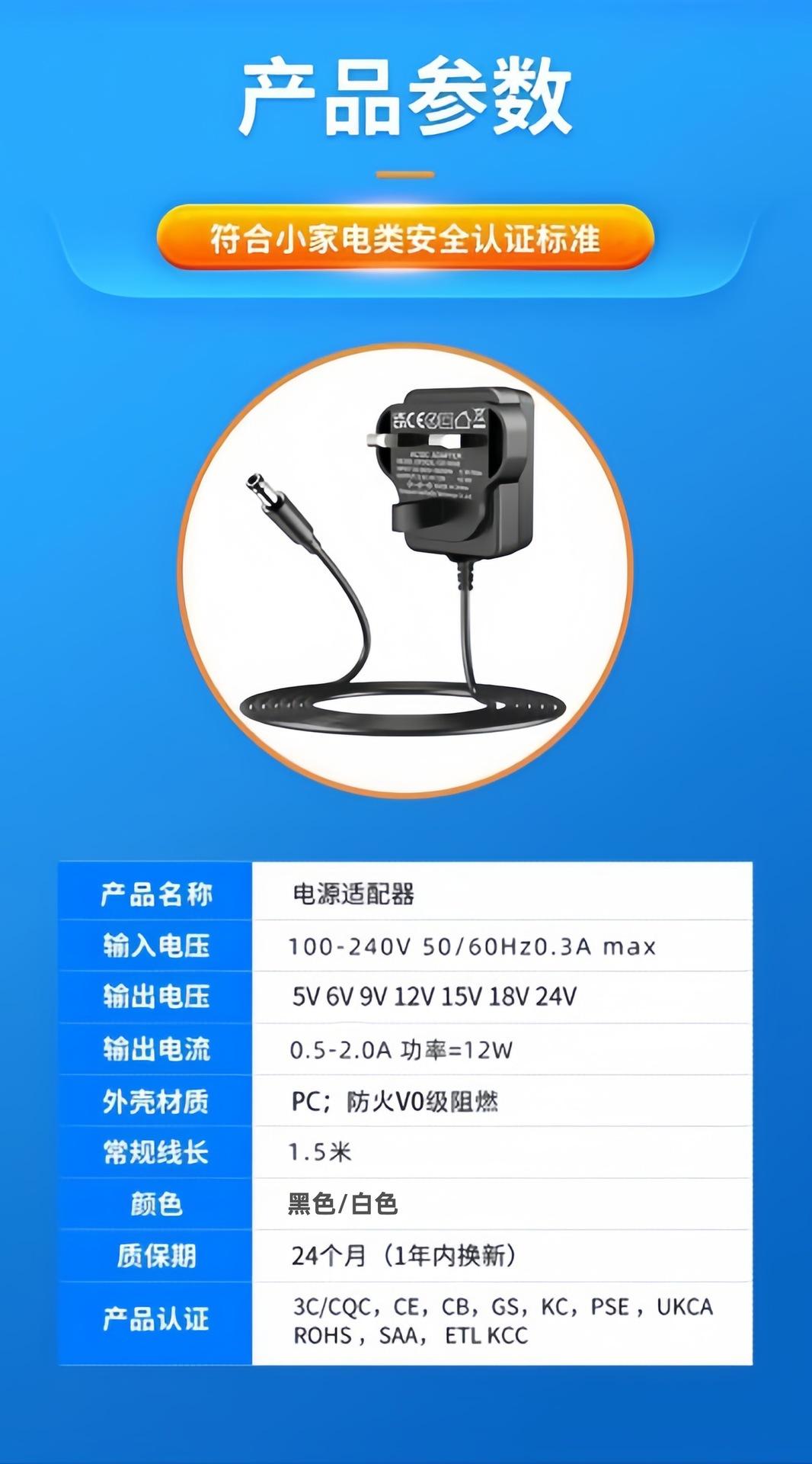12V1A, 9V1A, 5V2A, 24V0.5A, 6V2A