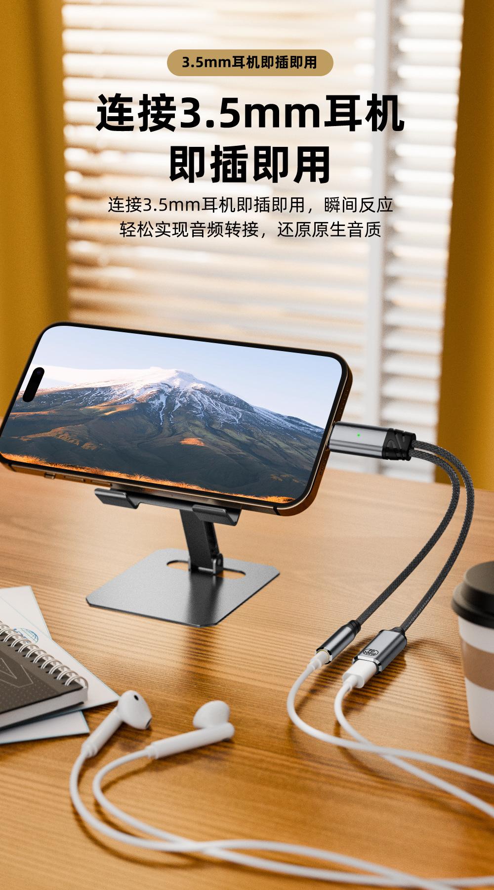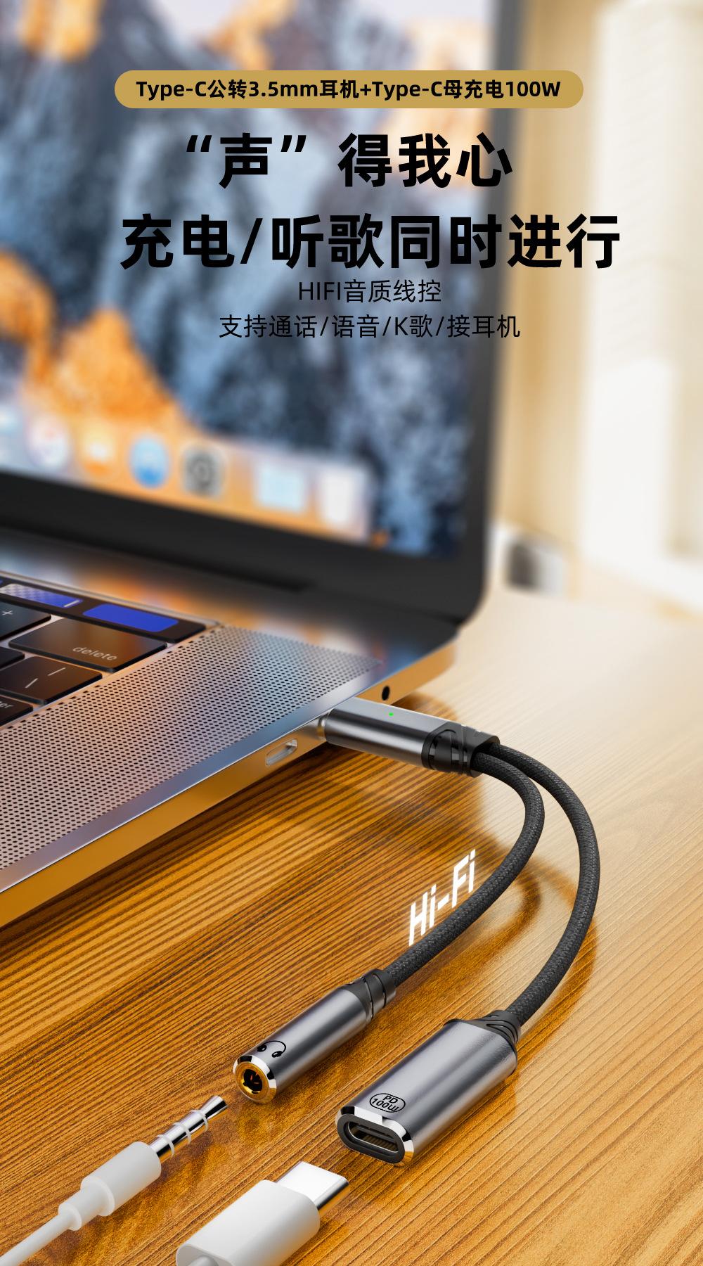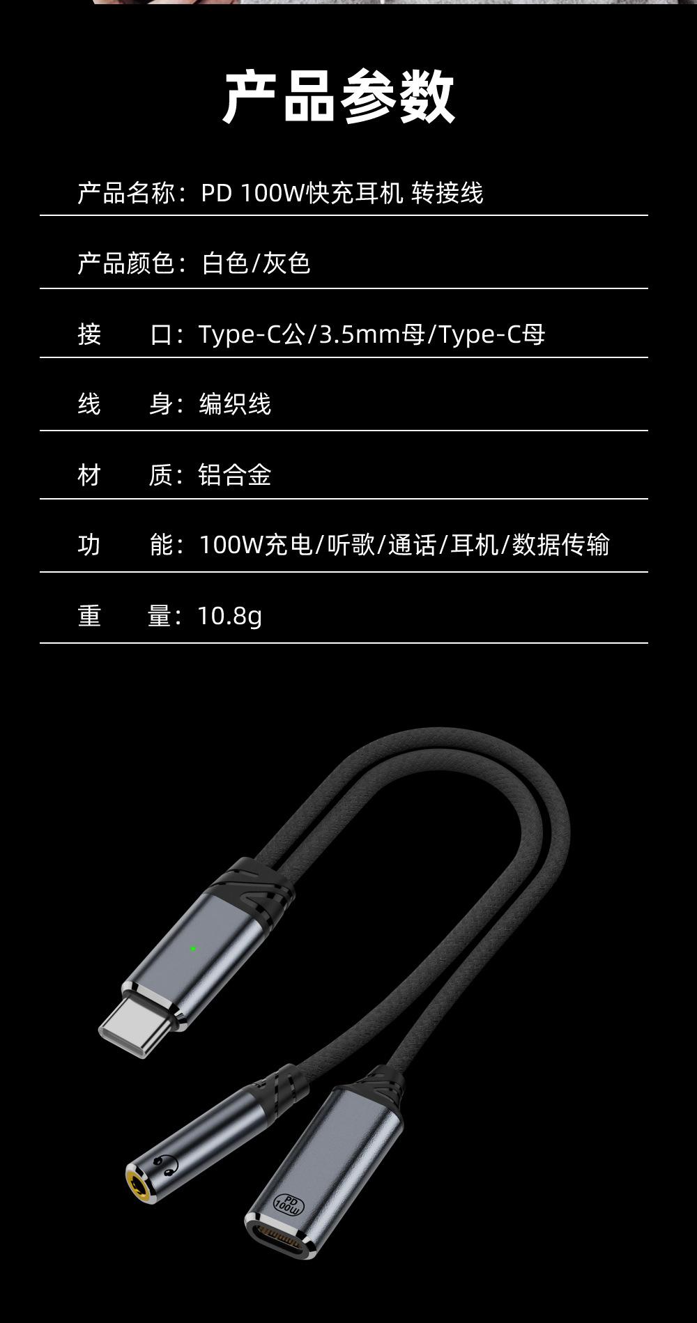 Type-c to 3.5mm headphones + type-c female pd charging 100w short cable gray