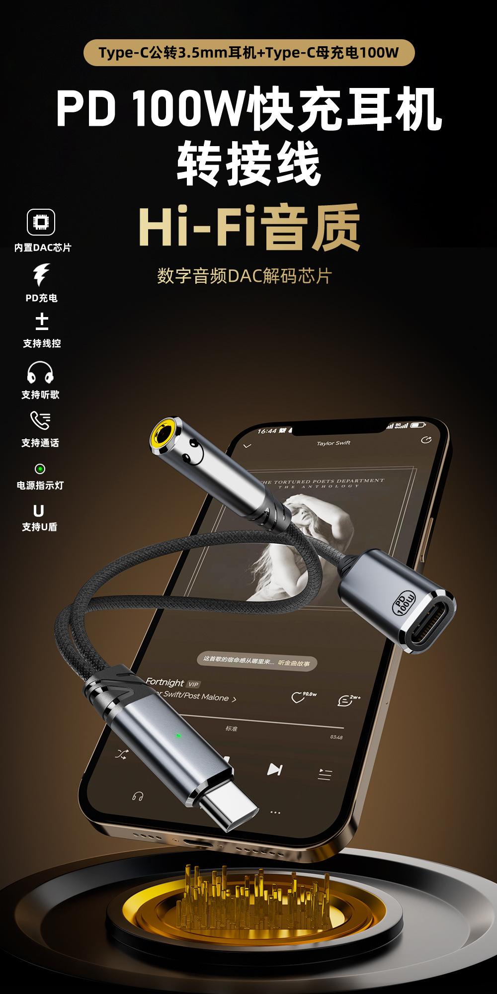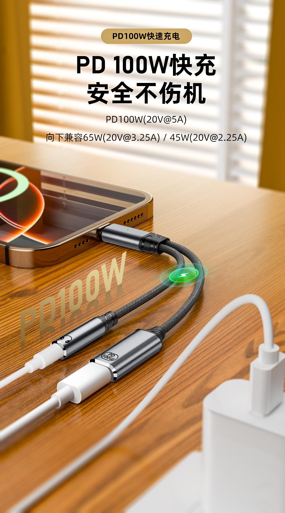 Adecuado para Apple 16 Adaptador de Auriculares Tipo C a 3.5mm Escuchar Canciones Carga de 100W Convertidor 2 en 1