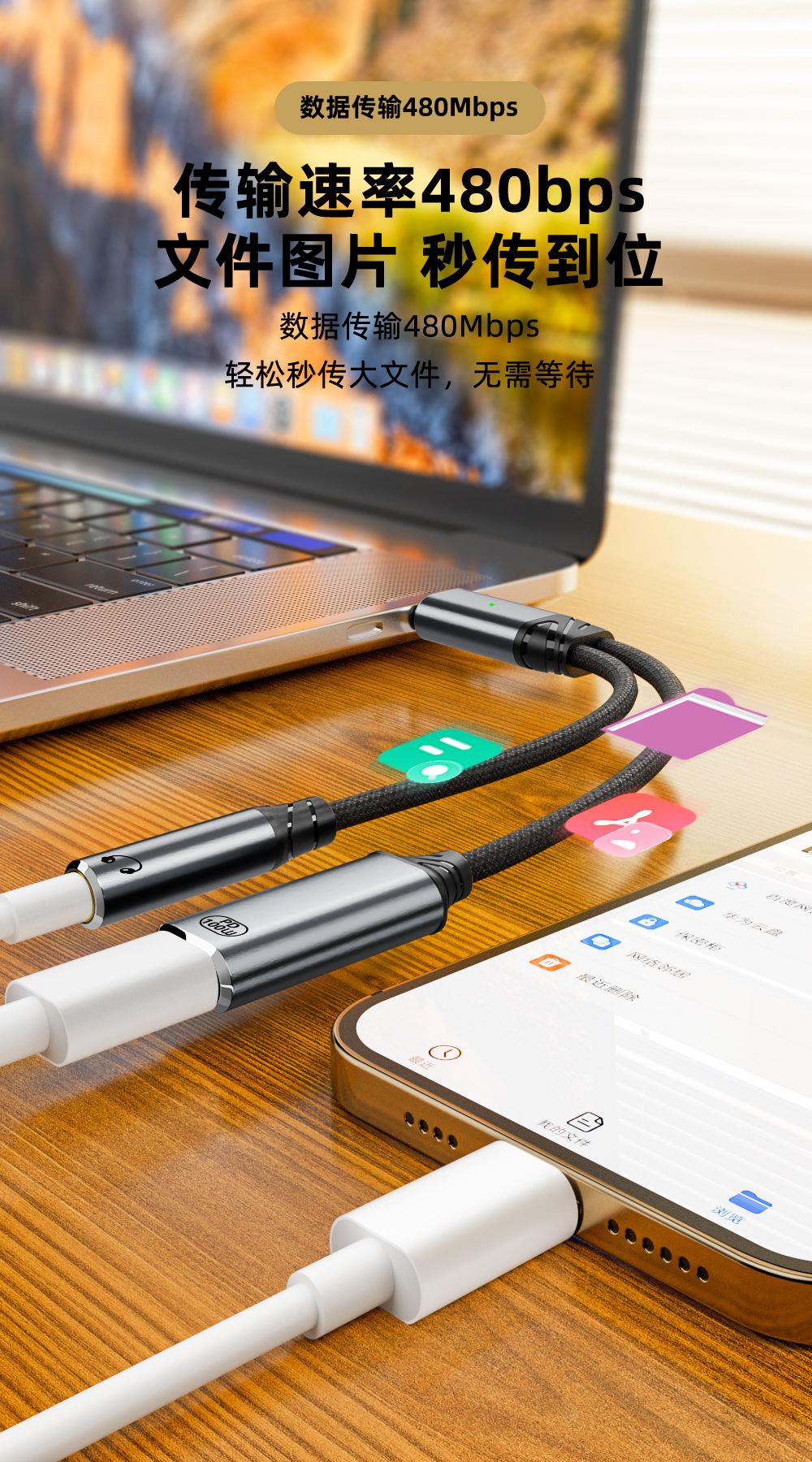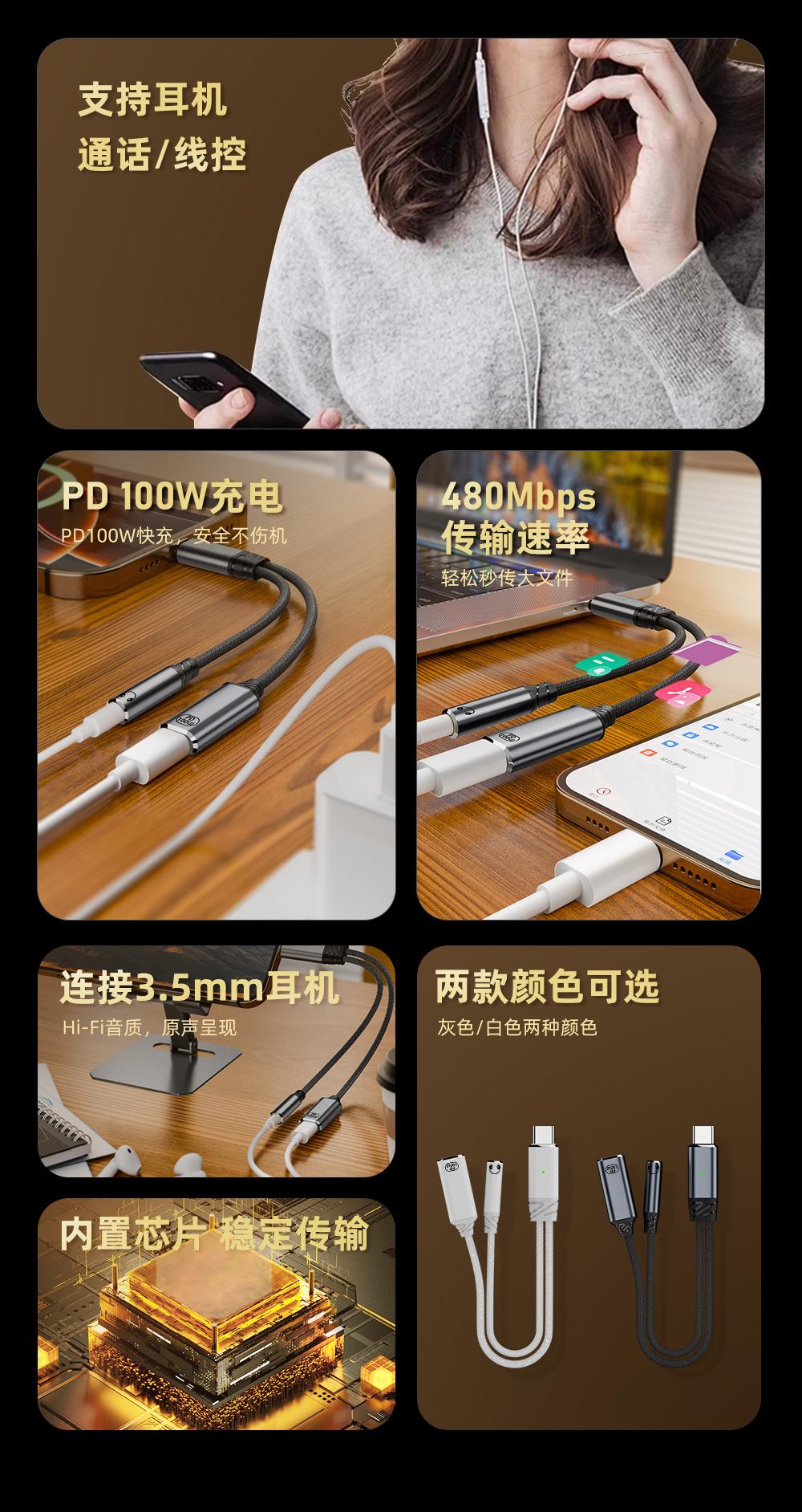Type-c to 3.5mm headphones + type-c female pd charging 100w short cable white